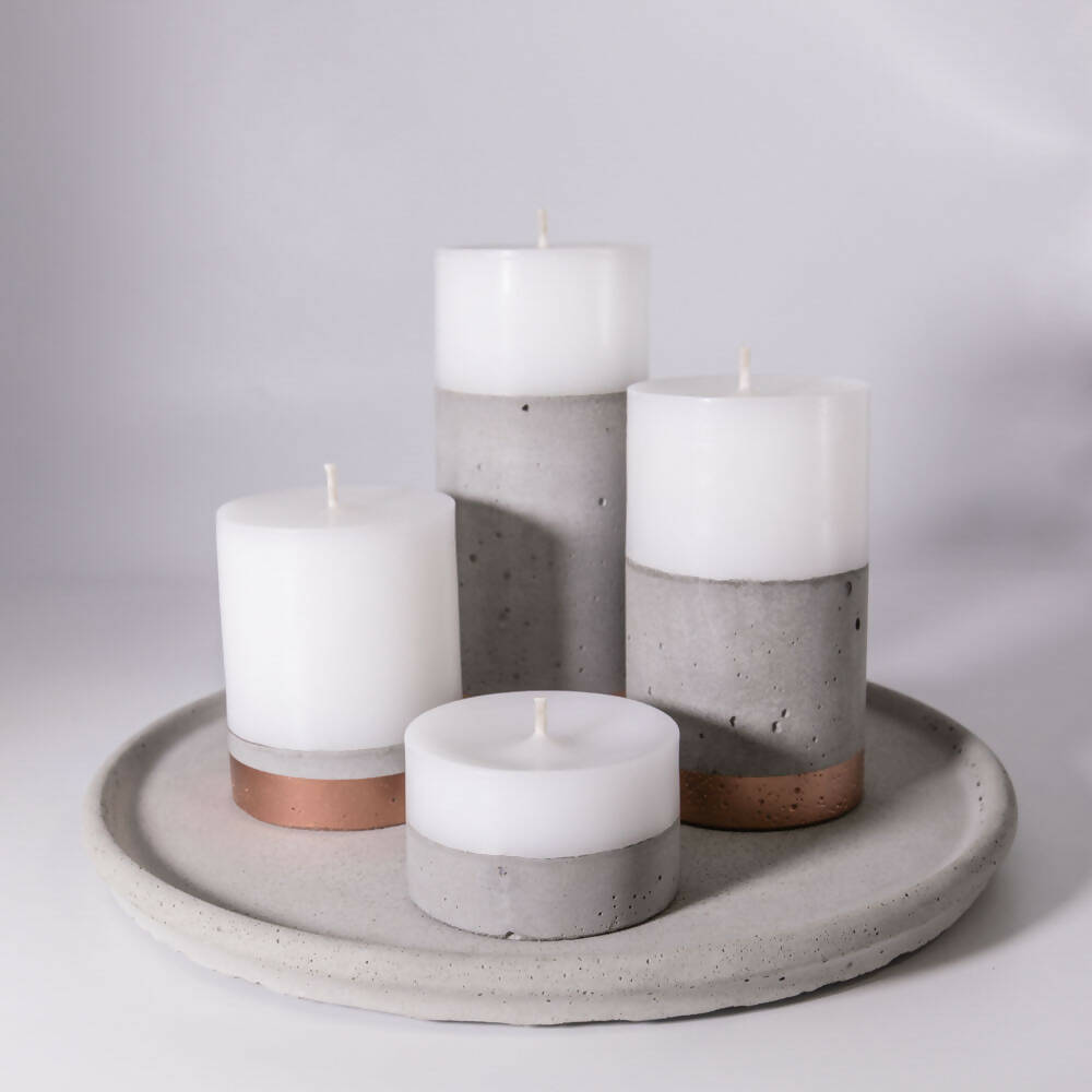 Conjunto de velas con base de Hormigón y línea cobre en bandeja de hormigón natural. Productos 100% hechos a mano en Chile, súper decorativos y de muy buena calidad, los fabricamos con los mejores materiales para lograrlo. Perfecto para hacer un lindo y original regalo, para la decoración de los diferentes espacios de tu hogar ( jardín, terraza, mesa de centro, arrimo, etc...), o para lograr un momento acogedor con la rica luz de las velas.