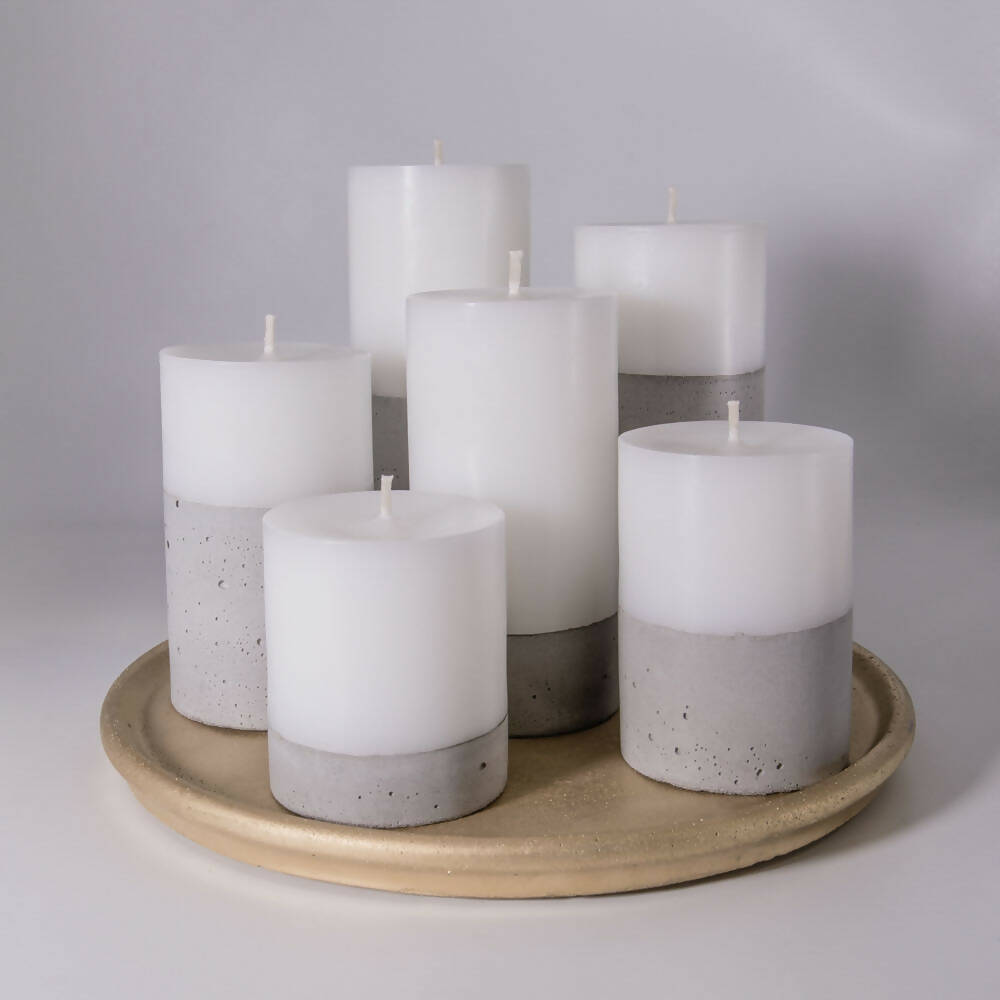 Conjunto de velas con base de hormigón natural sobre bandeja de hormigón color dorado.