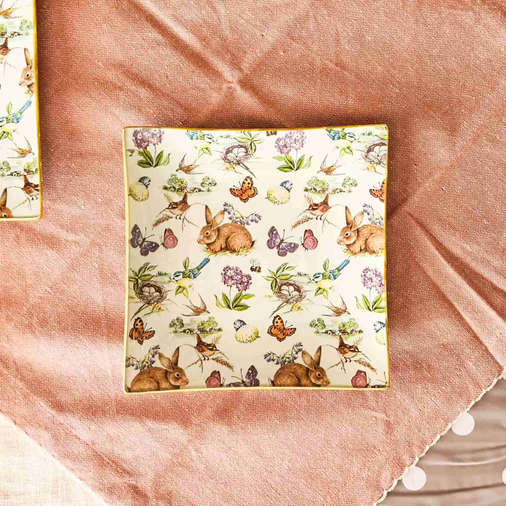 Plato cuadrado de vidrio templado de 16 cm, con tratamiento artesanal de decoupage. Apto para el lavado a mano y para el uso de comidas o elementos calientes sobre la superficie.