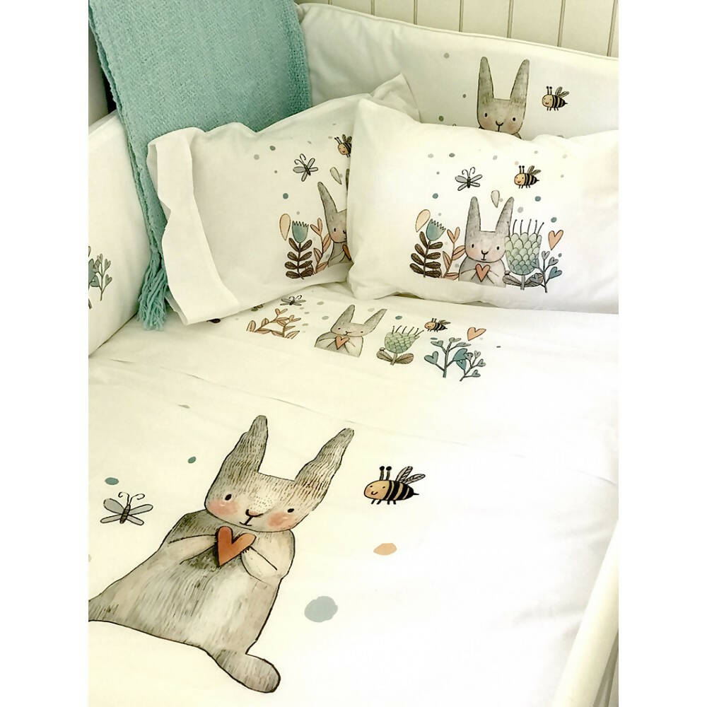 Tu bebé podrá tener los más lindos sueños con este cubreplumón hipoalergénico, 100% algodón. Además podrás encontrar el juego de sábanas del mismo diseño Su delicado estampado harán que su dormitorio sea un lugar placentero y precioso.