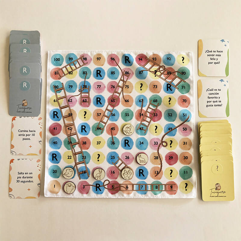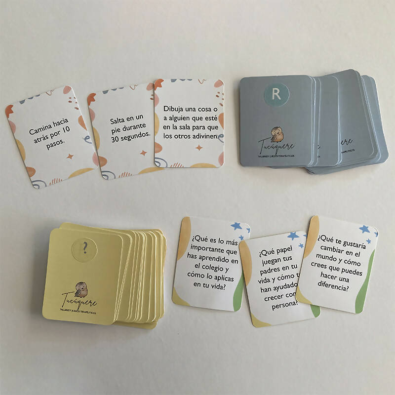 En Tucúquere incorporamos cartas con retos y preguntas de conocimiento personal que hace que sea una experiencia de conocimiento y desarrollo de habilidades socioemocionales tanto para jugar en familia, con amigos y espacios terapéuticos o educativos. Sólo te falta jugarlo.