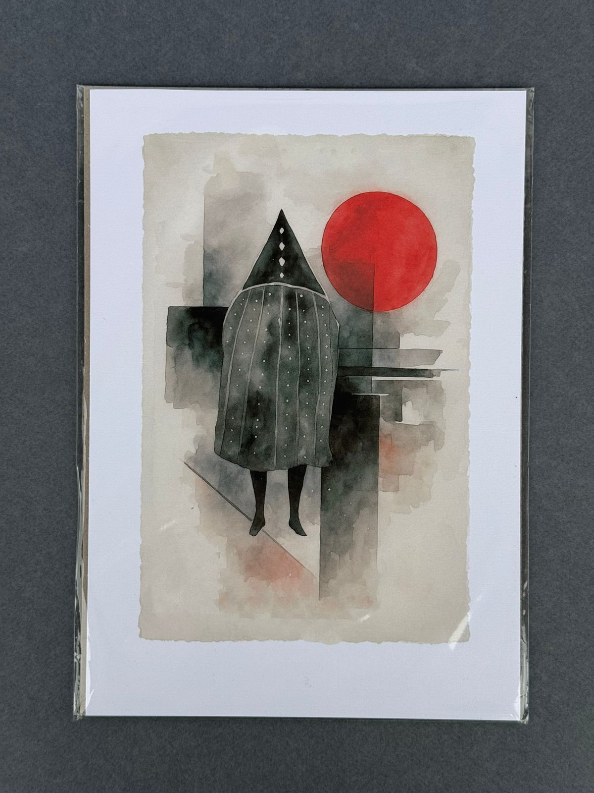 Esta ilustración evoca a uno de los seres míticos del pueblo Selk’nam, representado con su vestimenta ritual: túnica oscura punteada de estrellas y gorro cónico. Formaban parte de la ceremonia del Hain, donde el mundo espiritual y el humano se entrelazaban para transmitir enseñanzas ancestrales. El círculo rojo refuerza la conexión con el universo, el sol y lo sagrado.