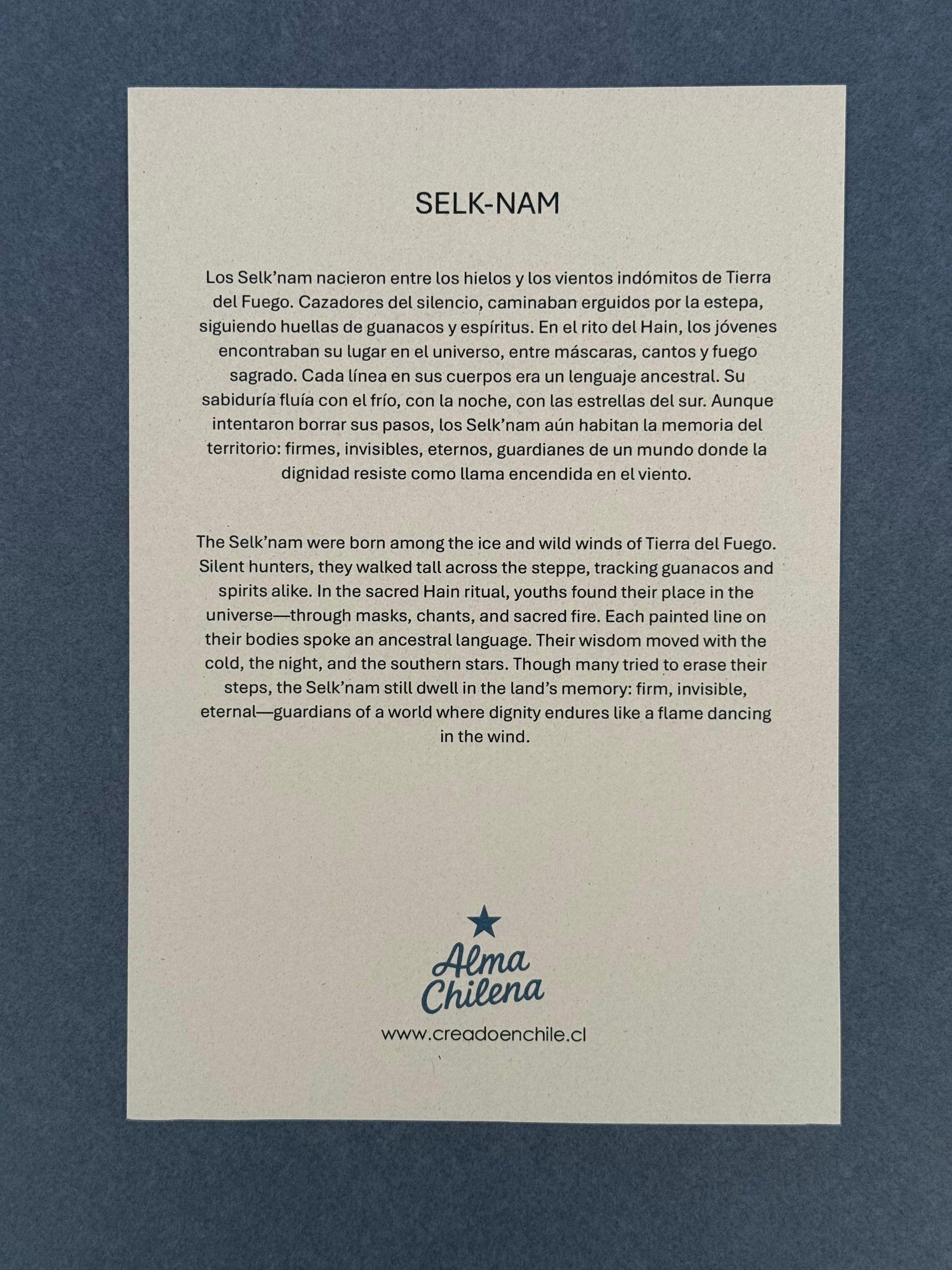 Esta colección rinde homenaje a las culturas ancestrales que han dado forma a nuestro territorio a través de ilustraciones dedicadas a los pueblos originarios de Chile. Inspiradas en la cosmovisión, la espiritualidad y el legado de los pueblos Selk’nam y Mapuche, cada obra ha sido creada con una mirada artística profunda, basada en investigación, respeto y simbolismo.