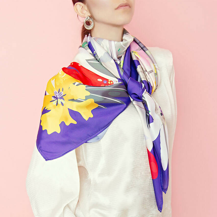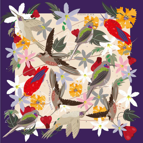 Nuestro Maxi Pañuelo complementará magníficamente cualquier tenida, tanto de día como de noche. Su colorido diseño inspirado en los hermosos picaflores presentes en Chile: Picaflor del Norte, Picaflor de Cora, Picaflor Gigante, Picaflor de Juan Fernández y Picaflor Cordillerano combina bellamente con las flores de Trompetas de Atacama, Copihue y Astromelias.