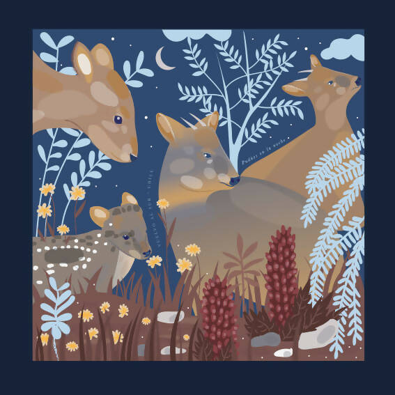 En este elegante Maxi Pañuelo, plasmamos la belleza y la magia de los Pudúes en los paisajes del sur de Chile. Resguardados en las noches de los Bosques, especialmente en Chiloé, los Pudúes son integrantes muy importantes y delicados de la fauna andina suramericana.