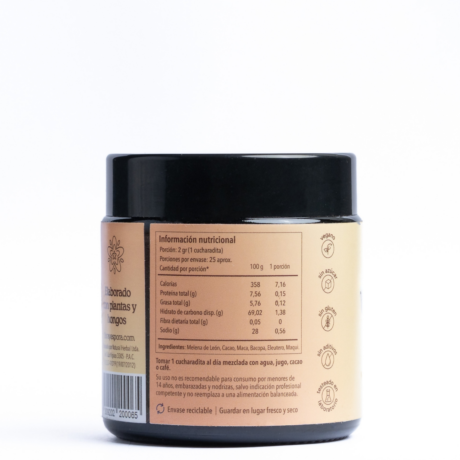 Elaborado con hongo melena de león, conocido por su capacidad de estimular la mente y mejorar el enfoque y la memoria. También hemos incorporado bacopa, planta adaptógena conocida para reducir el estrés y mejorar la concentración, eleuthero (ginseng siberiano), planta adaptogénica que combate la fatiga y proporciona energía. Maca andina y cacao, ingredientes revitalizantes que nos proporcionan energía y maqui para agregar antioxidantes a esta mezcla nootrópica. 50 grs.