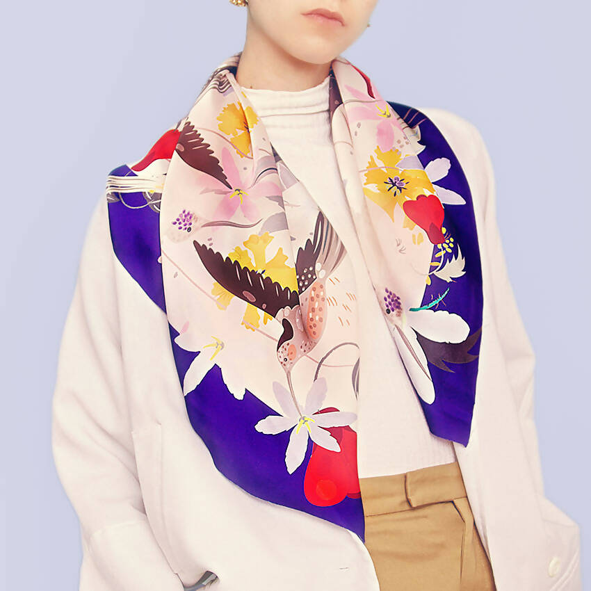 Nuestro Pañuelo complementará magníficamente cualquier tenida, tanto de día como de noche. Su colorido diseño inspirado en los hermosos picaflores presentes en Chile: Picaflor del Norte, Picaflor de Cora, Picaflor Gigante, Picaflor de Juan Fernández y Picaflor Cordillerano combina bellamente con las flores de Trompetas de Atacama, Copihue y Astromelias.