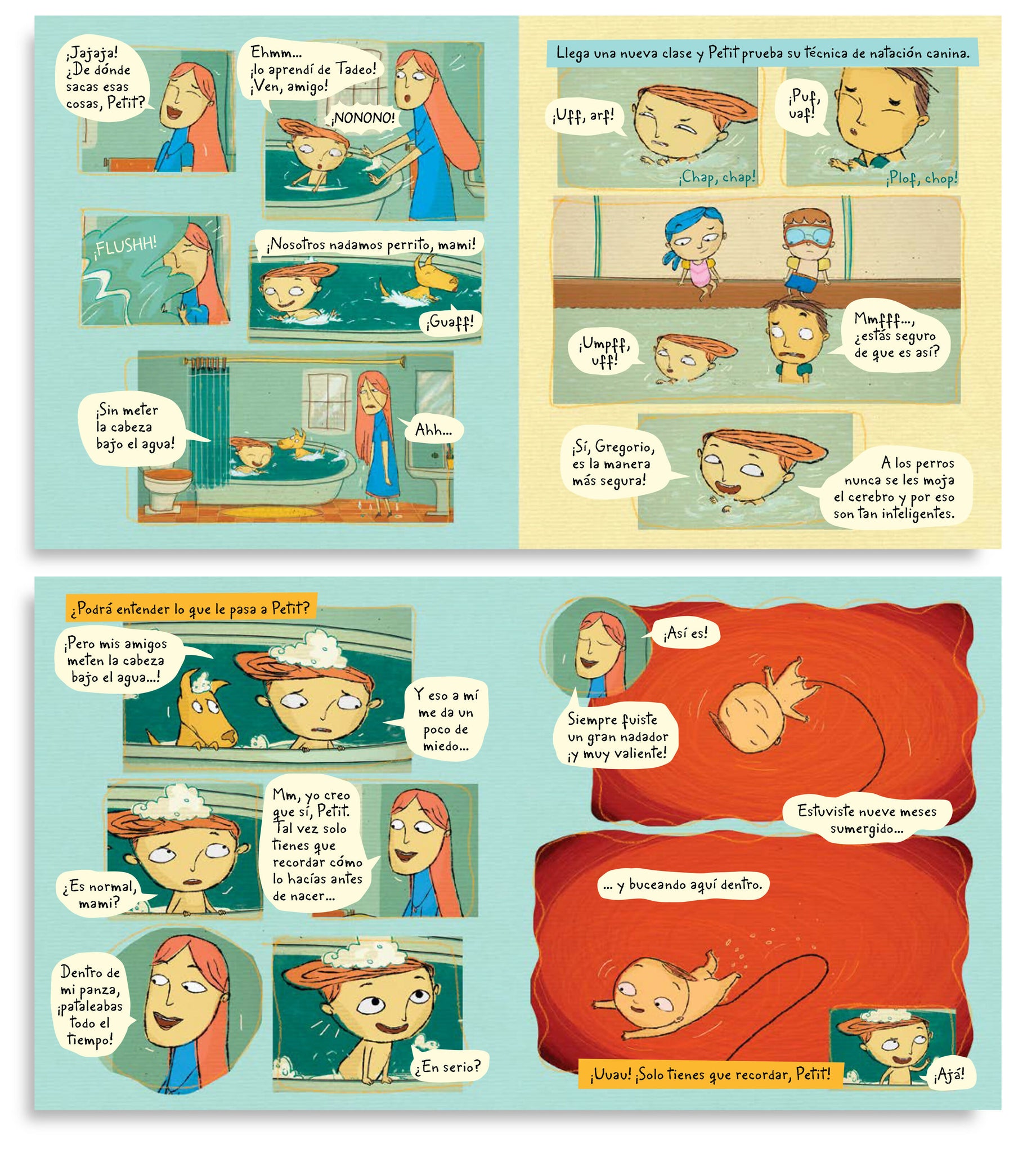 Petit comienza a aprender natación en la escuela, algo que lo entusiasma pero también lo asusta un poco. Sus amigos, su perro Tadeo y su madre intentarán ayudarlo a sumergirse en esta nueva aventura. Petit dice que no quiere que el agua le entre en la cabeza. ¡Cómo se te ocurre, Petit! Las aventuras de Petit, la premiada serie de NTV, regresan al germen literario en formato historieta-cuento. Una versión de la versión. ¡Una di-versión!