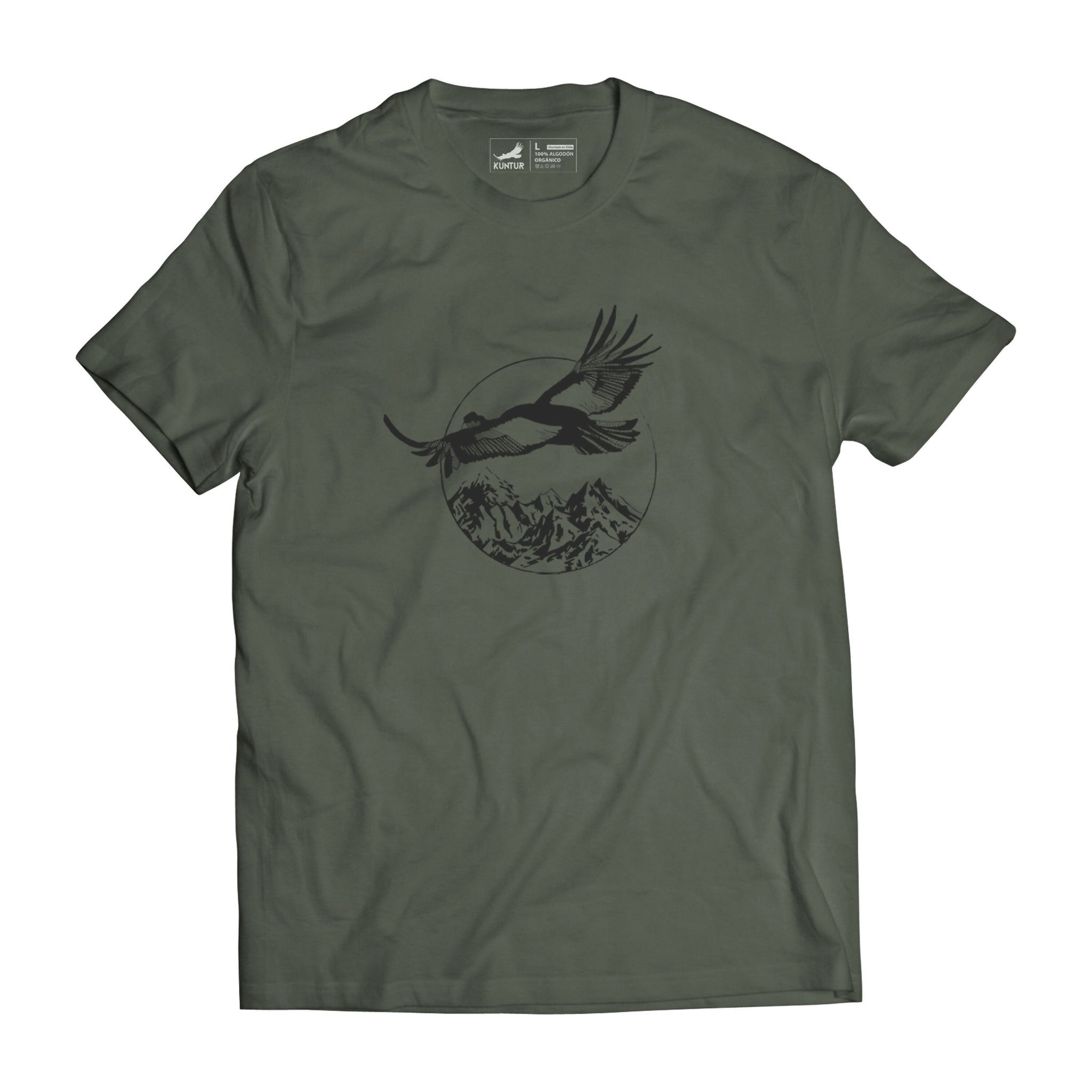 En el frente tiene un estampado en color negro grafito que refleja la escena de un cóndor sobrevolando las montañas chilenas. En la parte de la espalda lleva el logo de Kuntur en un tamaño pequeño.