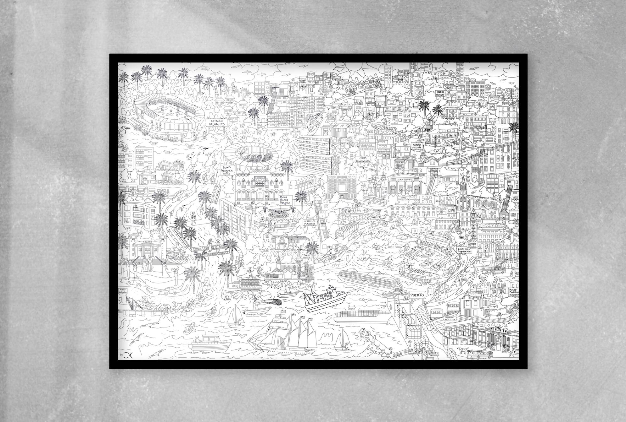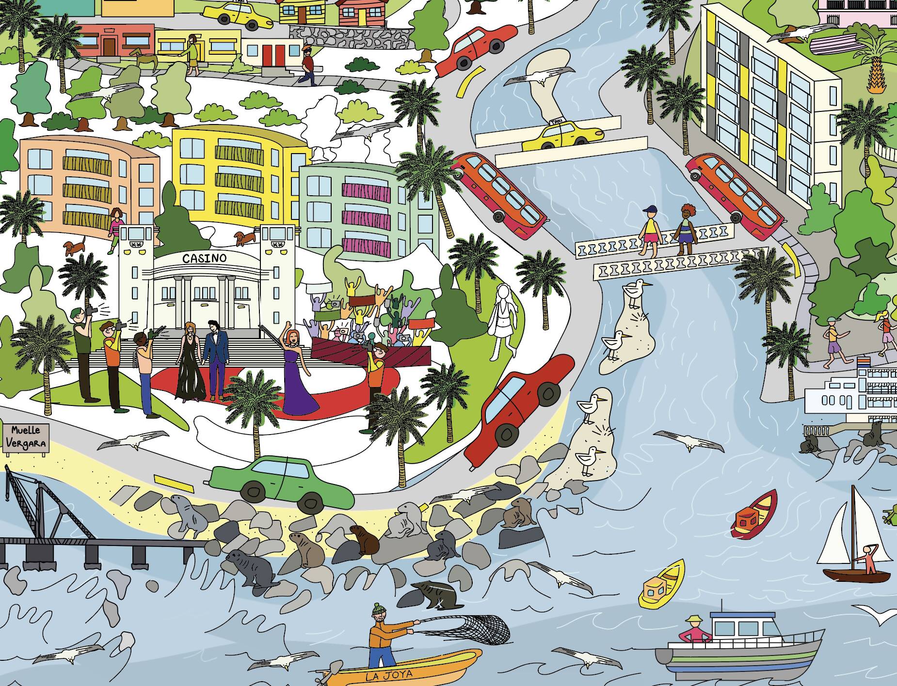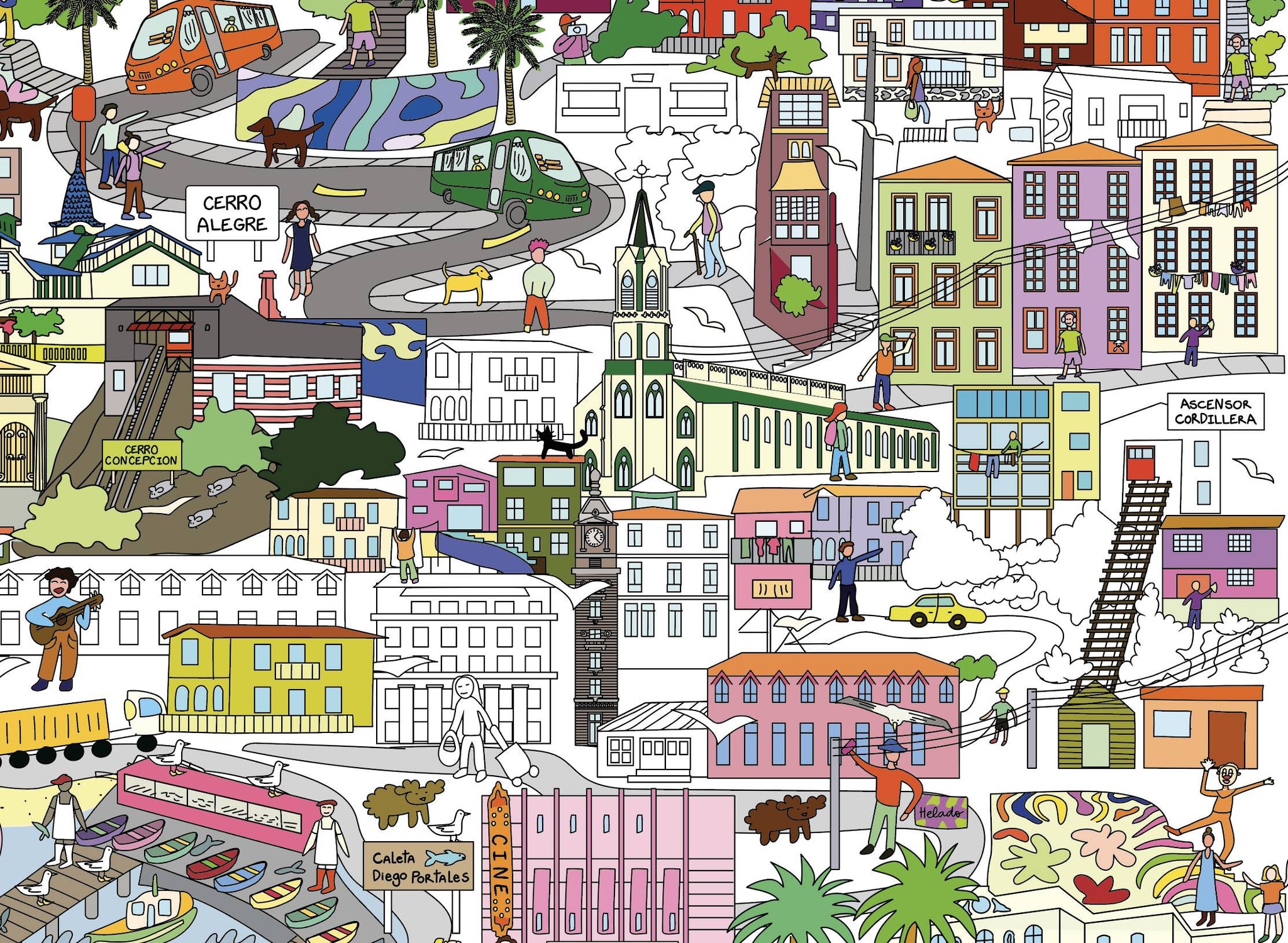 Esta lámina ilustra Valparaíso y Viña del Mar. Promueve la imaginación de los niños, los entretiene por largo rato, genera un espacio de trabajo en equipo y ayuda con la motricidad fina.