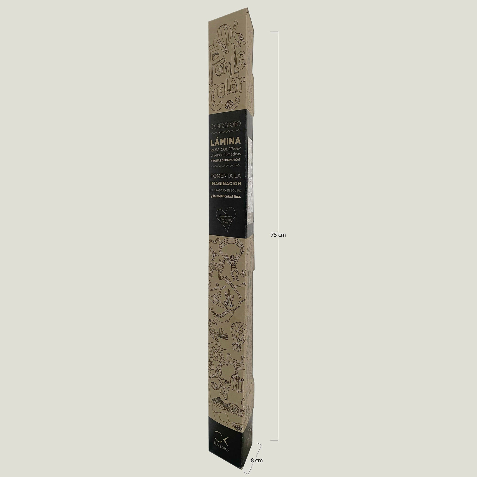 Packaging: Caja ilustrada impresa en cartón microcorrugado de 75 cm de largo con sticker personalizado según la temática de la lámina. Perfecto para regalar y para transportar sin problemas!