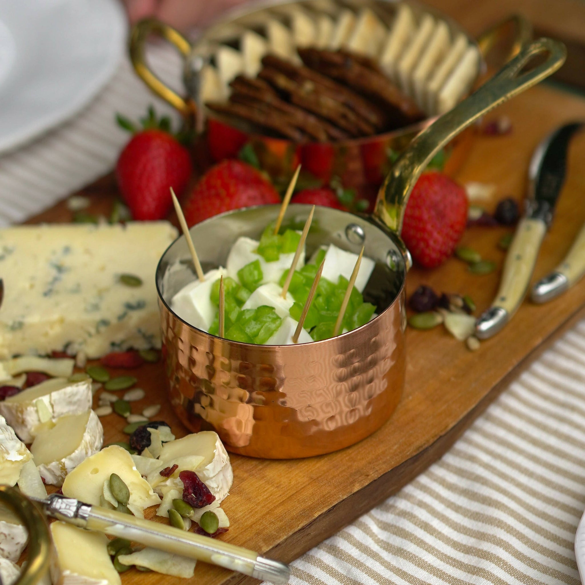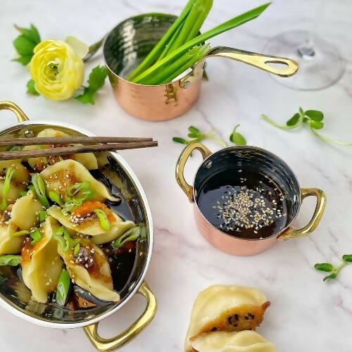 Ollita para servir acompañamientos, guisos, aperitivos y otras preparaciones de manera original. Productos especialmente diseñados en Chile, son de cobre, con mango bronce y el interior de acero inoxidable.