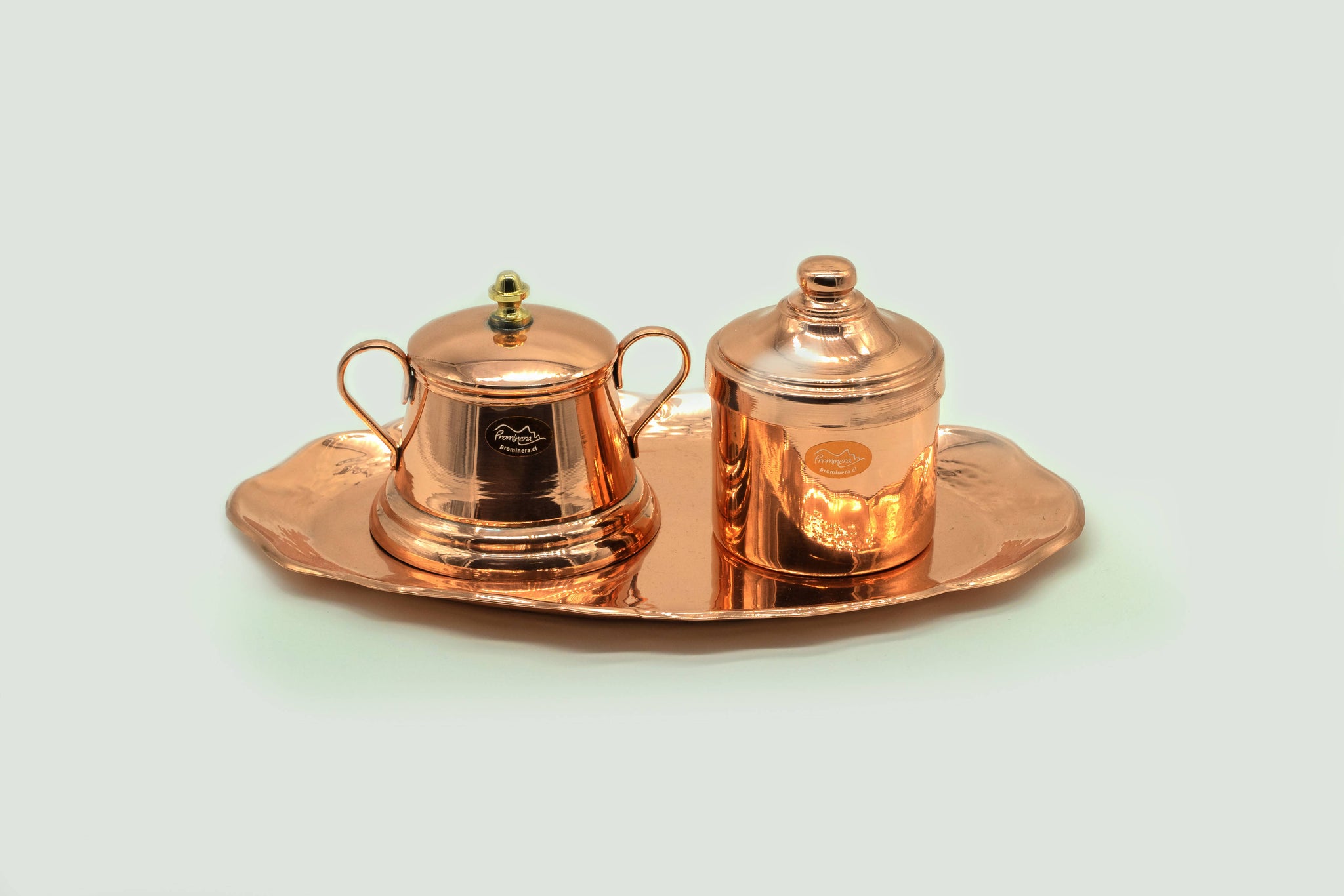 Lindo Set azucarero, porta café y bandeja (17x27cm) de cobre. Presentación estuche de papelería color negro.