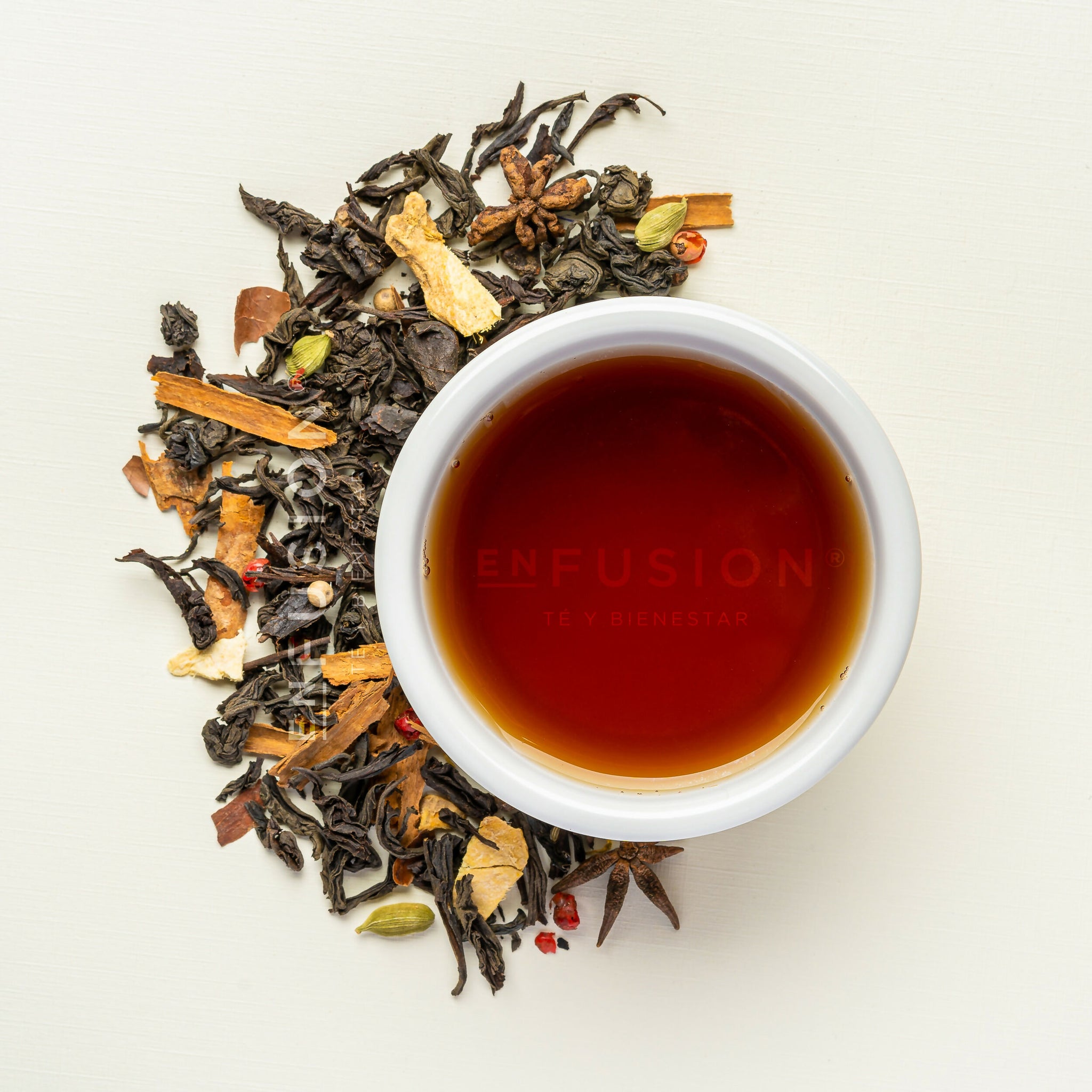 Ingredientes: Té Negro Ceylán, Mix de Pimientas (rosada, blanca y negra), Jengibre, Anís Estrella, Canela, Cacao, Clavos de Olor y Cardamomo.