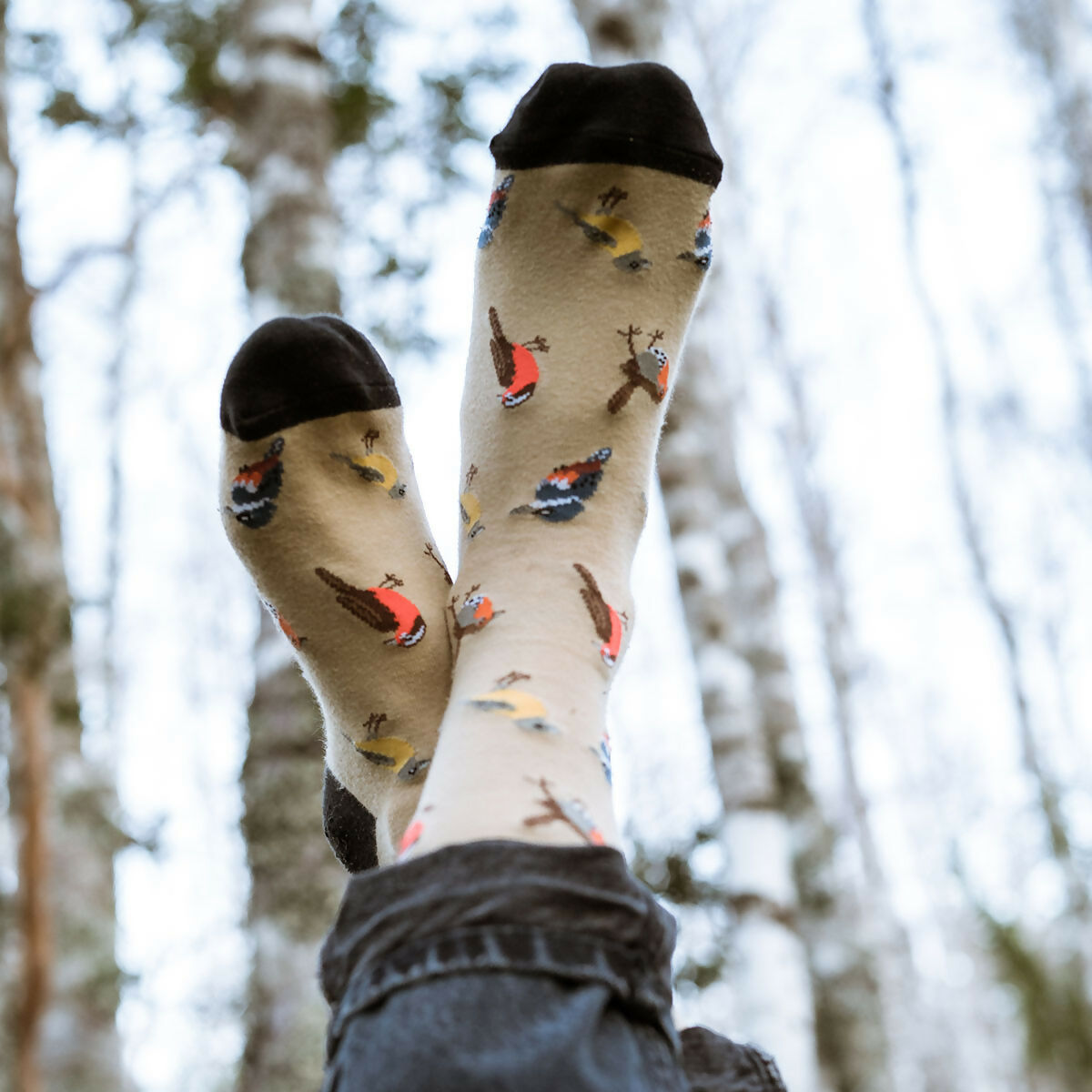 - Diseño Artístico: Calcetines decorados con ilustraciones detalladas de aves chilenas, perfectos para quienes aman la naturaleza y el arte.