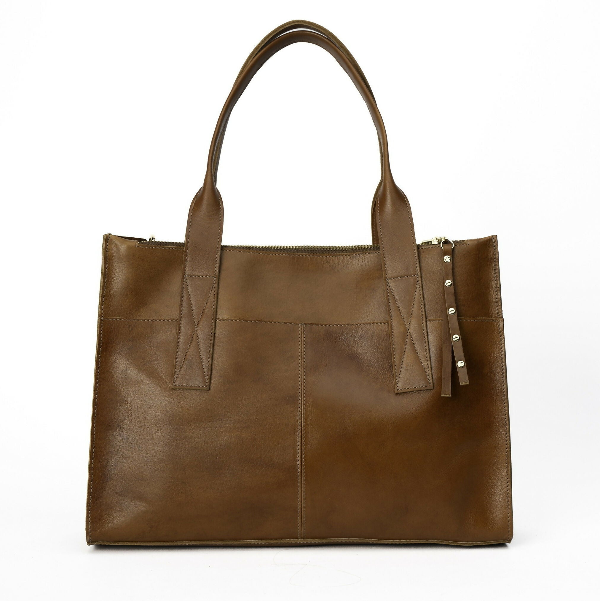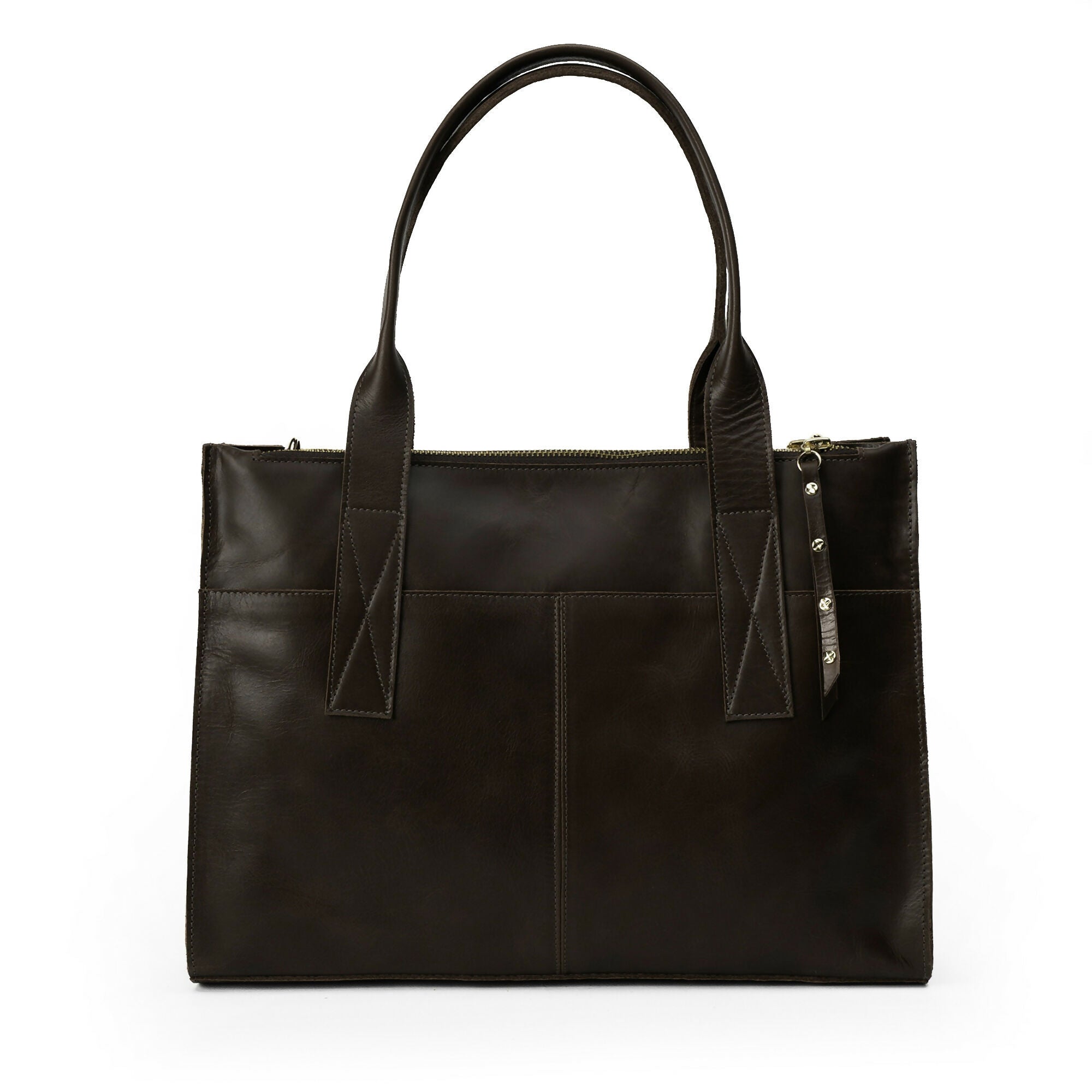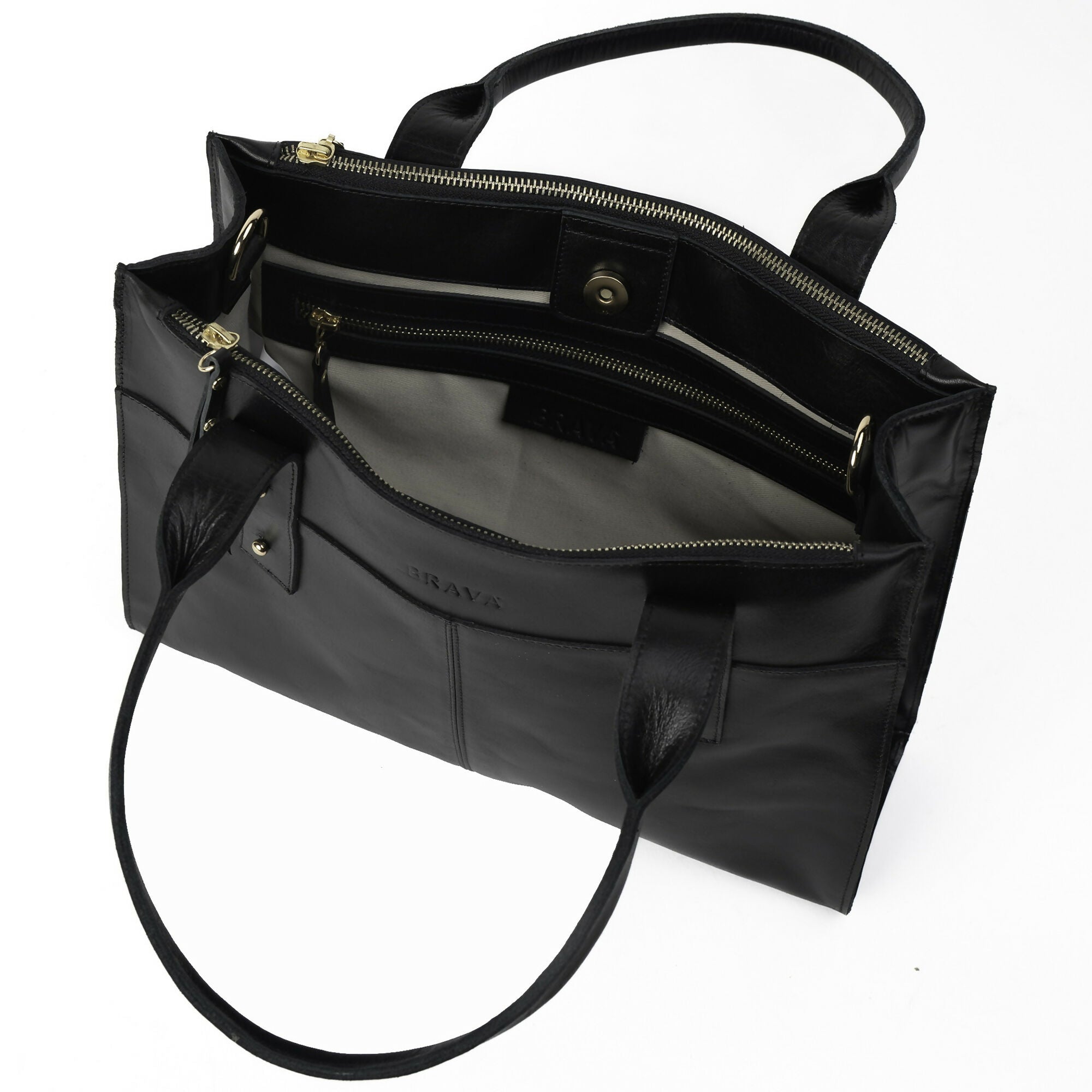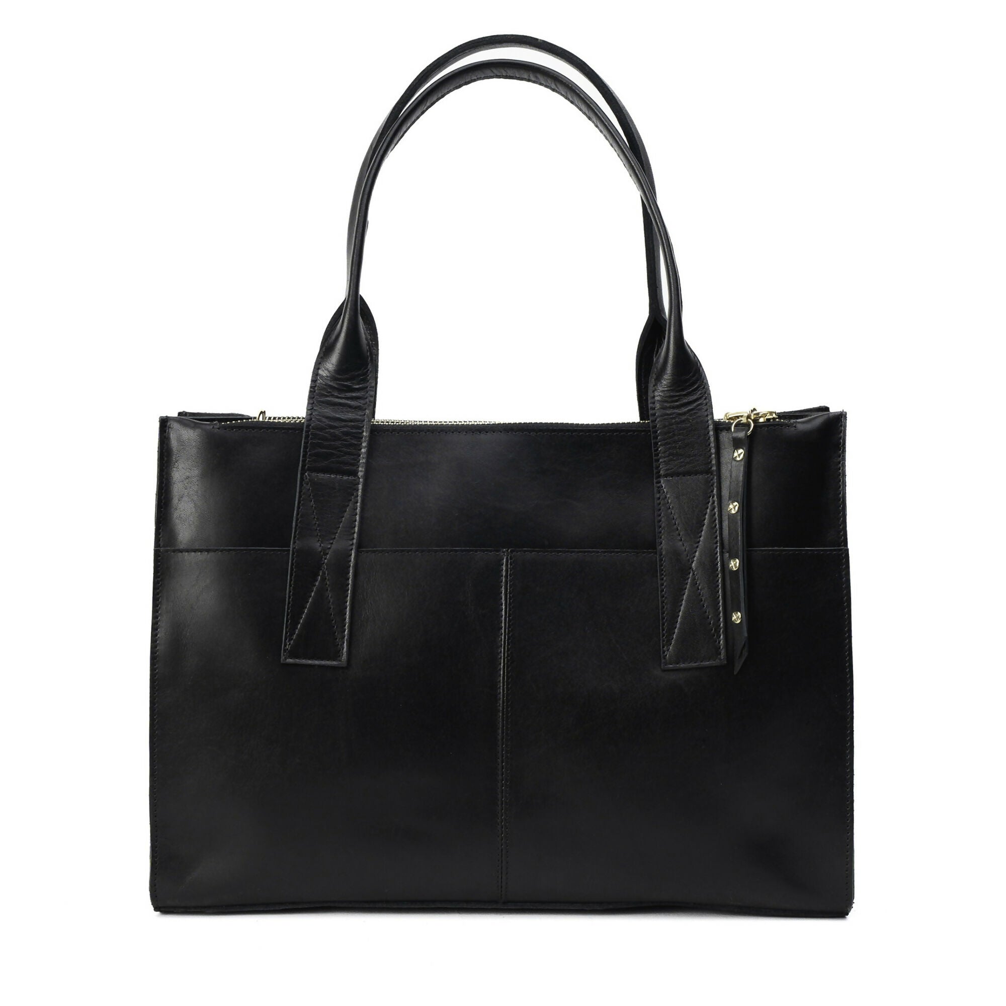 Su gran apertura principal facilita el acceso, mientras que los dos bolsillos laterales con cierre metálico y el bolsillo interior forrado en gabardina ofrecen espacio organizado para tus esenciales. Diseñada para llevarse de mano o al hombro, este accesorio es la elección perfecta para un estilo profesional y sofisticado.
