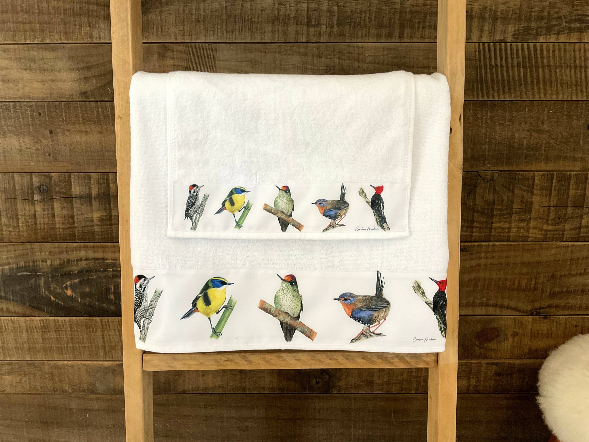 Set de toalla de visita y mano ideales para decorar tu baño con aplicaciones de ilustraciones de aves de Chile realizadas en acuarela por la artista Carolina Machuca.