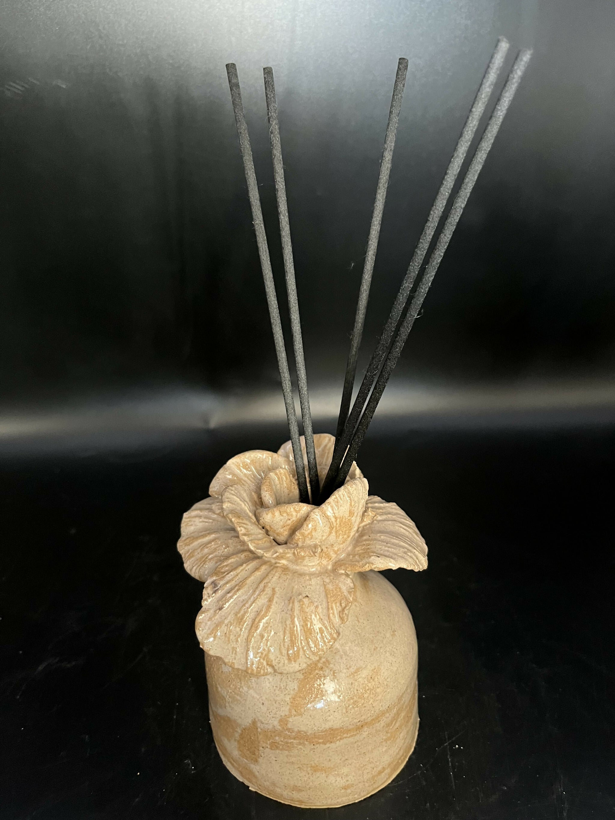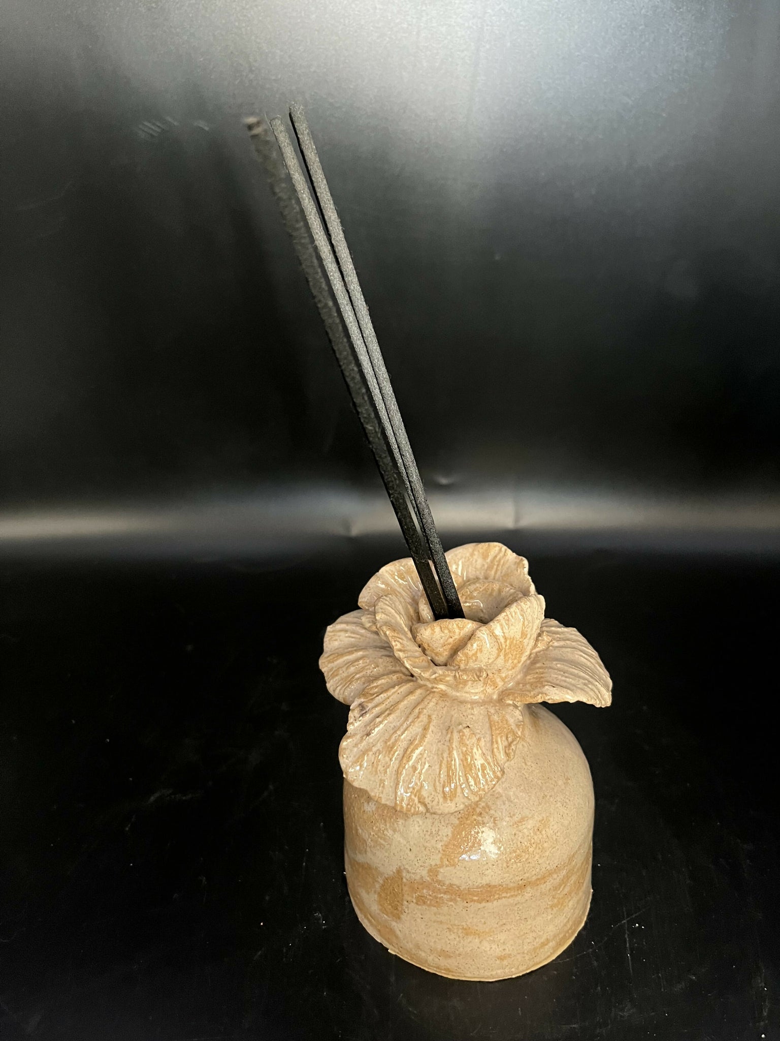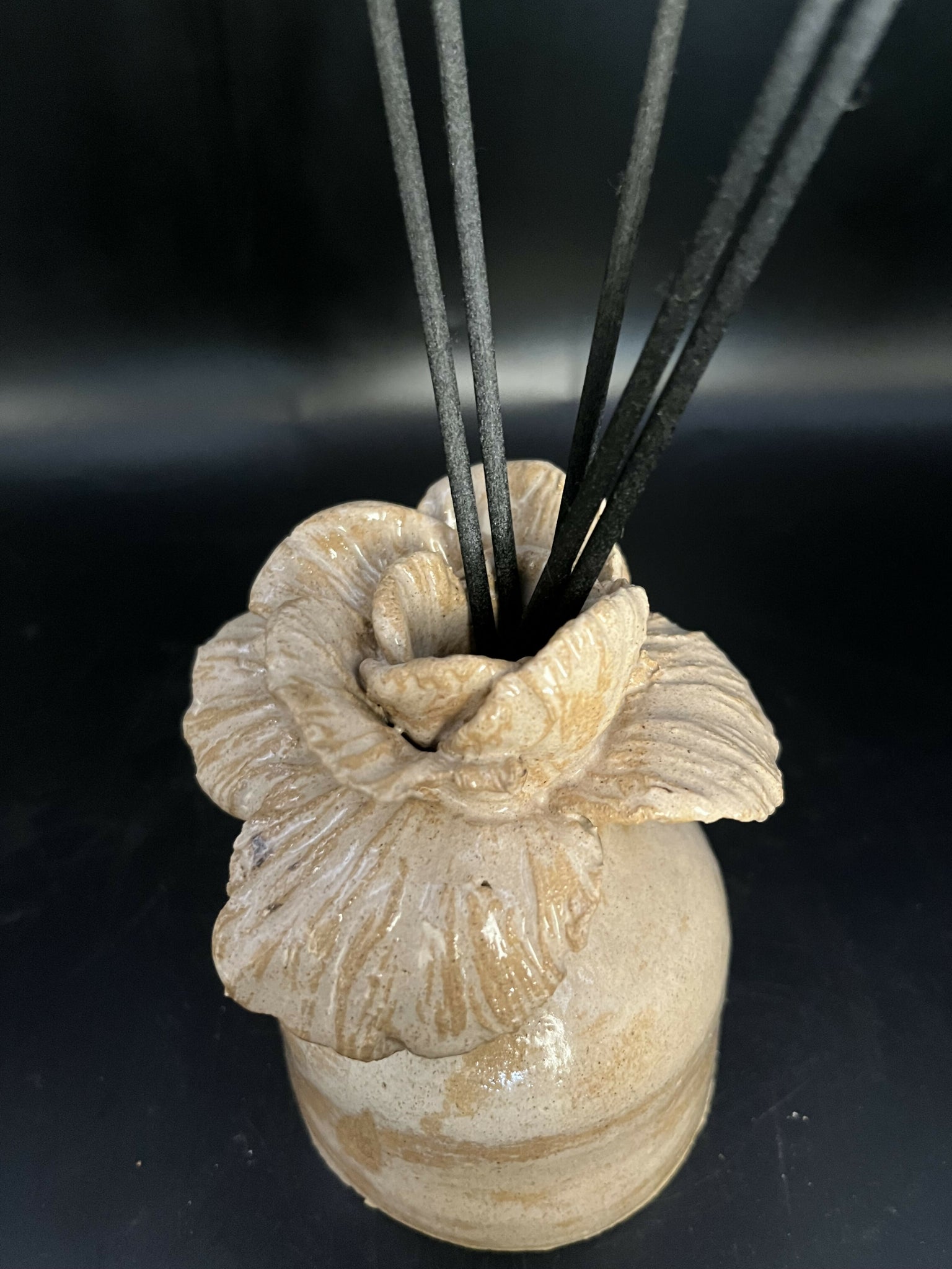 Original porta aromatizador de cerámica gres con aplicación de flor, esmalte capuccino brillante