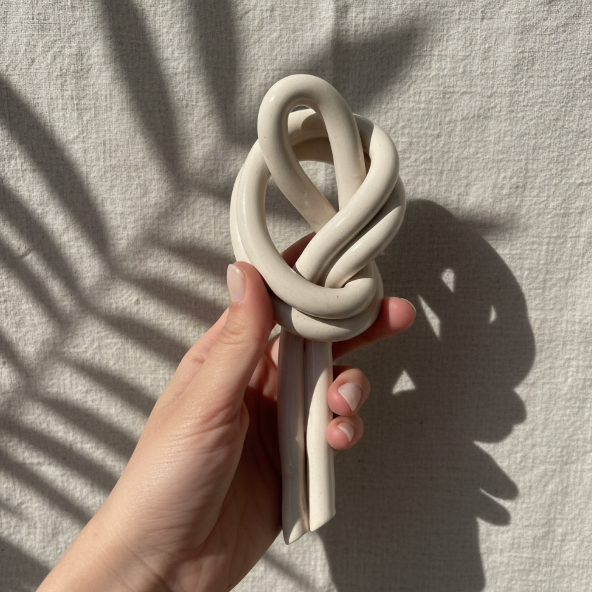 Esta escultura de cerámica gres, con su diseño de nudo atemporal, es una pieza única que combina la simplicidad moderna con la sofisticación artesanal. Su acabado esmaltado en un tono neutro y brillante resalta la fluidez de la forma, creando un objeto decorativo elegante. Es el detalle perfecto para añadir un toque de diseño contemporáneo y textura a cualquier rincón de tu hogar.