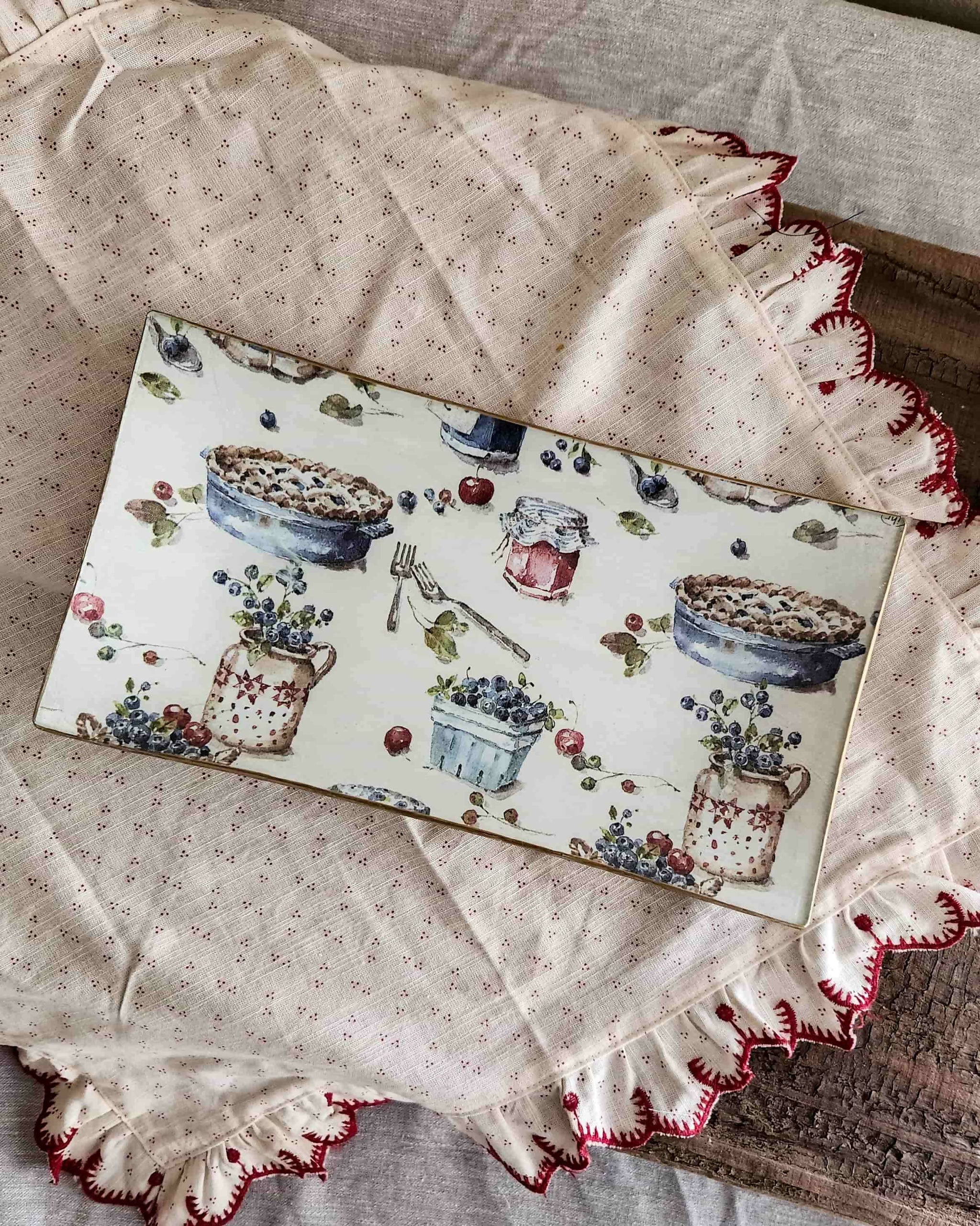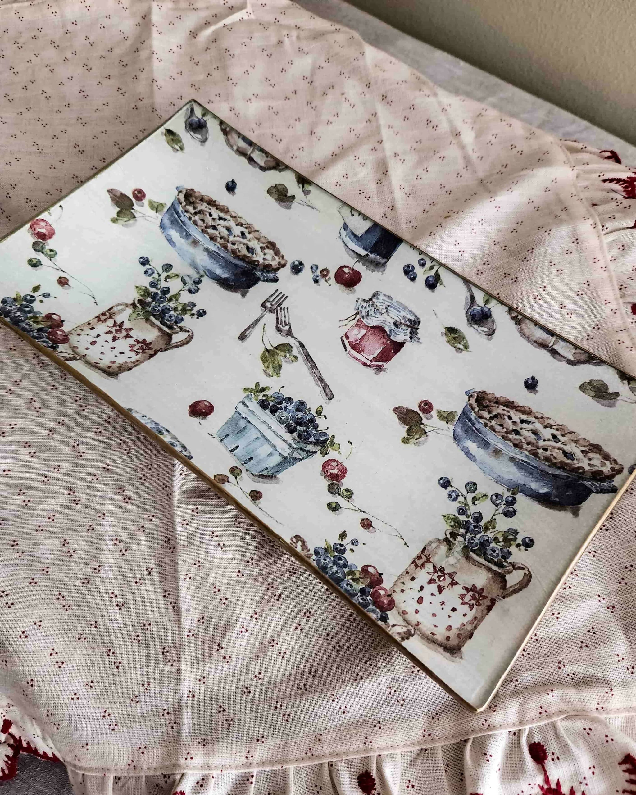 Bandeja rectangular de vidrio templado de 24 x 12 cm, con tratamiento artesanal de decoupage. Apto para el lavado a mano y para el uso de comidas o elementos calientes sobre la superficie.