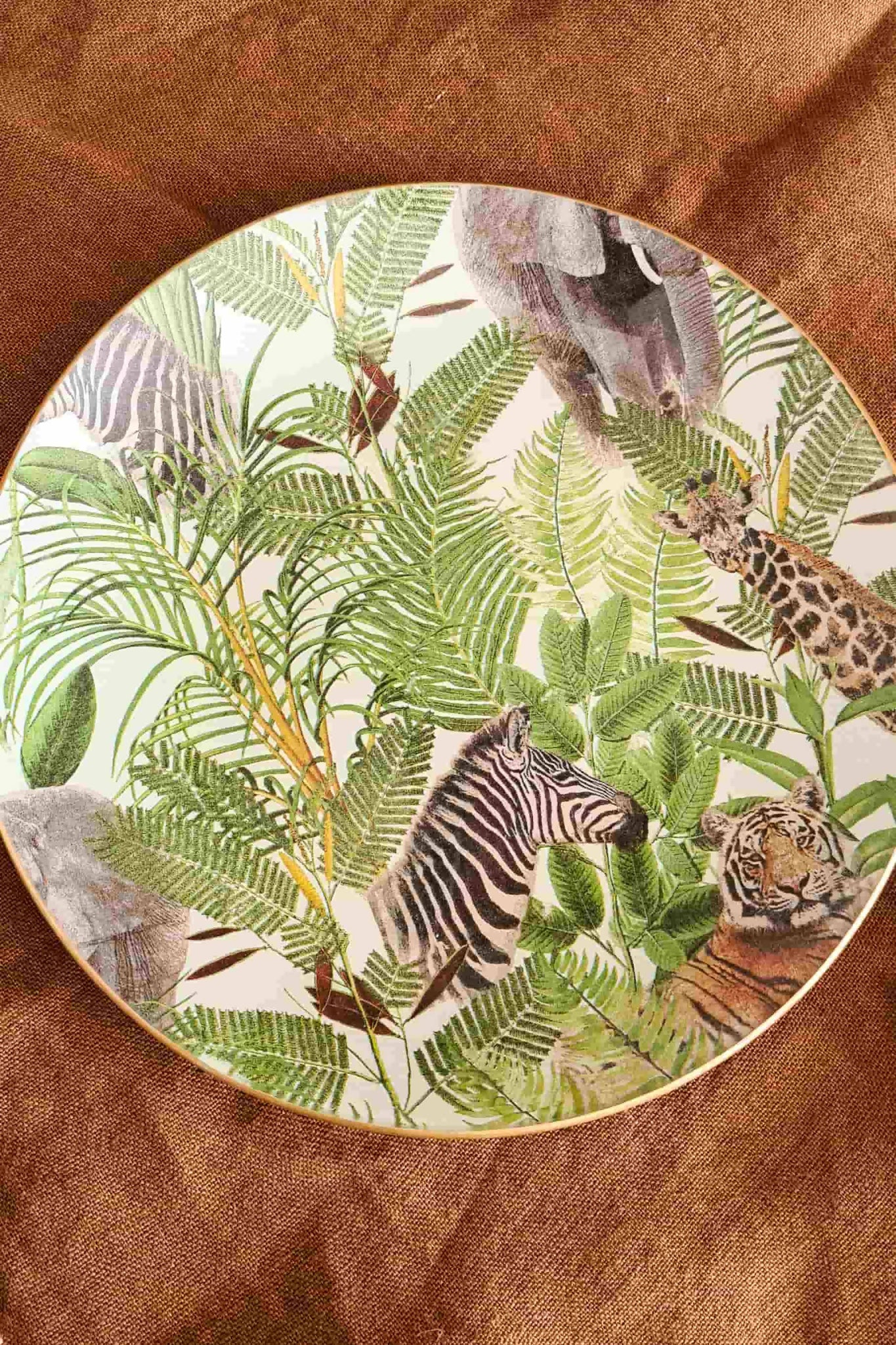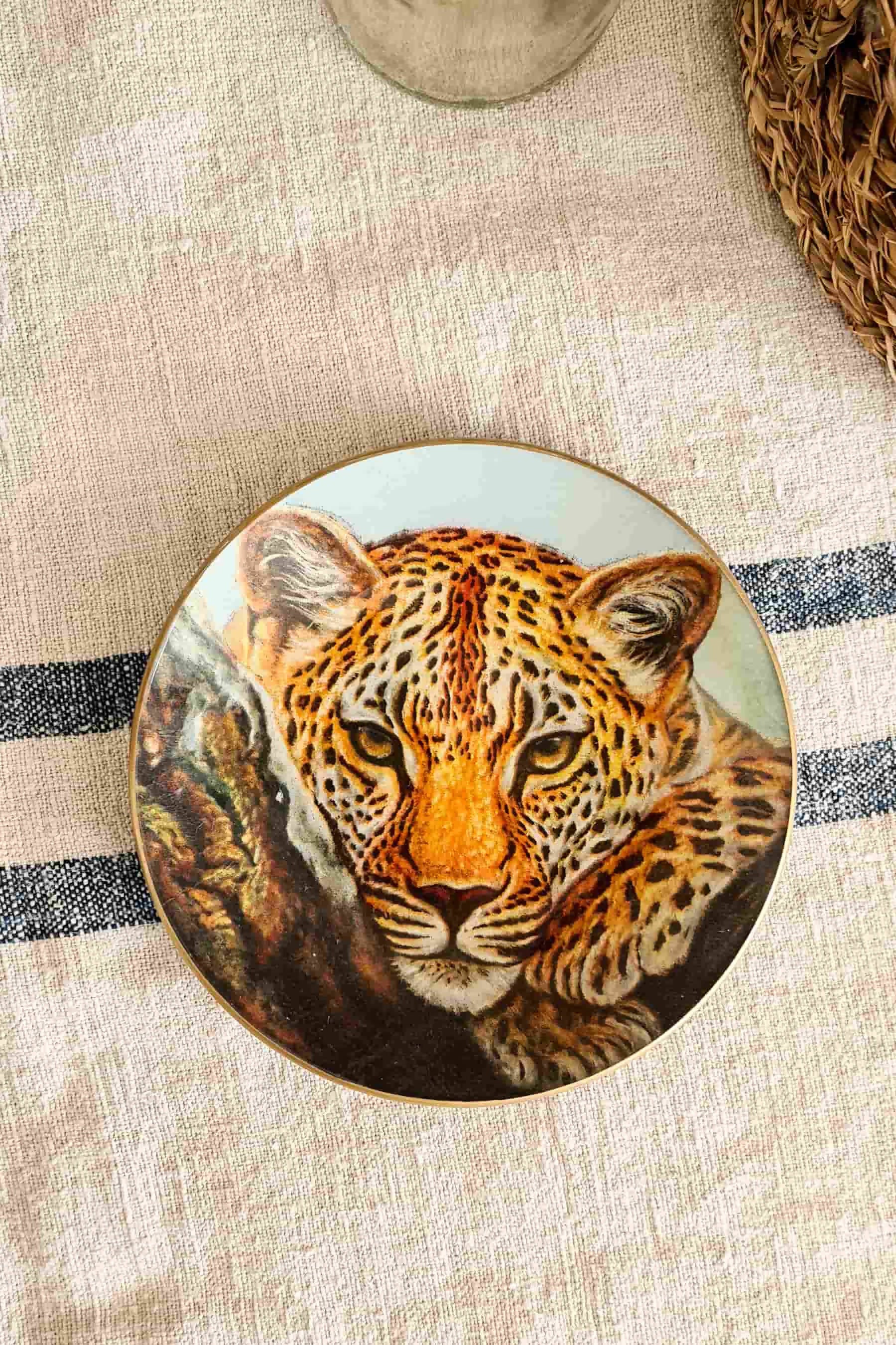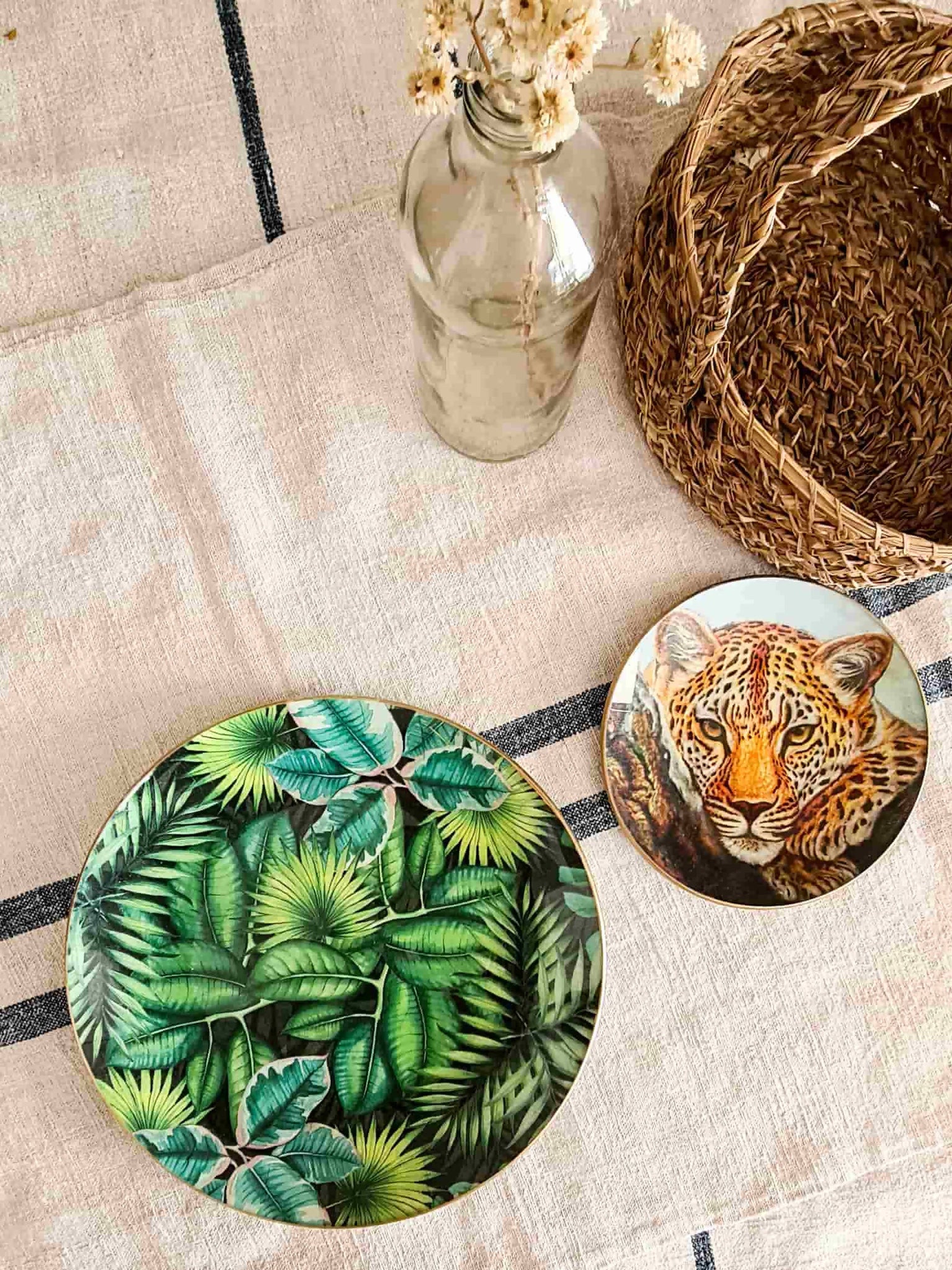 Conjunto de Plato cuadrado de vidrio templado de 16 cm y plato redondo de 25 cm, con tratamiento artesanal de decoupage. Apto para el lavado a mano y para el uso de comidas o elementos calientes sobre la superficie.