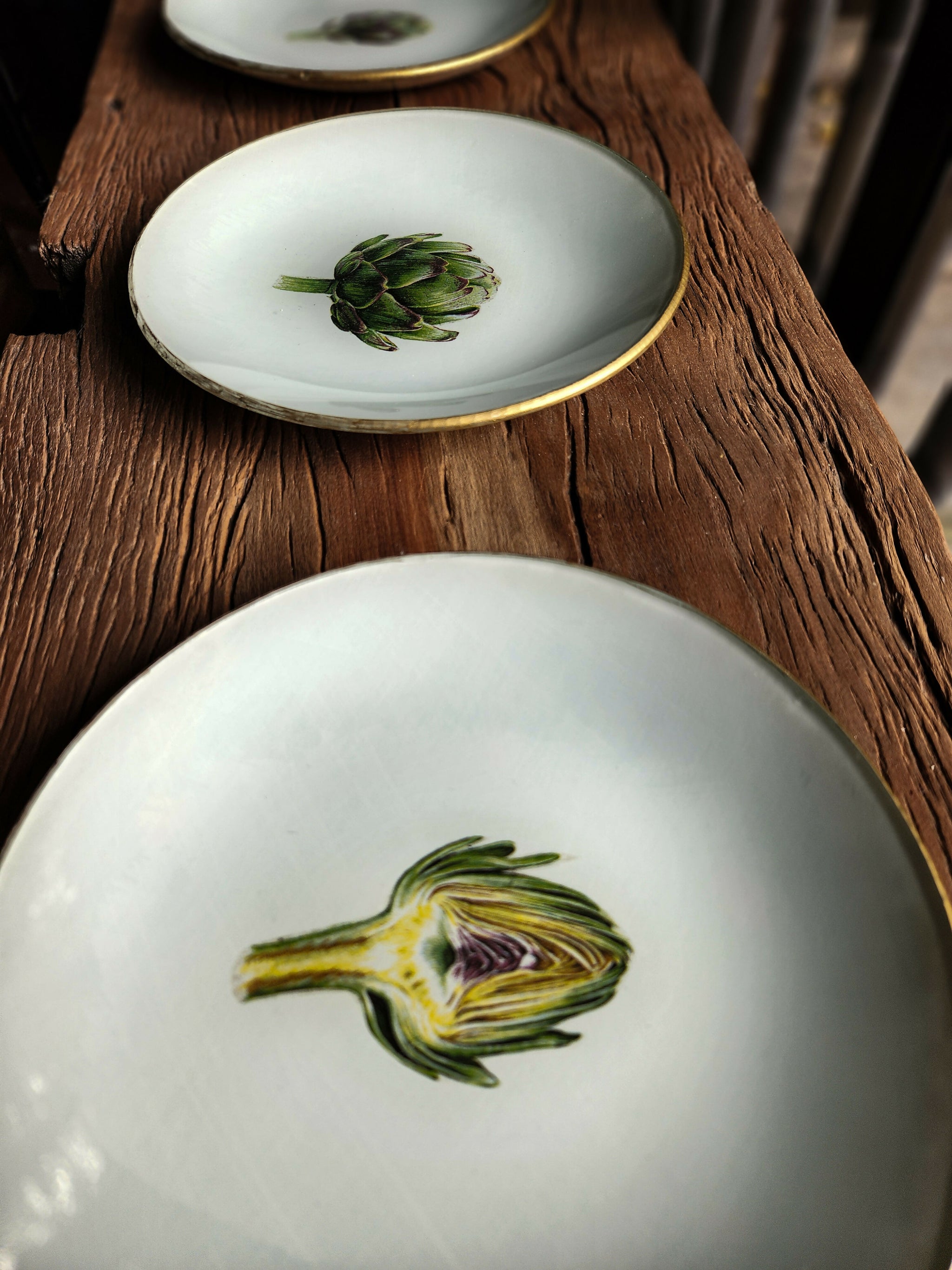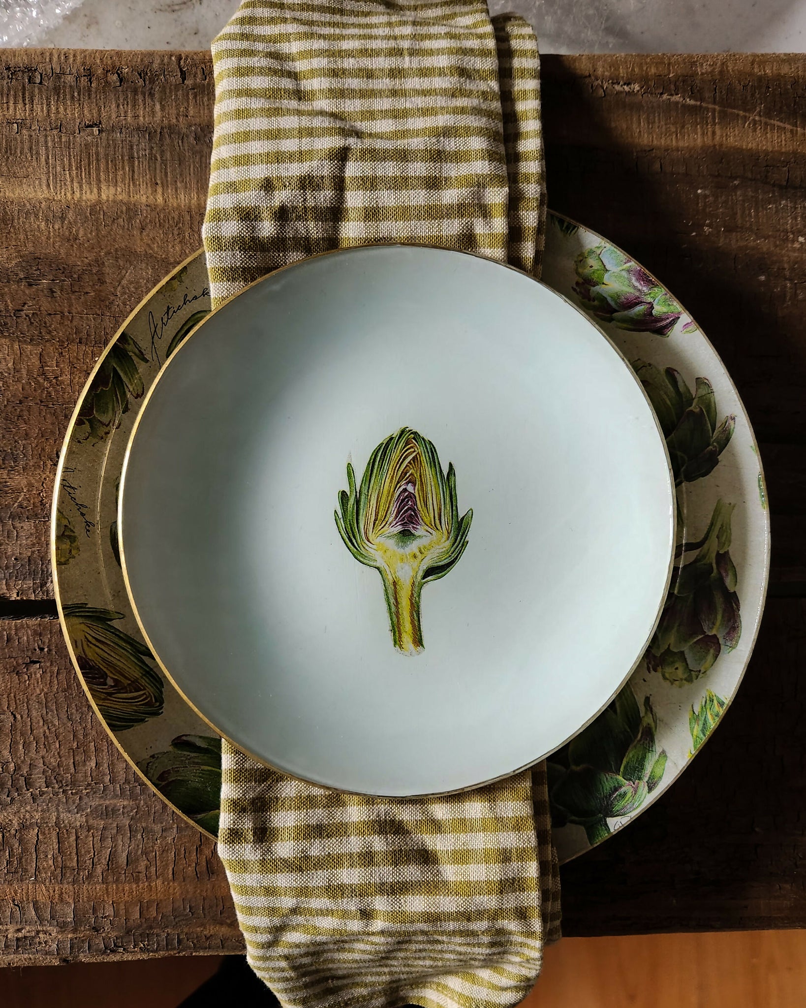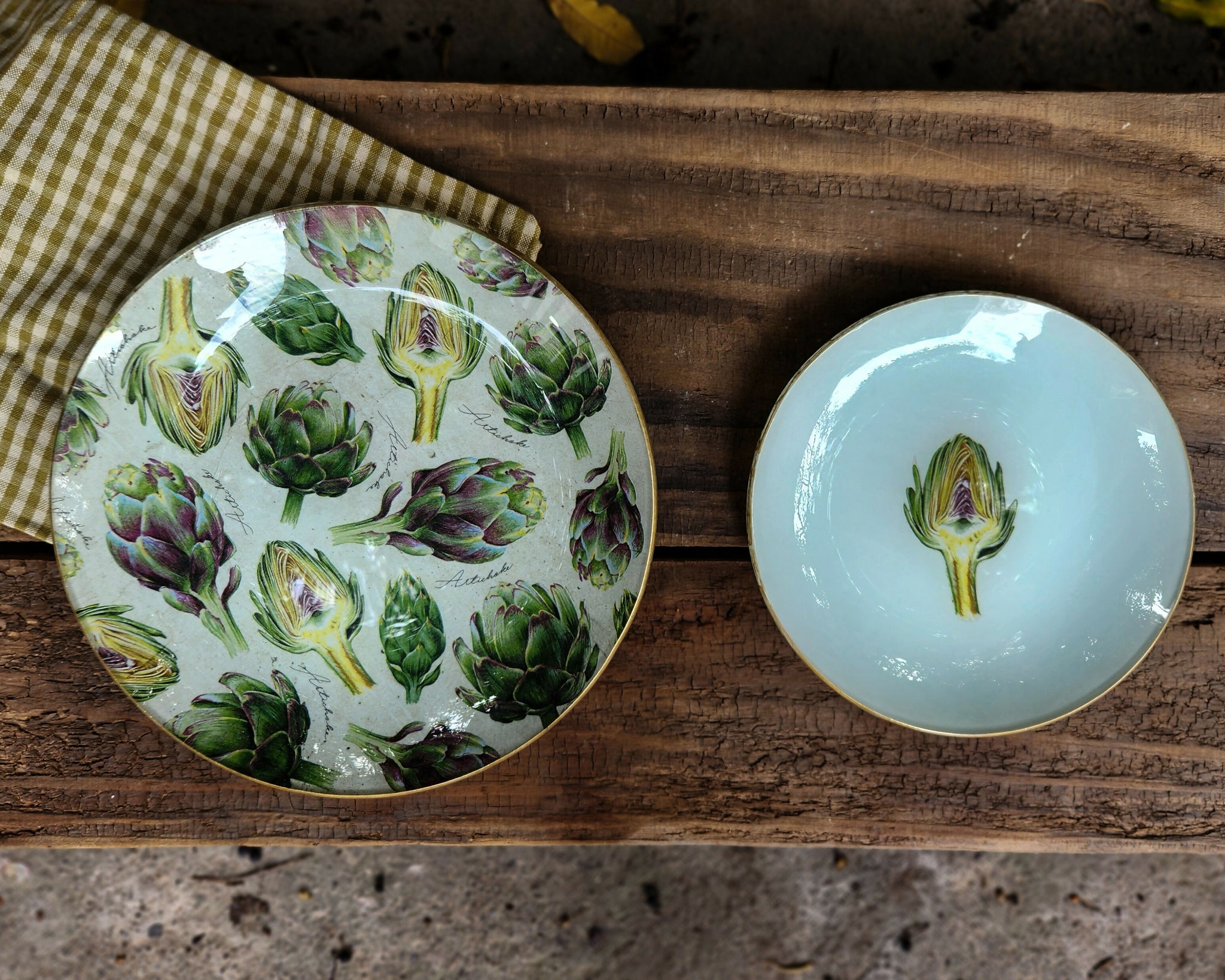 Plato redondo de vidrio templado de 16 cm, con tratamiento artesanal de decoupage. Apto para el lavado a mano y para el uso de comidas o elementos calientes sobre la superficie.