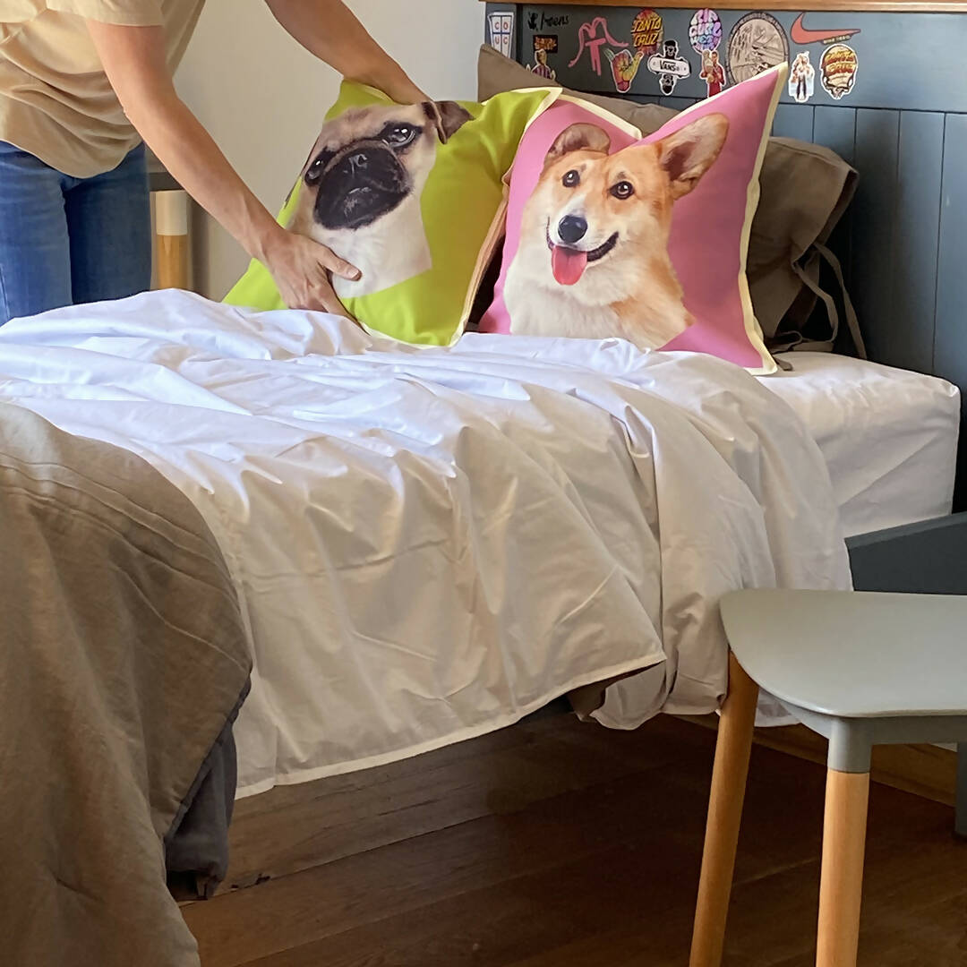Gracioso y suave cojín estampado de 45 x 45 cm., en formato medio.