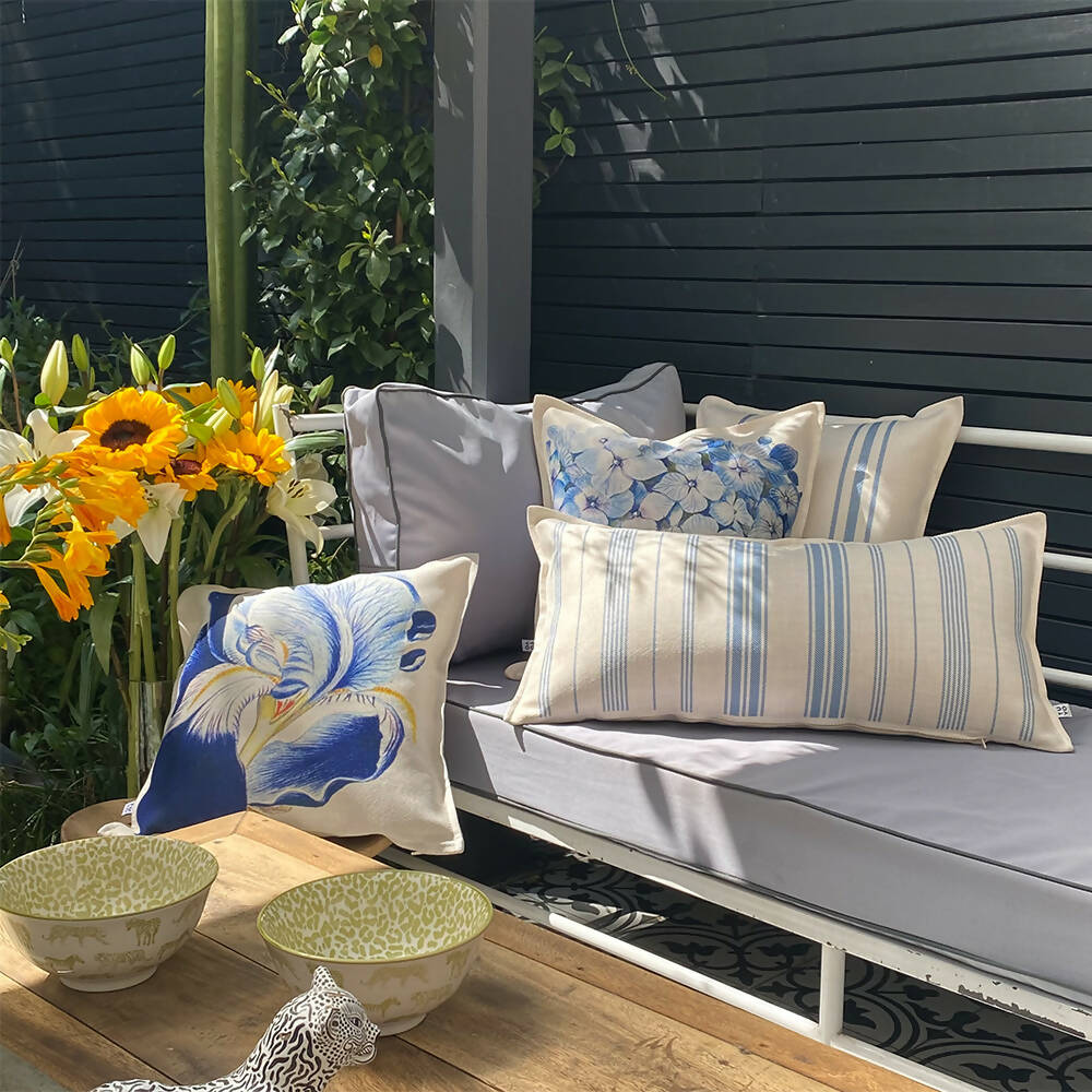 Cojín Hortensia Celeste en linet estampado 45×45 cm. Para renovar tu espacio