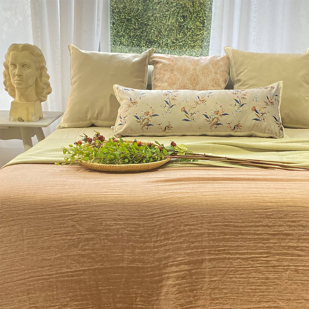 Exquisito cojín en tela afelpada cruda estampada en gran formato.