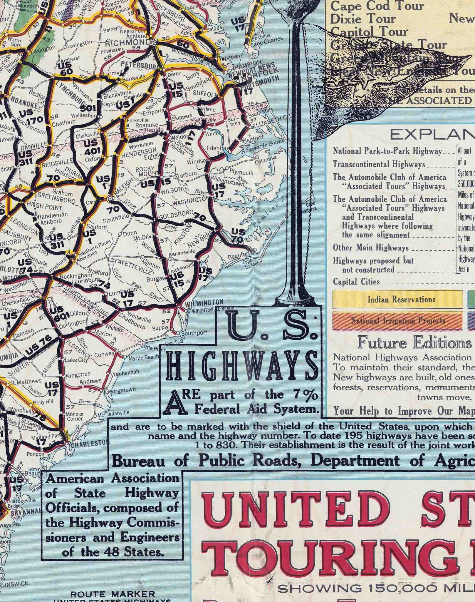 El mapa fue emitido conjuntamente por la Asociación Nacional de Carreteras y el Club de Automóviles. Cartografía de John C. Mulford y C.C. fauncia litografiado e impreso por A. Hoen & Company, Baltimore. Incluye numerosos bloques de texto para la información extensa en la historia de la construcción de carreteras, información sobre el sistema de carreteras de cuatro partes e información organizativa sobre la Asociación Nacional de Carreteras, incluidos los miembros de varios consejos. Muestra los límites de los estados, ciudades, pueblos y muchas reservas indias en los Estados Unidos en amarillo.
