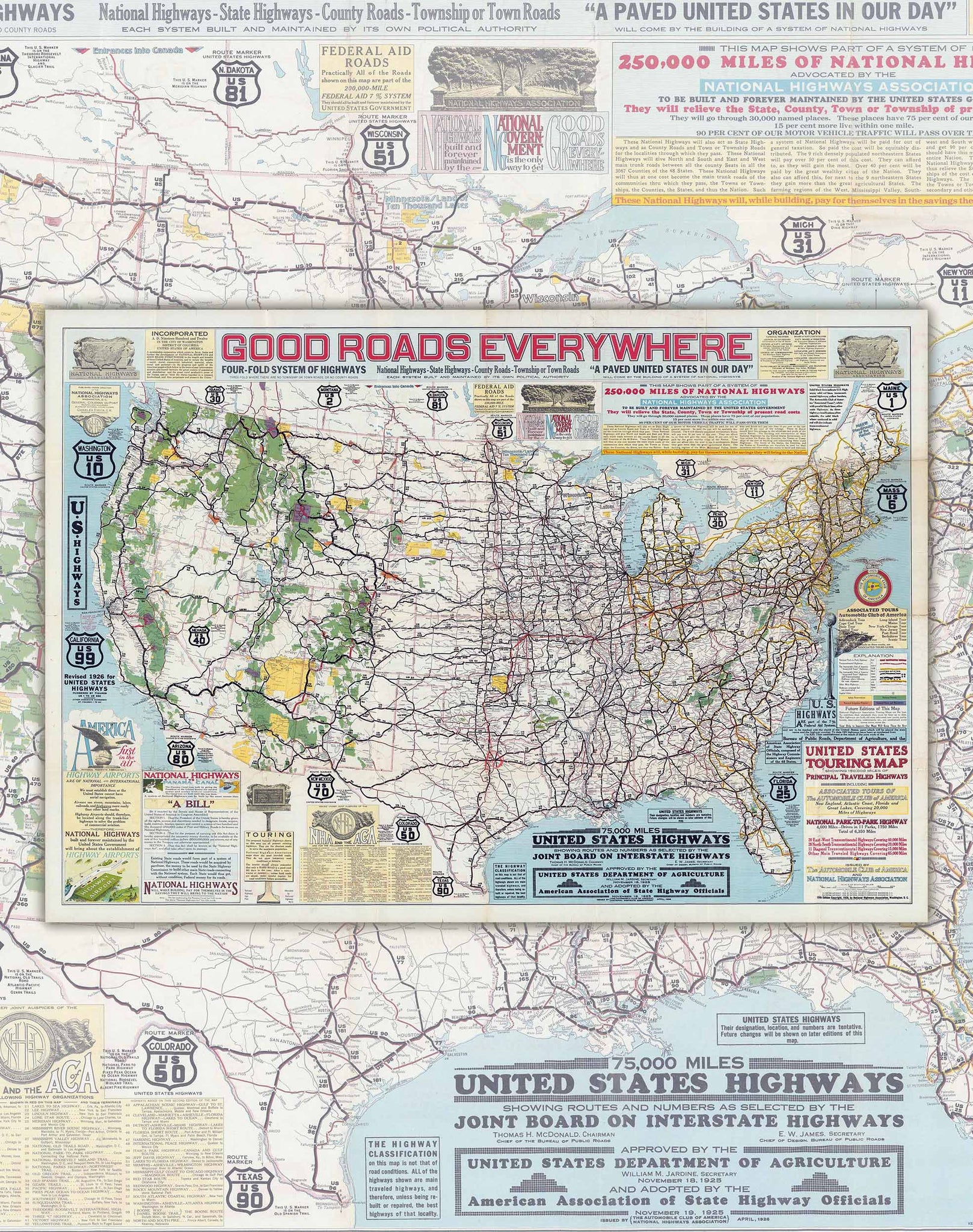 La Asociación Nacional de Carreteras (NHA) se estableció en 1911 para promover el desarrollo de una red vial nacional mejorada en los Estados Unidos. Bajo el lema “¡Buenas carreteras en todos lados!” (Good Roads Everywhere), la NHA abogó por la construcción y el mantenimiento permanente por parte del gobierno federal de un sistema de 50.000 millas (unos 80.500 kilómetros) de carreteras.