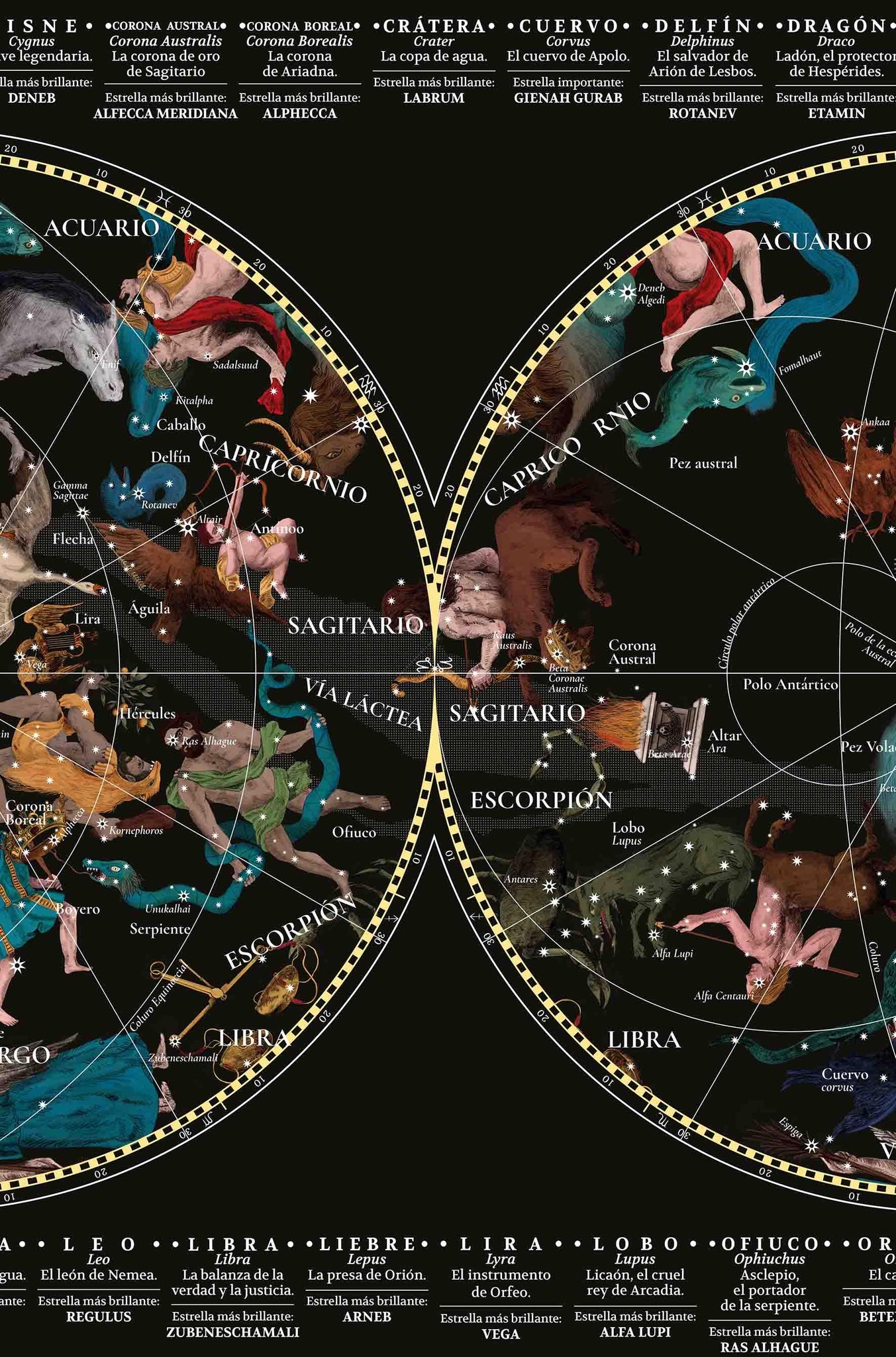 Cada ilustración fue hecha a mano. Este mapa cuenta con los colores tradicionales de la cultura clásica, dándole una estética renovada pero que a la vez sigue manteniendo la esencia de los mapas celestes antiguos.