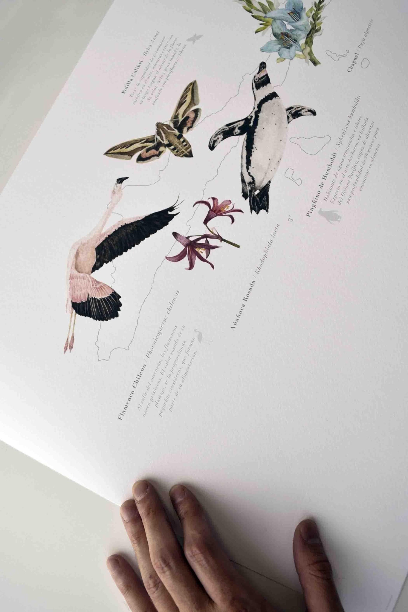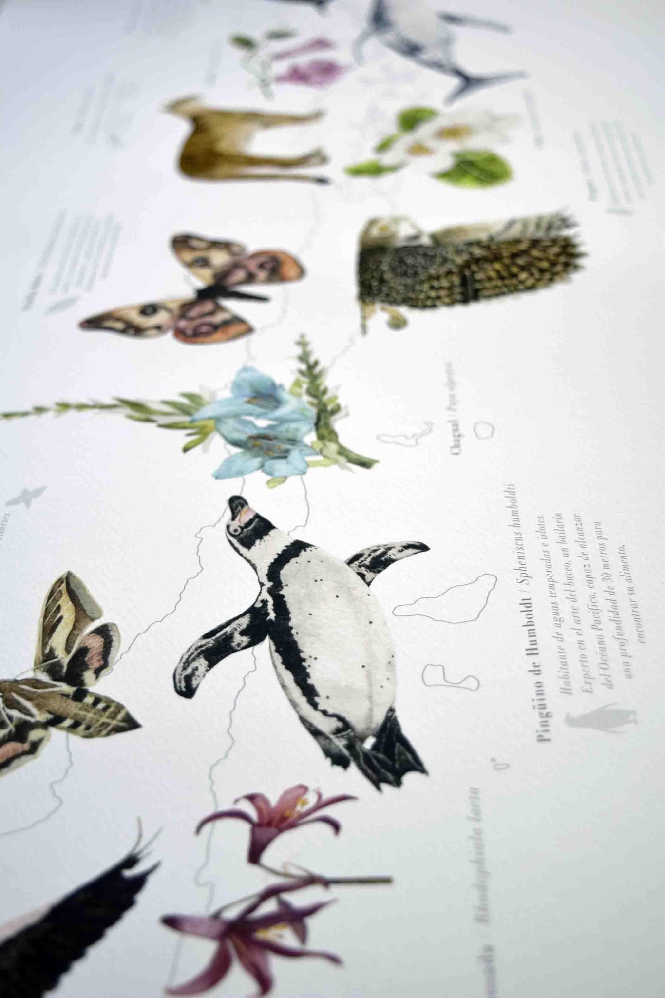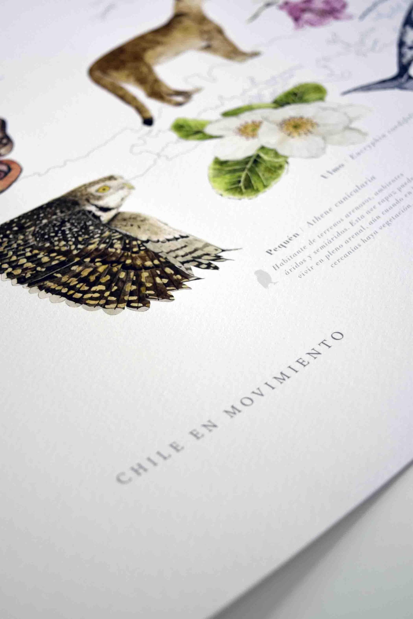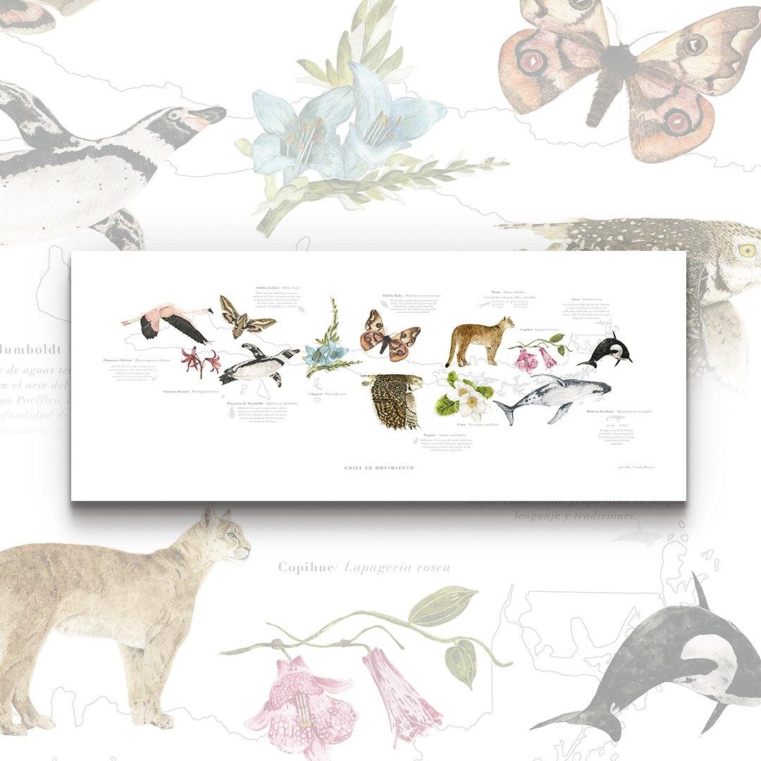 Cada cual tiene su propio camino y la forma en que lo recorre. “Chile en Movimiento” nace con las ganas de sentir la naturaleza a través del arte. Una recopilación de flora y fauna nativa, que nos permite viajar por Chile de norte a sur. A través de este mapa, te invito a observar detenidamente la belleza de algunas especies que habitan a lo largo de nuestro lindo país. Algunos vuelan, otros nadan, saltan, corren o reptan, criaturas fascinantes, flores, colores, detalles, siluetas que provocan sentimientos y deseos de teletransportarse a viajar junto a cada especie.