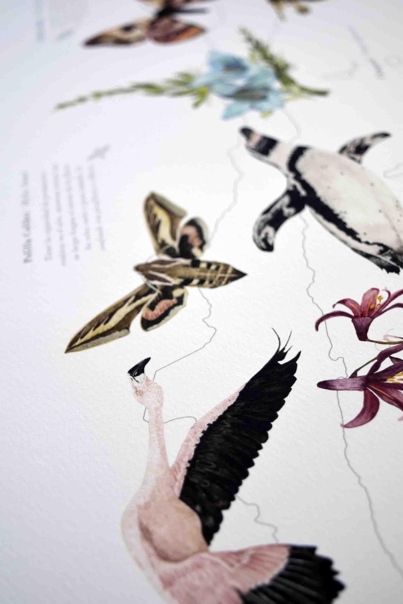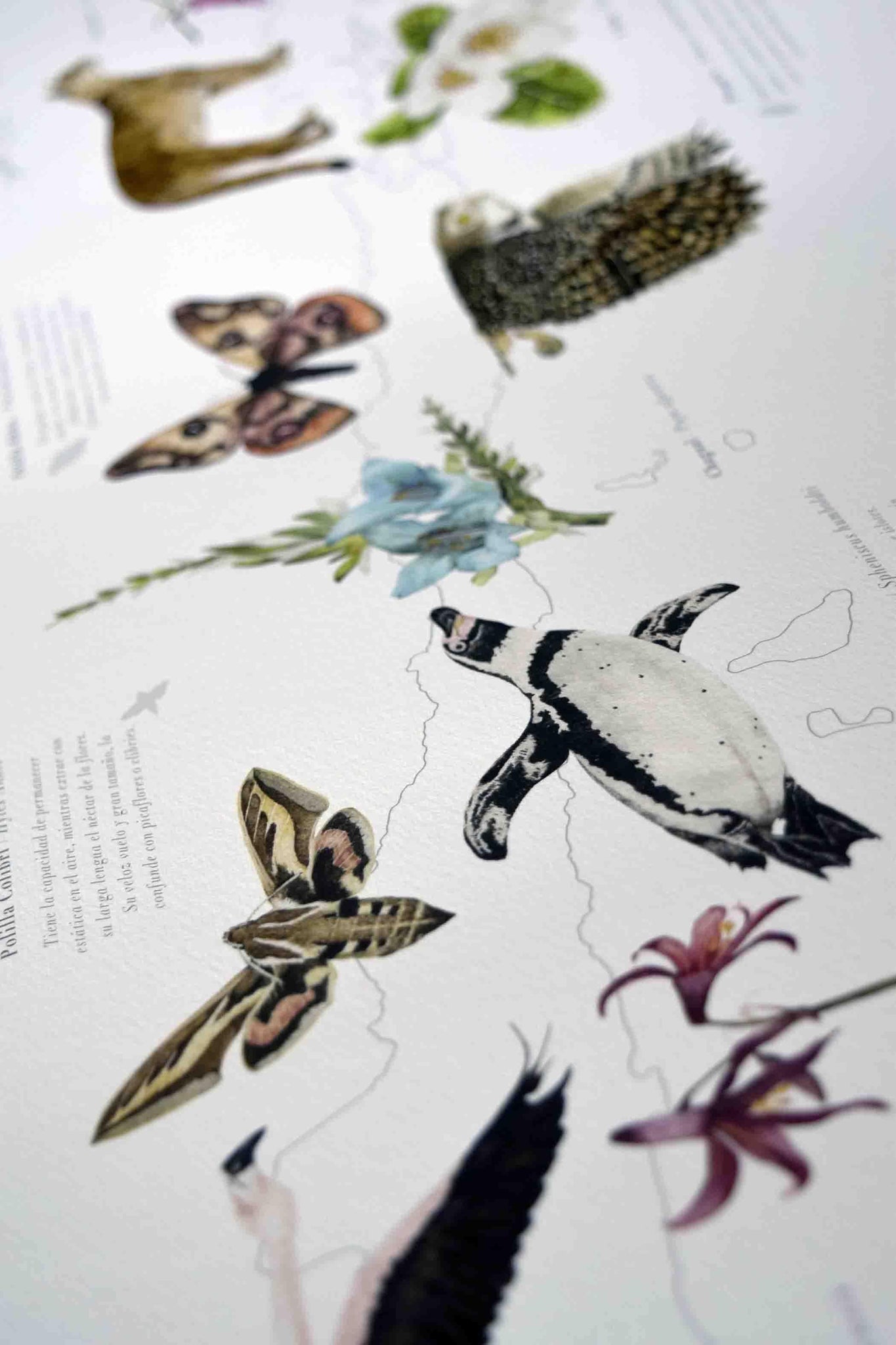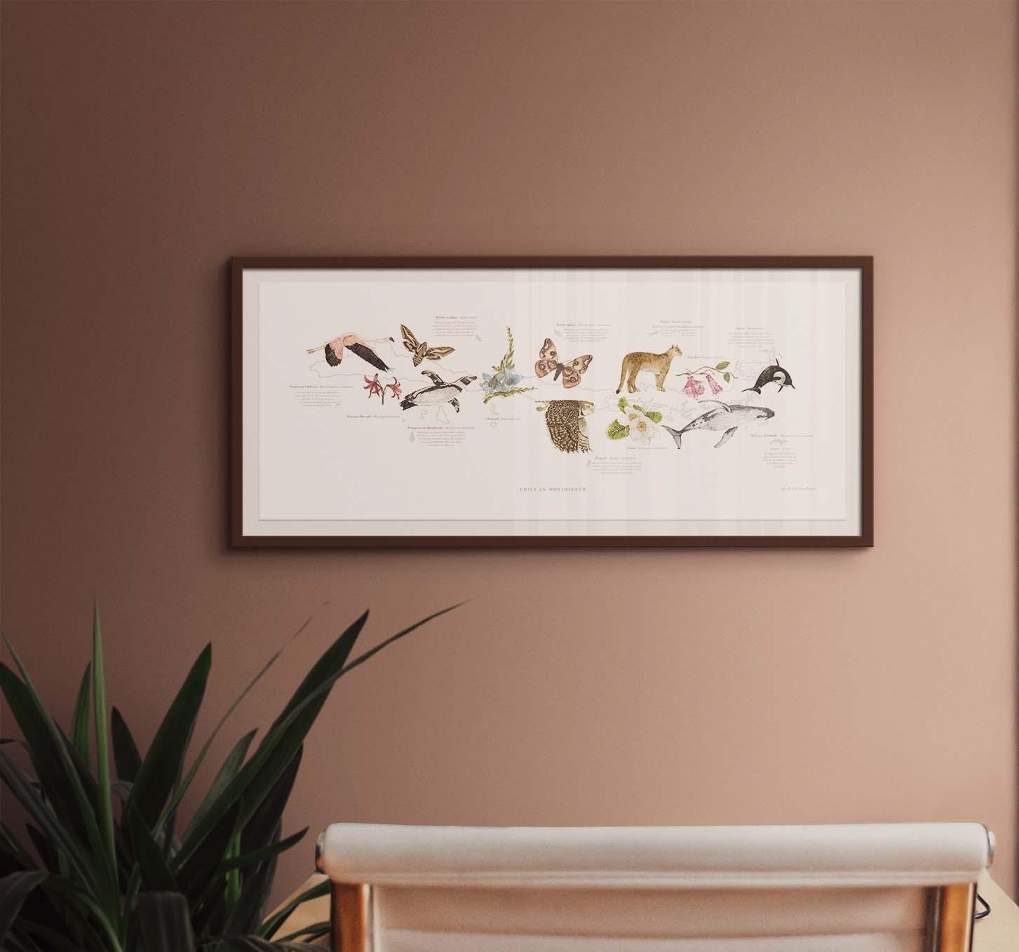 Cada cual tiene su propio camino y la forma en que lo recorre. “Chile en Movimiento” nace con las ganas de sentir la naturaleza a través del arte. Una recopilación de flora y fauna nativa, que nos permite viajar por Chile de norte a sur. A través de este mapa, te invito a observar detenidamente la belleza de algunas especies que habitan a lo largo de nuestro lindo país. Algunos vuelan, otros nadan, saltan, corren o reptan, criaturas fascinantes, flores, colores, detalles, siluetas que provocan sentimientos y deseos de teletransportarse a viajar junto a cada especie.