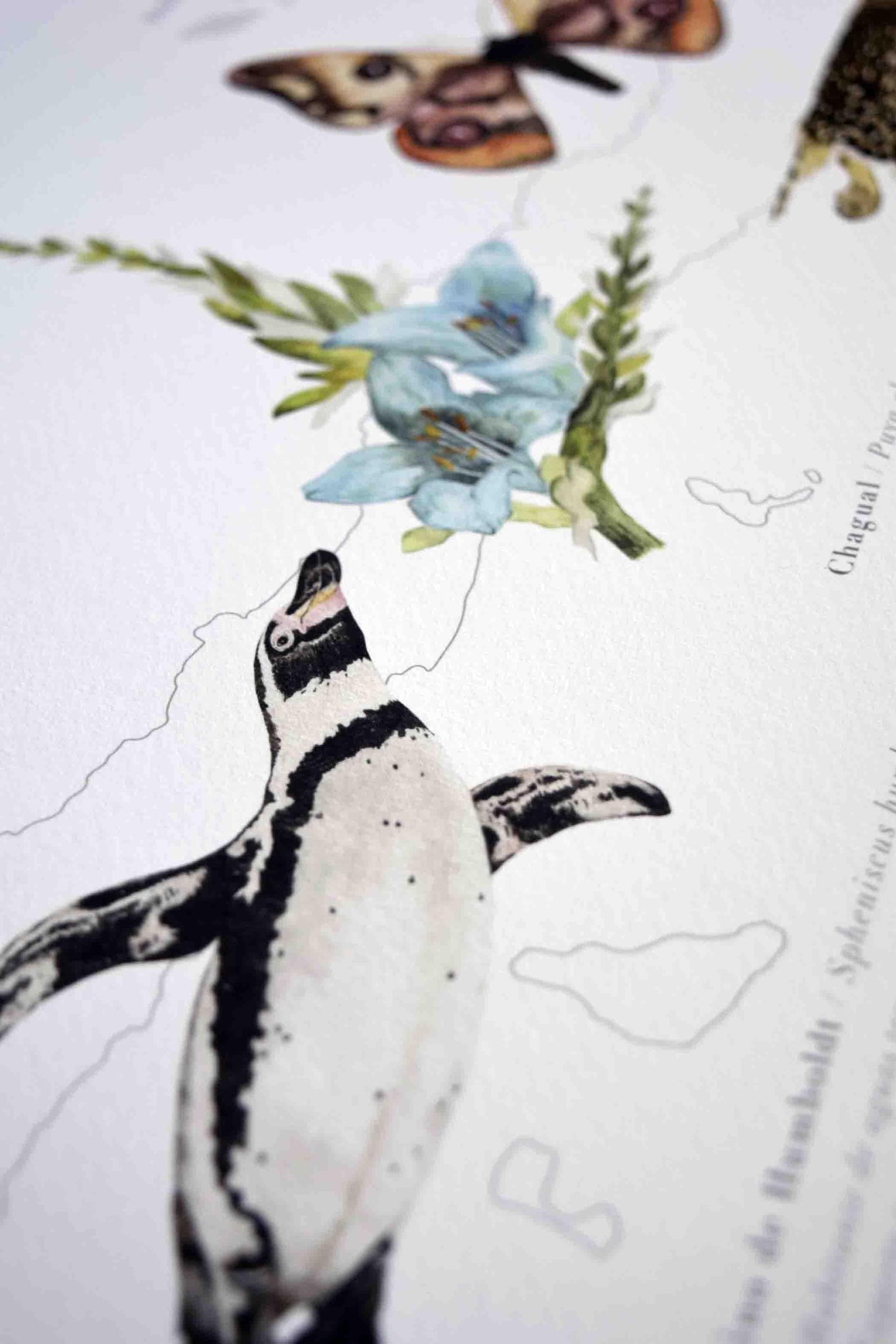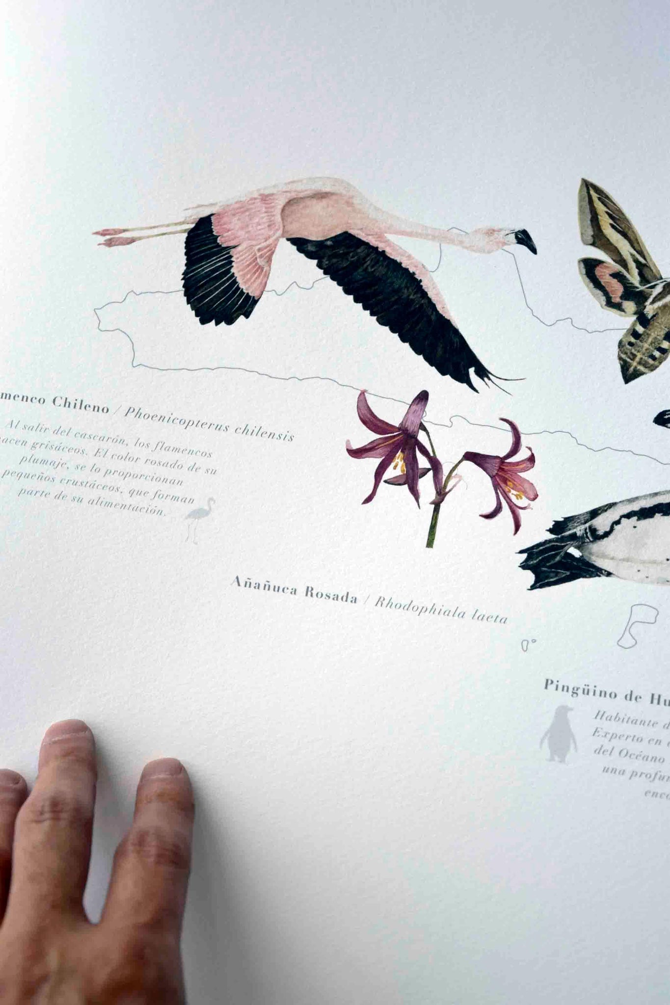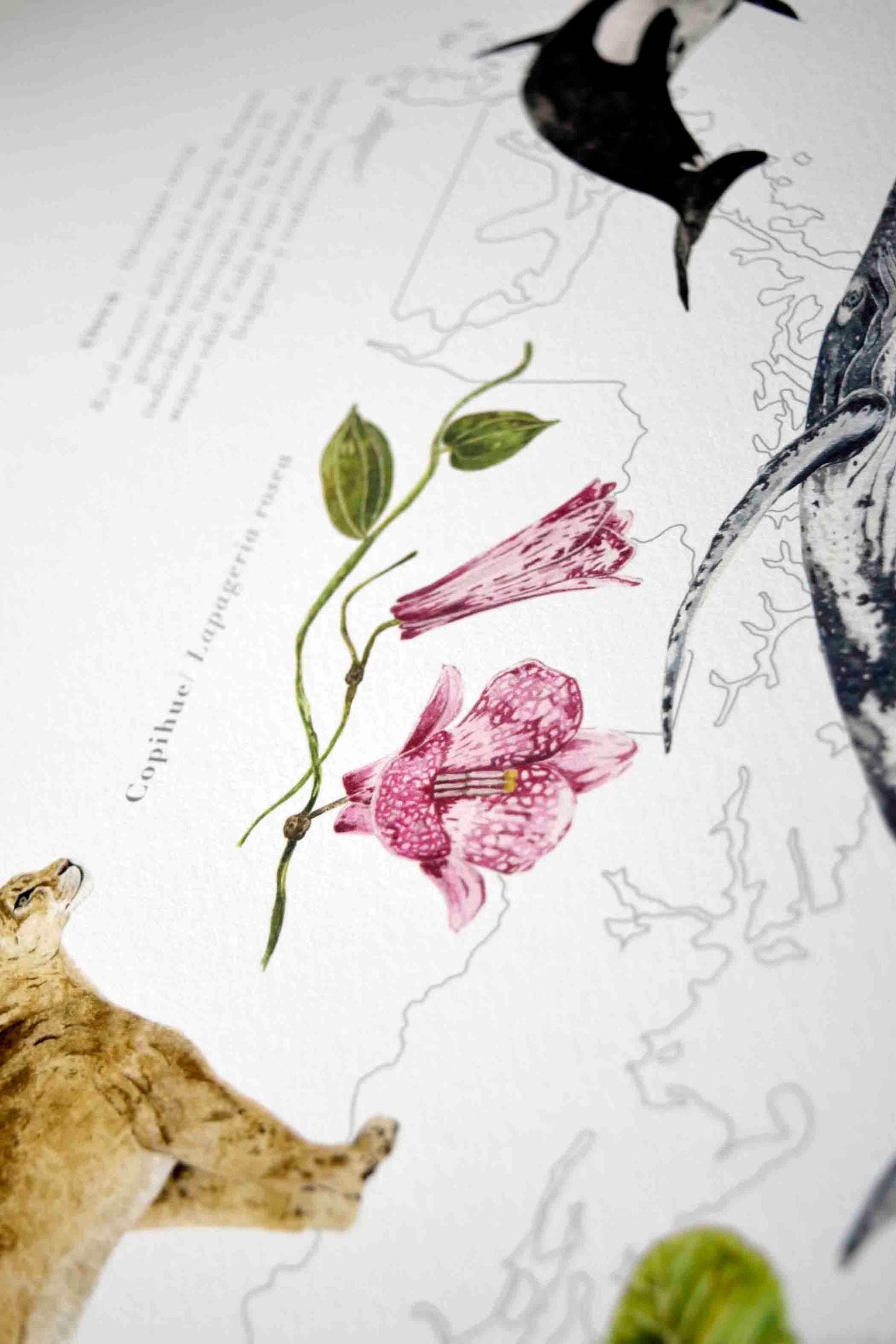 Ilustrado originalmente a mano en acuarela por Paz Vicuña Porzio/ @pazilvestre, 12 especies ubicadas geográficamente de norte a sur, realizadas con mucho cariño para ser parte de algún espacio lleno de amor.