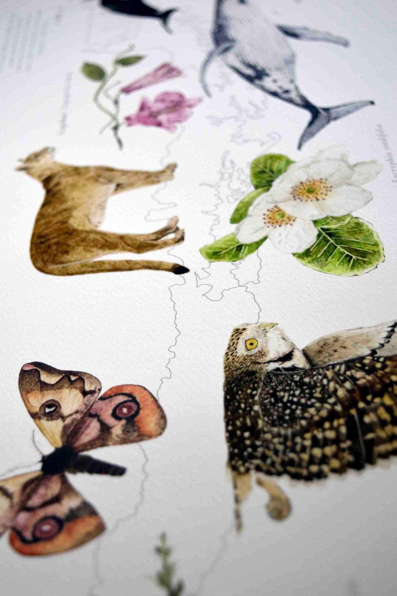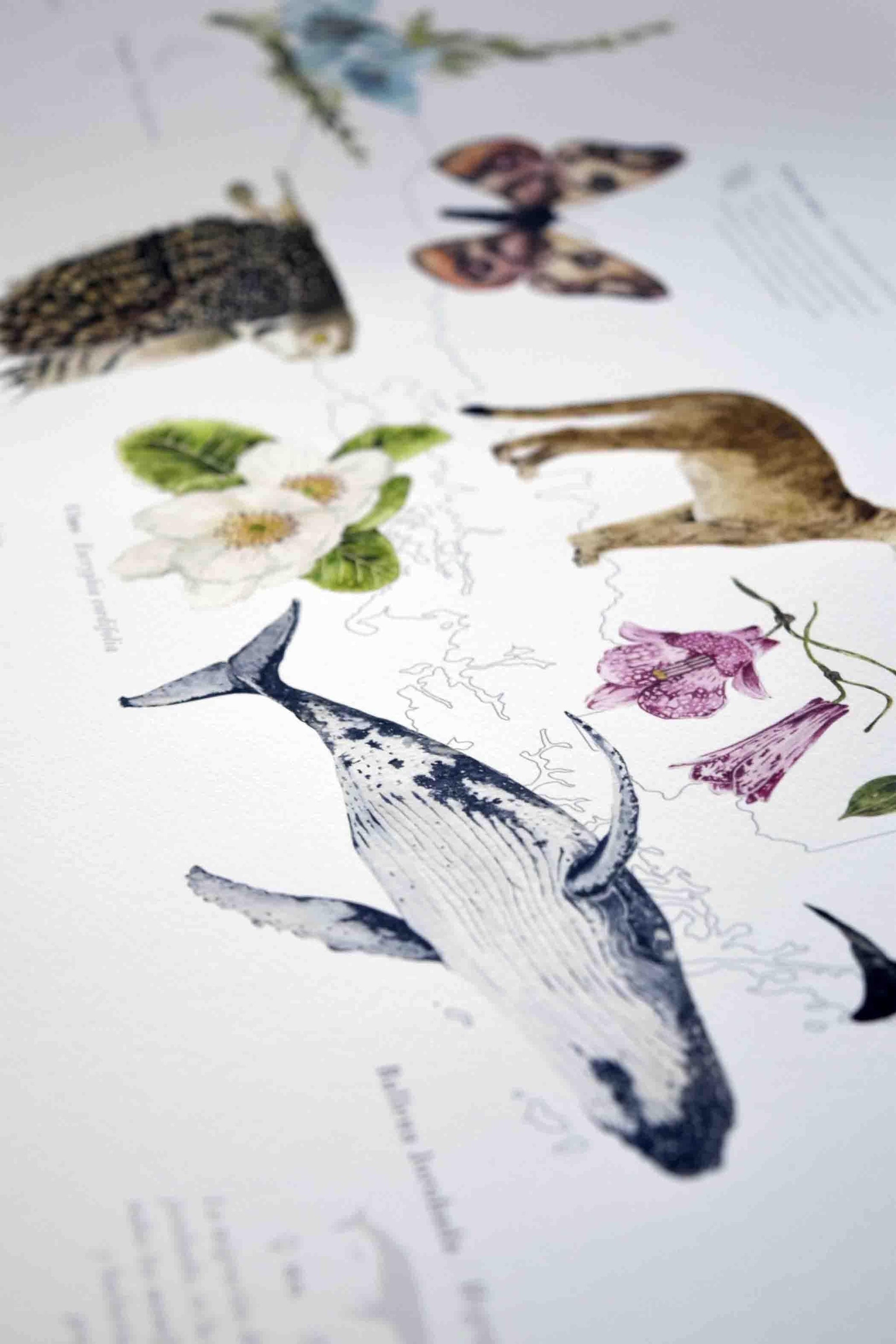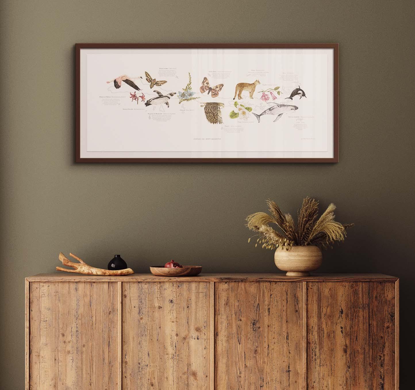 Ilustrado originalmente a mano en acuarela por Paz Vicuña Porzio/ @pazilvestre, 12 especies ubicadas geográficamente de norte a sur, realizadas con mucho cariño para ser parte de algún espacio lleno de amor.