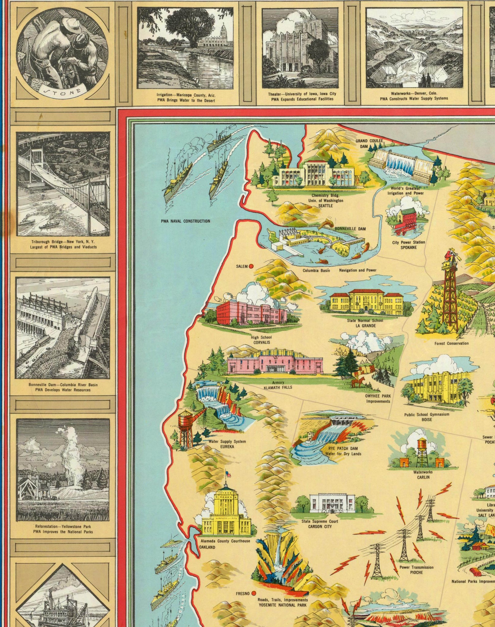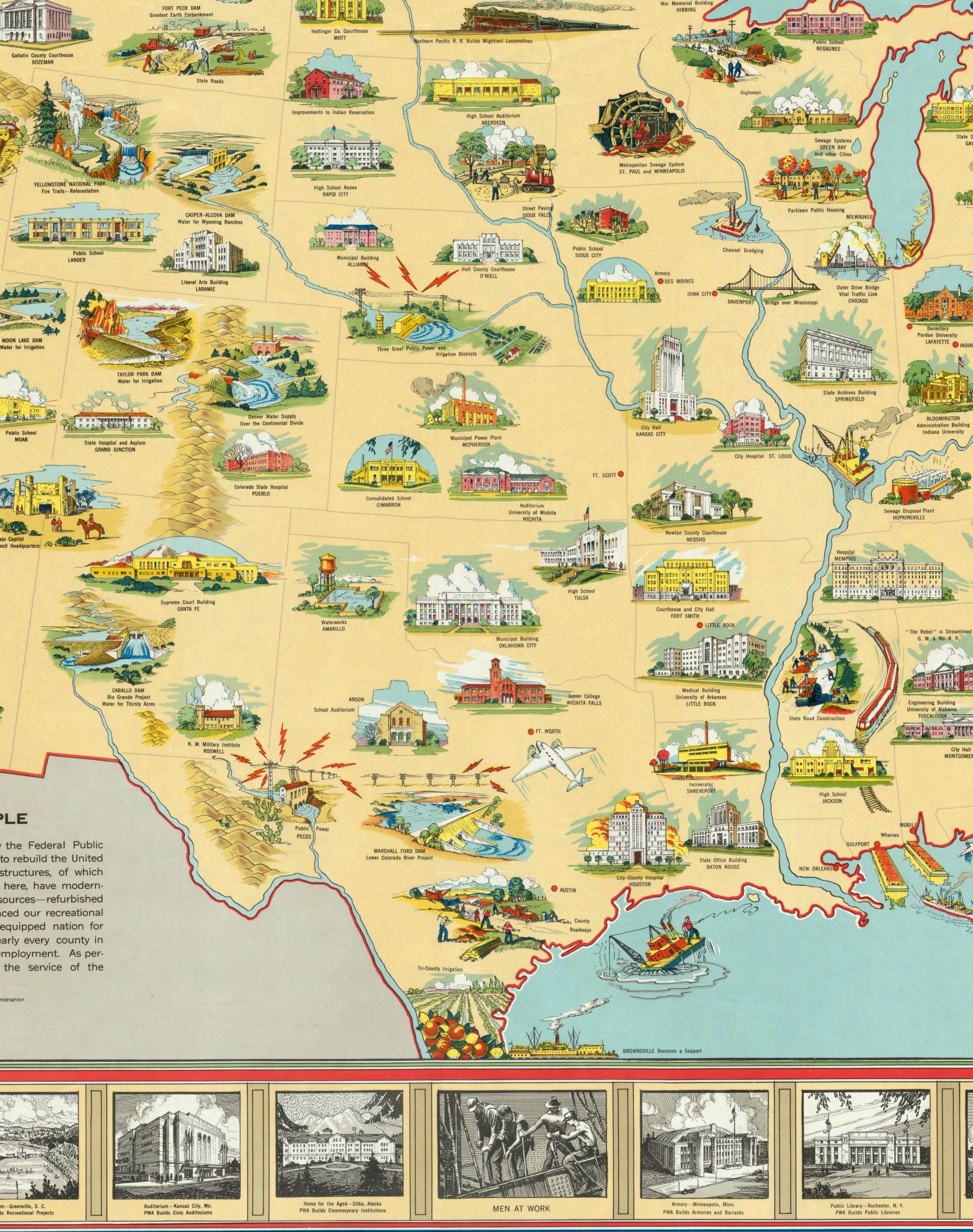 Mapa grande de los Estados Unidos que muestra en ilustraciones y en los bordes muchos de los proyectos de la Administración de Obras Públicas del país (PWA).