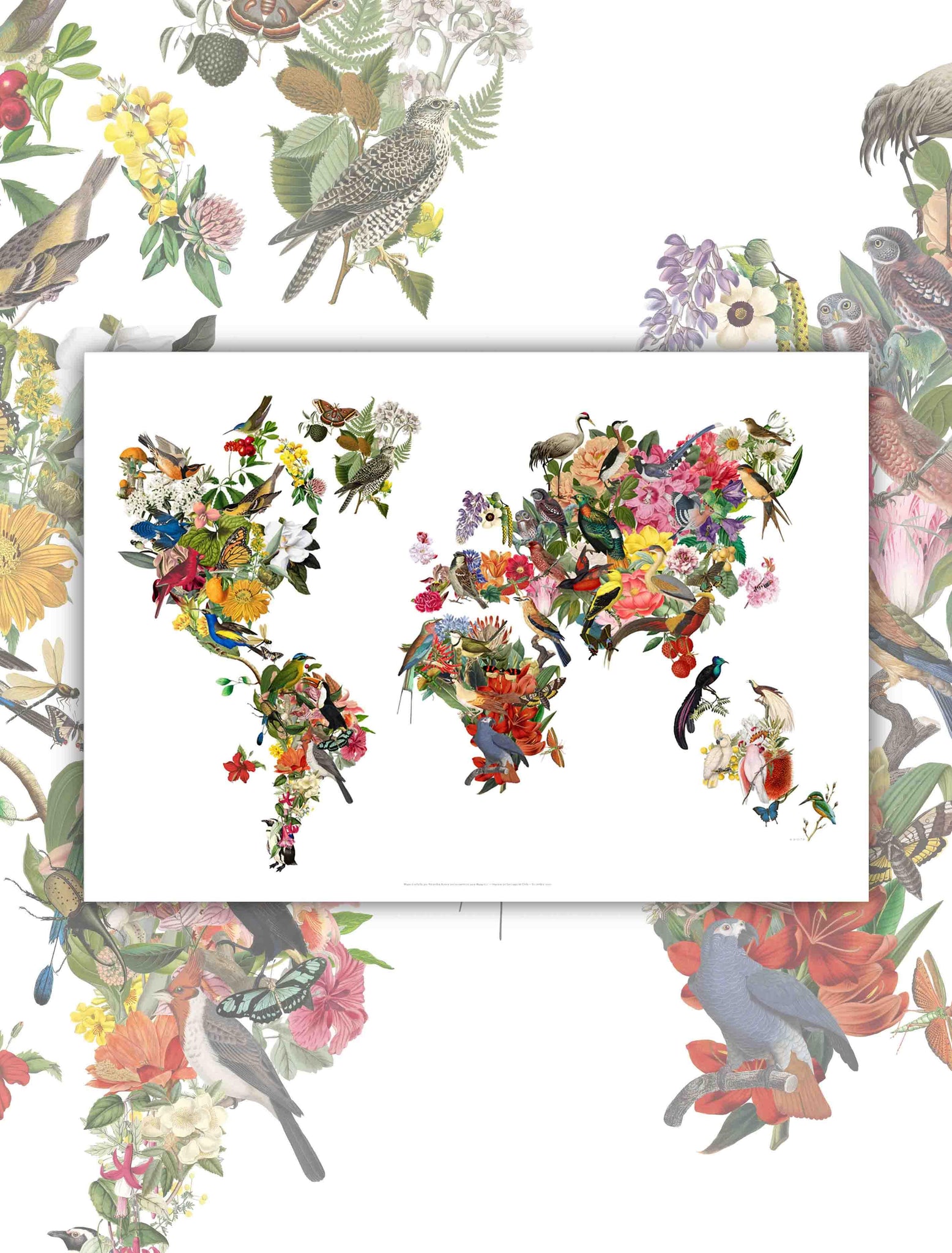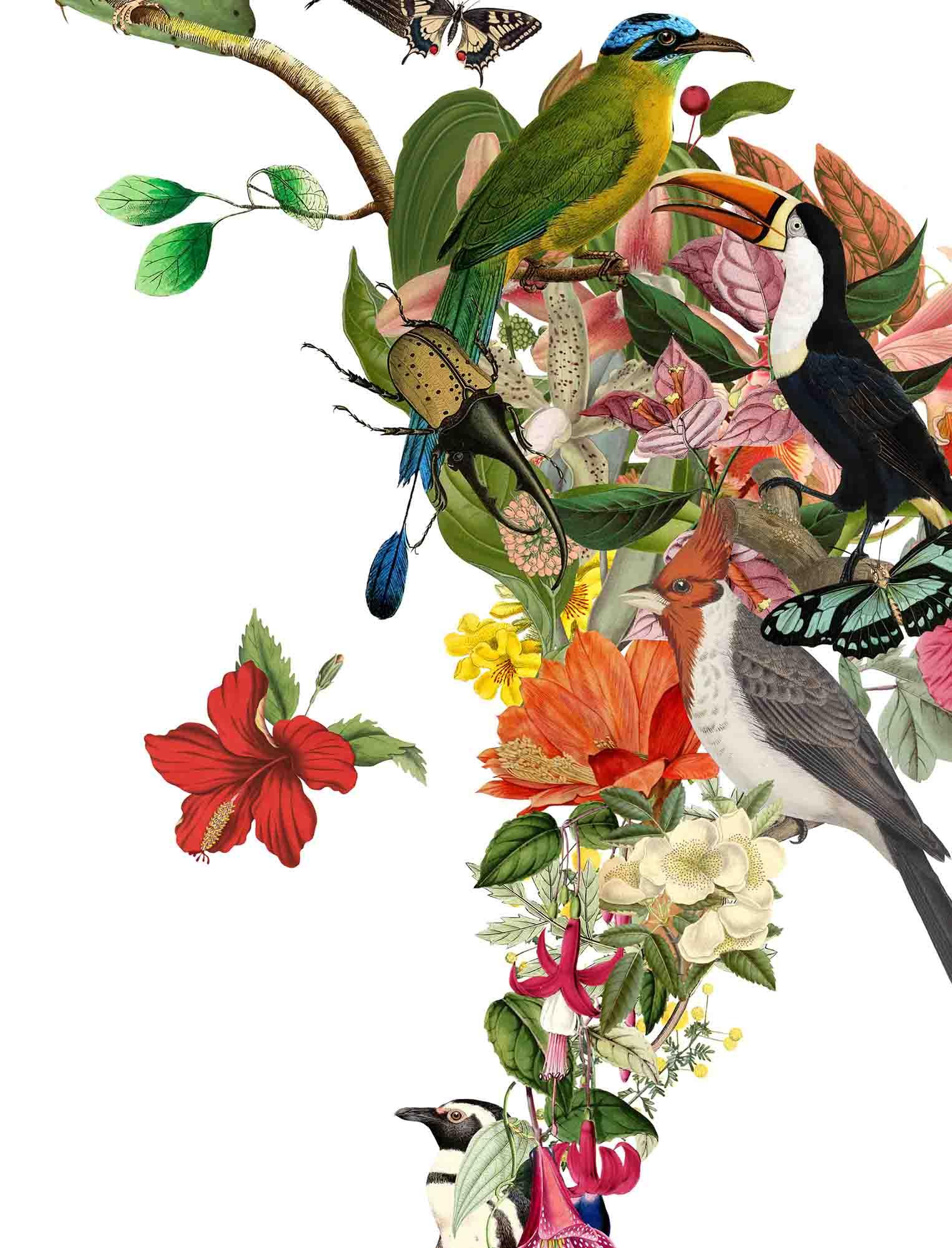 Descubrirás detalles únicos de la flora, aves e insectos de cada uno de los continentes, en este hermoso collage de gran formato.