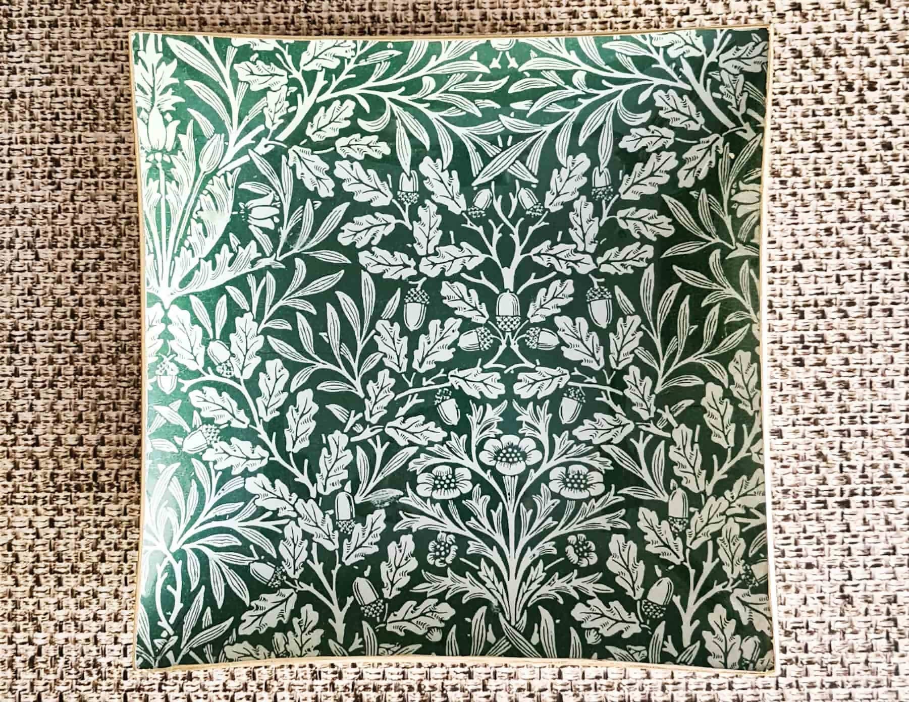 Plato cuadrado de vidrio templado de 30 cm, con tratamiento artesanal de decoupage. Apto para el lavado a mano y para el uso de comidas o elementos calientes sobre la superficie.
