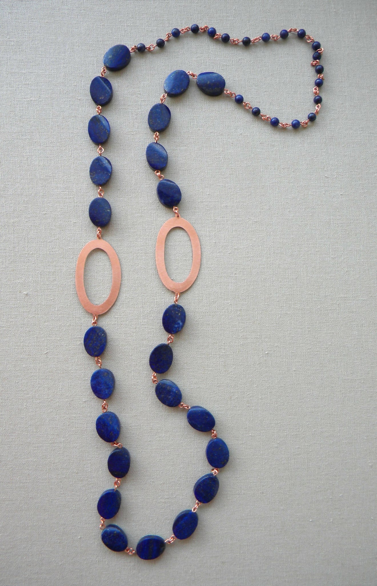 Está hecho a mano en cobre con piedras semipreciosas de lapislázuli ovaladas grandes y con volumen junto con dos argollas de cobre ovaladas grandes de 5cm de largo por 3cm de ancho.