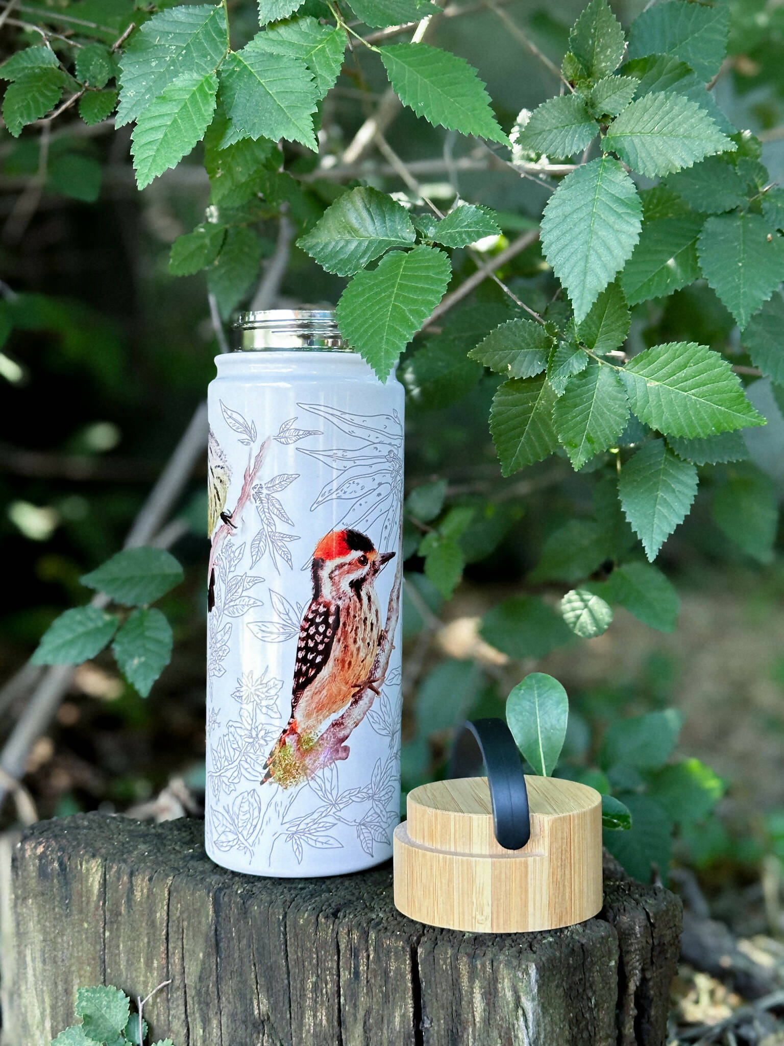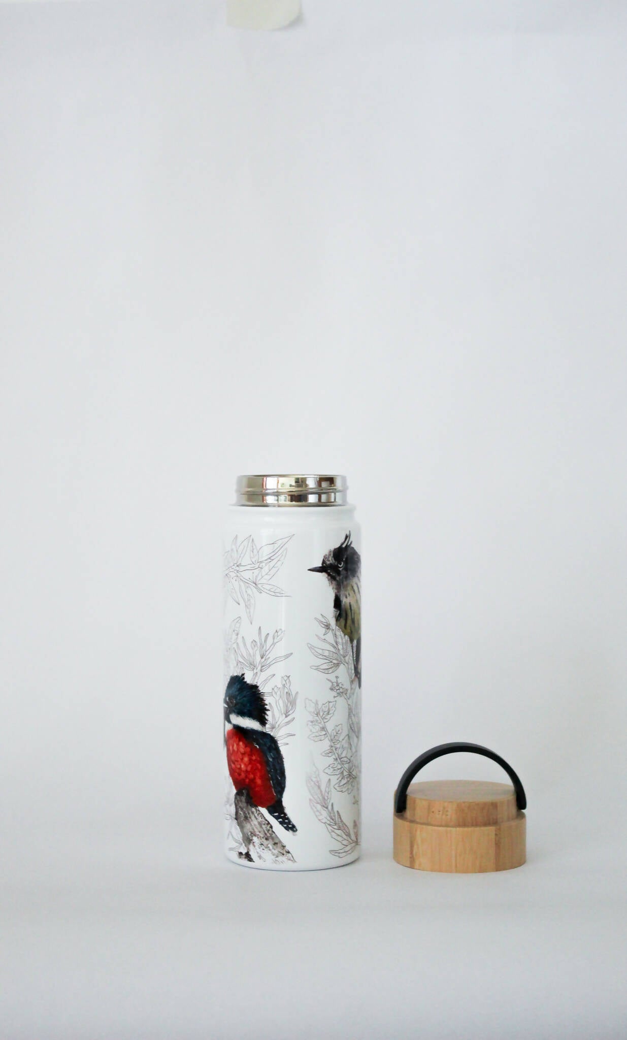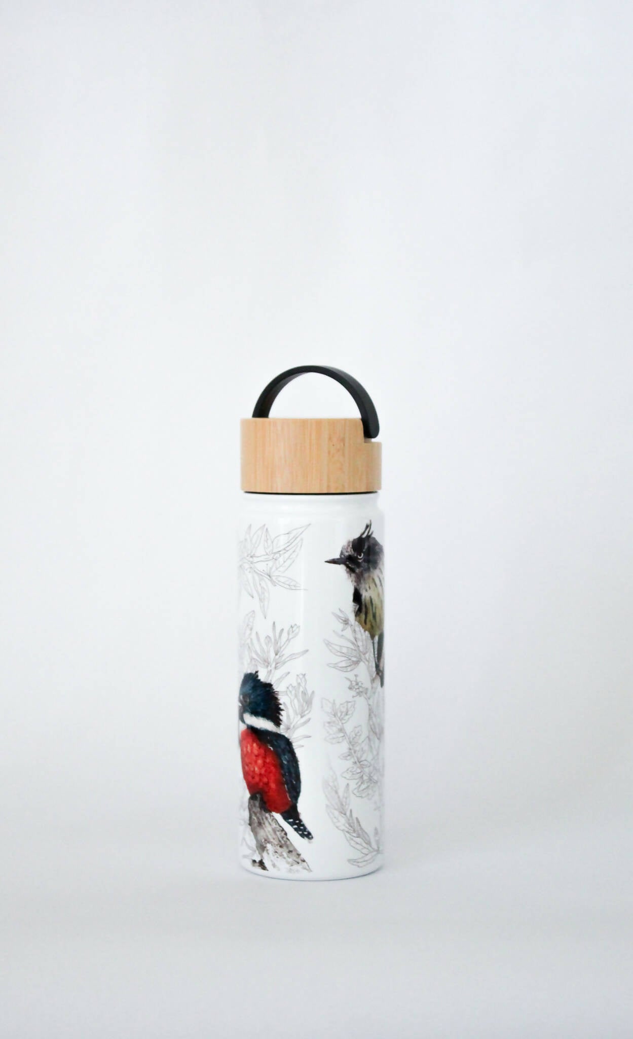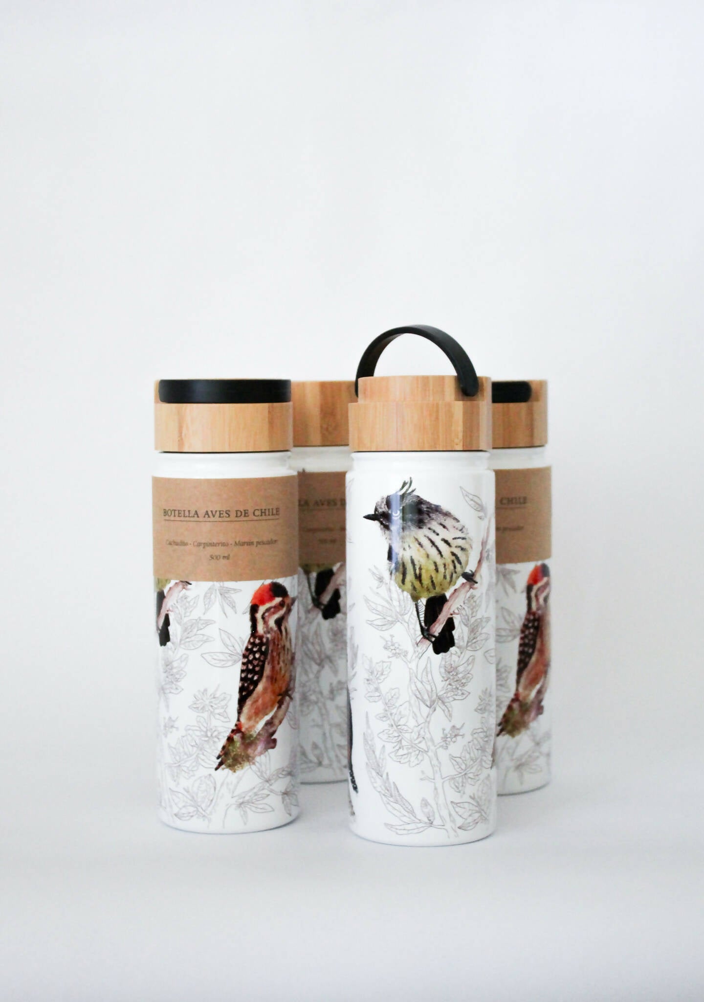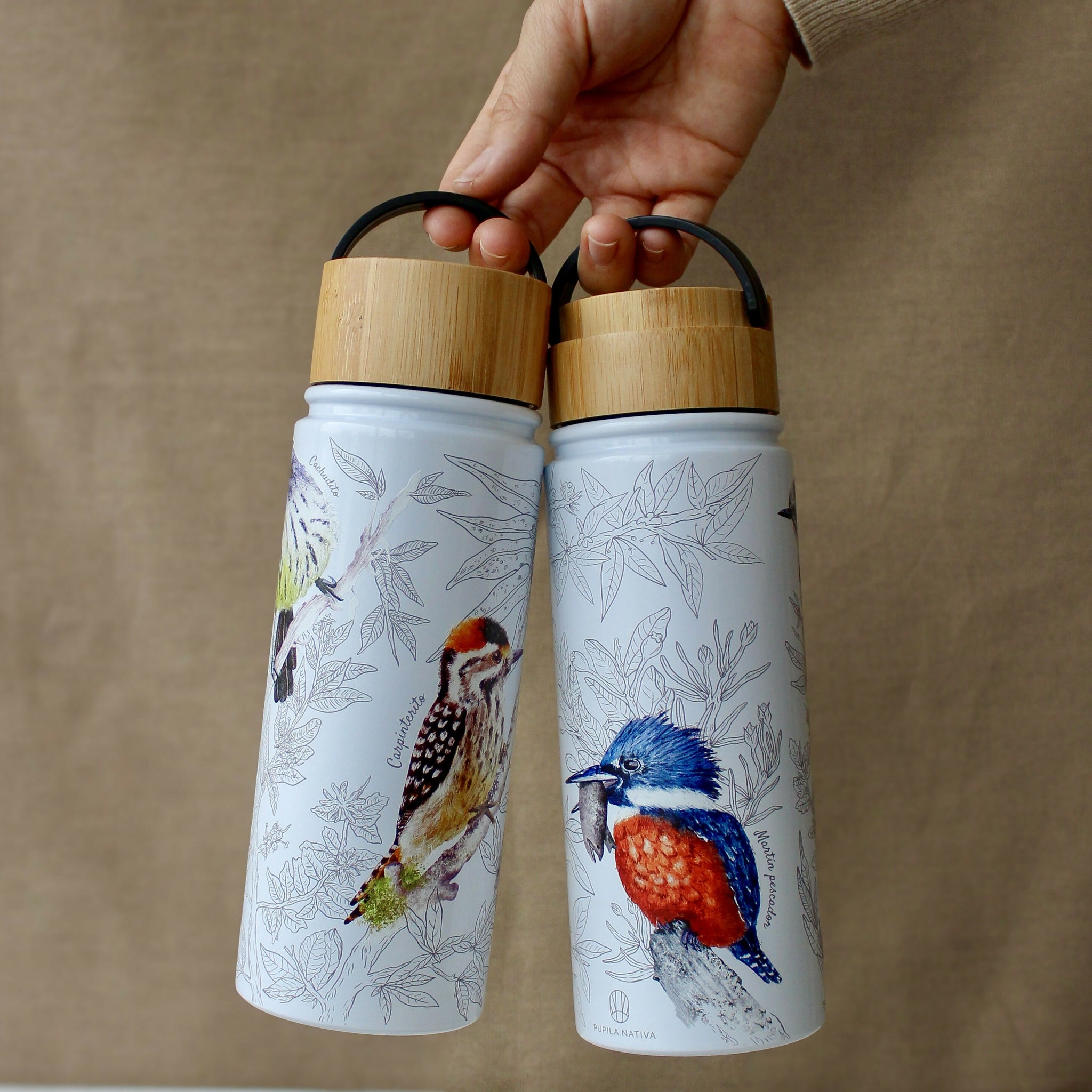 Sal a explorar la naturaleza y mantente hidratado con nuestra botella con 3 aves nativas ilustradas. Encuentra al Cachudito, Carpinterito y al Martín pescador.