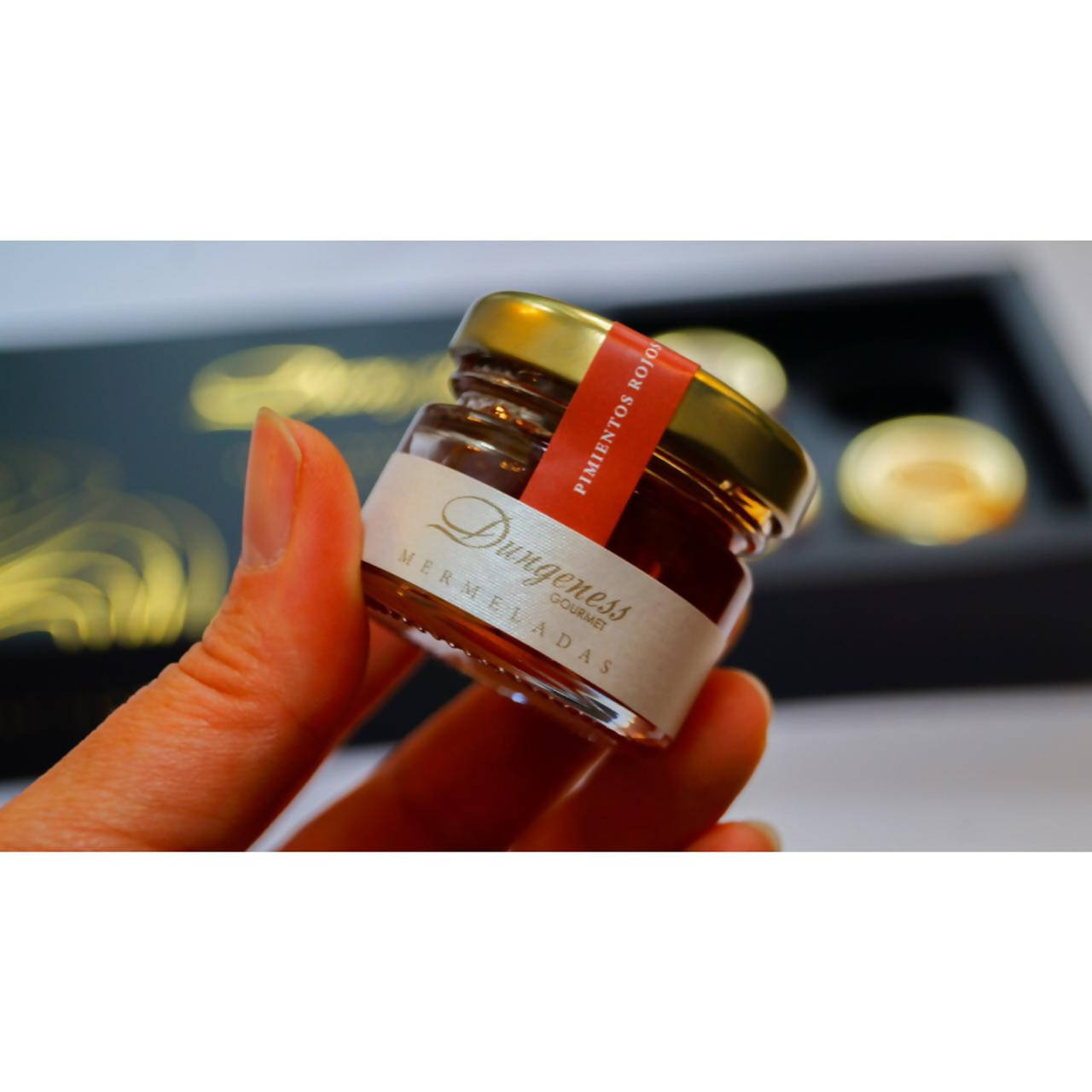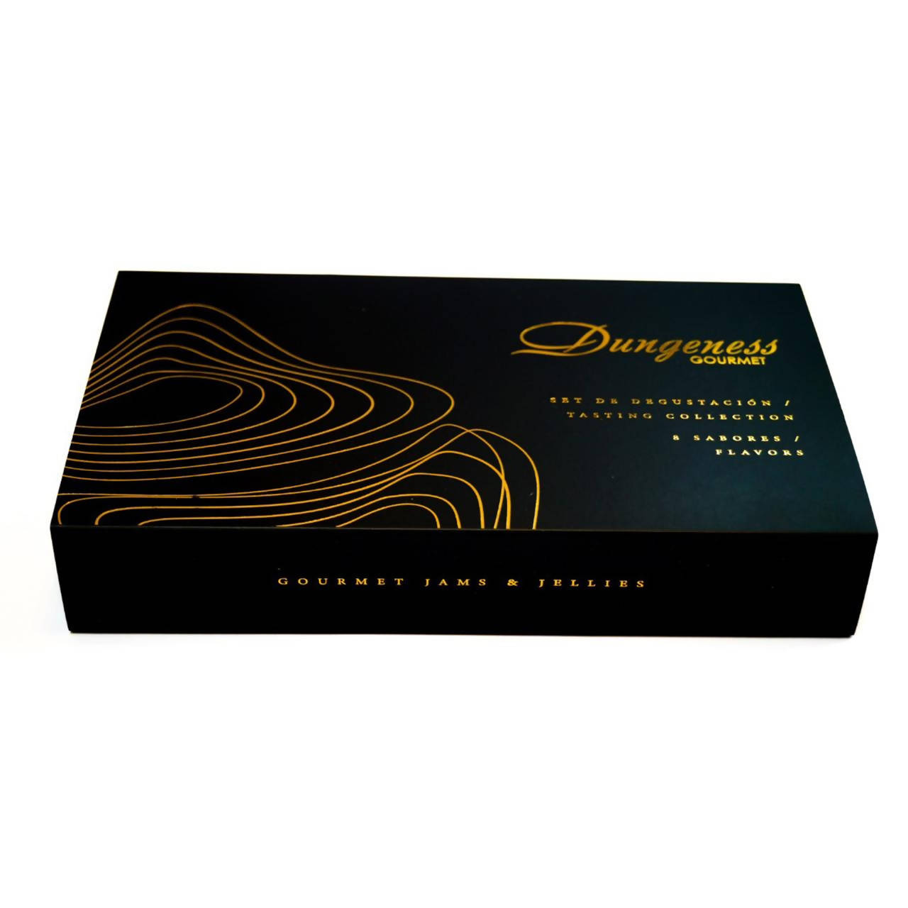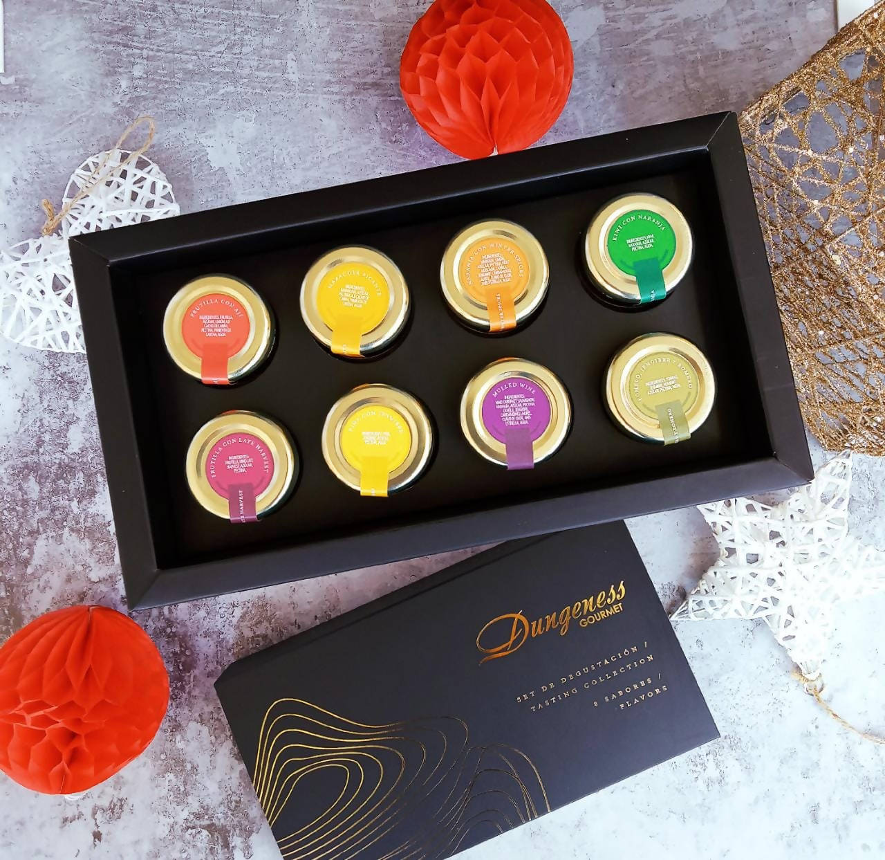 Este elegante set de degustación de mermeladas Dungeness Gourmet trae 8 sabores surtidos, en frascos de formato pequeño (30g).