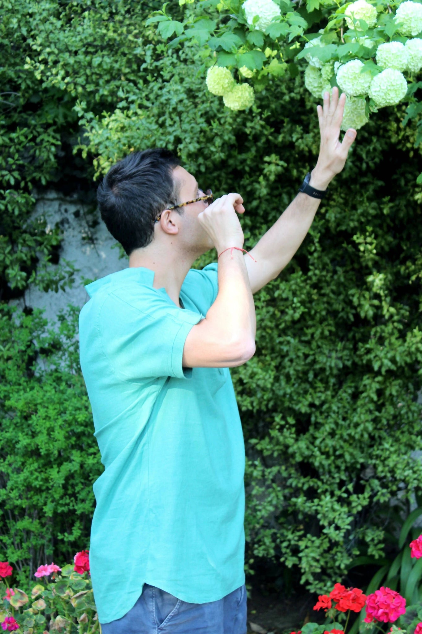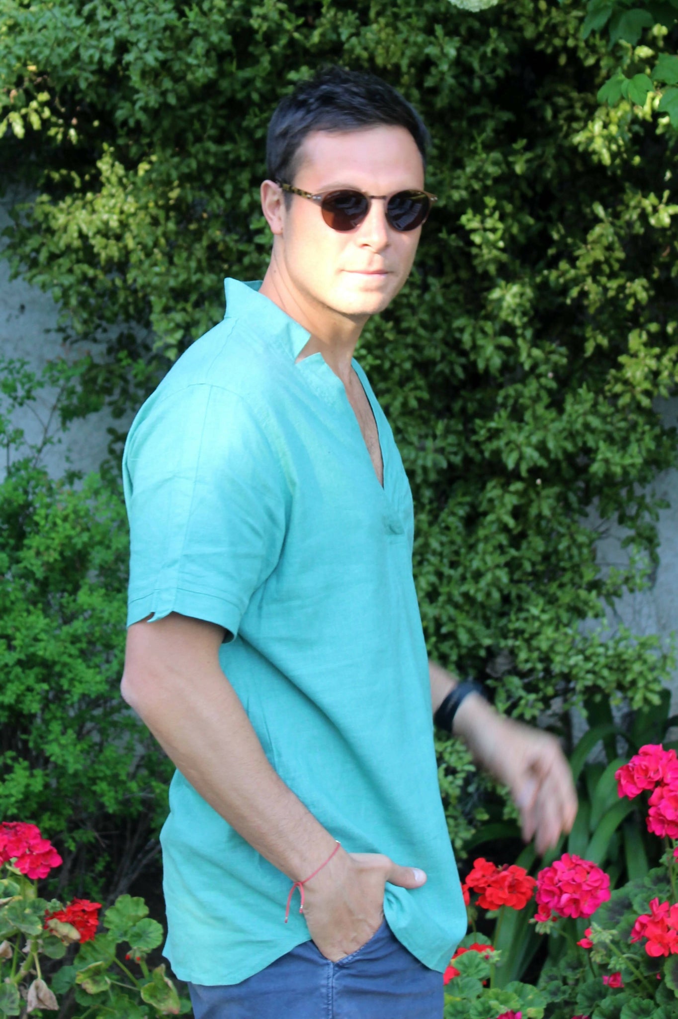 Camisa Verde de hombre 80% lino y 20% viscosa hecha en India, con un diseño fresco y meditarraneo. Diseño Chileno.