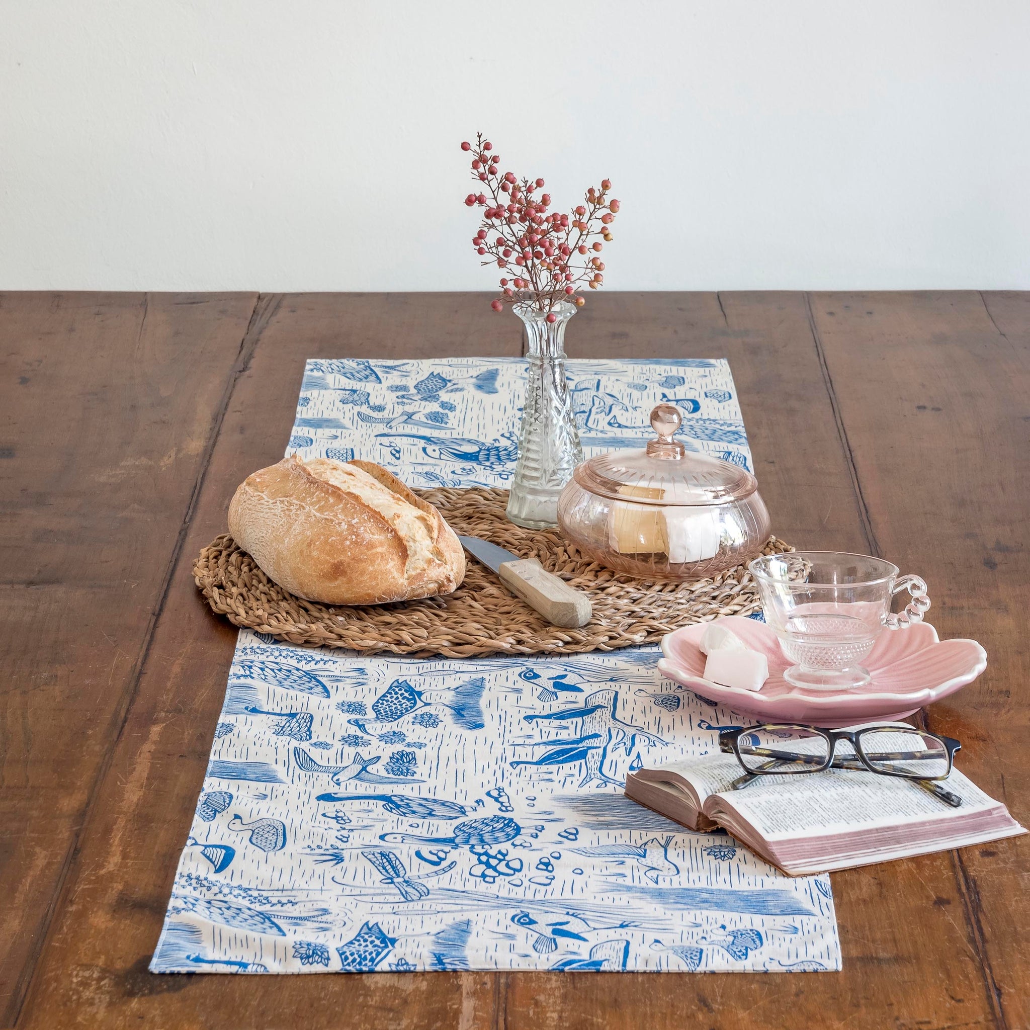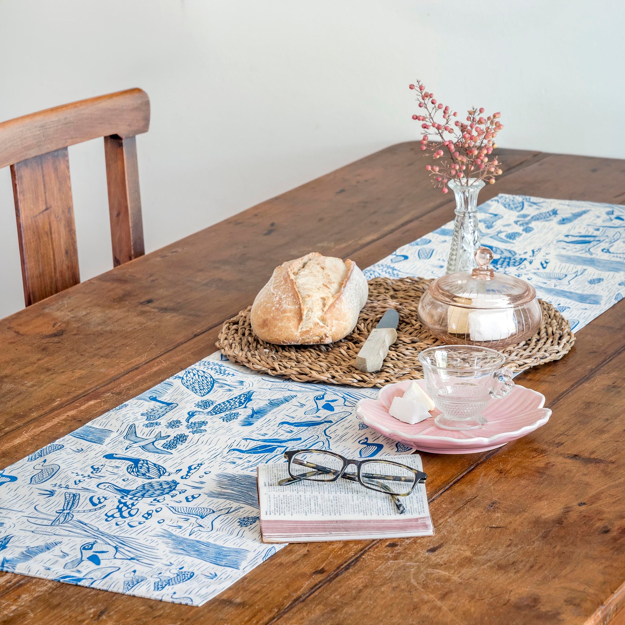 Camino de mesa estampado en serigrafía con ilustraciones exclusivas realizadas por Hued hued. Humedal es una hermosa colección que rescata las aves, insectos y animales que conviven juntos en los humedales del litoral Chileno, entre lagunas, canales y totoras. Recorriendo este ecosistema único, podemos observar las más variadas especies, cómo el Cisne de cuello negro, el Siete Colores, la Garza Gris, la Garza Grande, el Pato Real, la Tagua, el Pelícano, la libélula y el Zarapito.