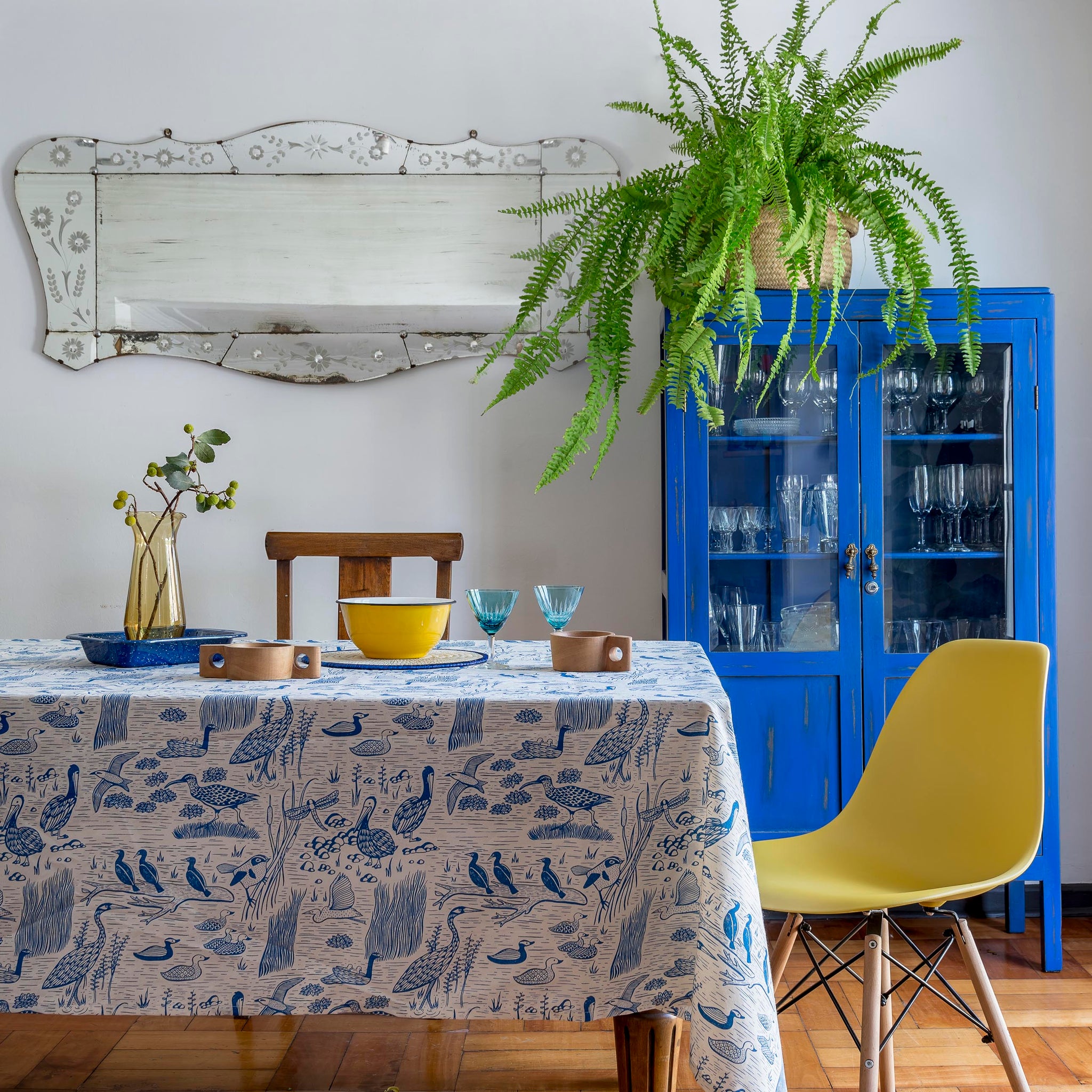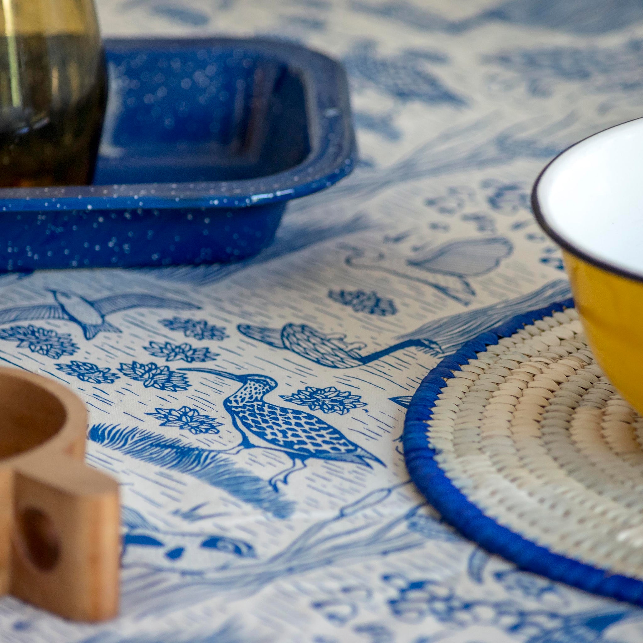 Mantel estampado en serigrafía con ilustraciones exclusivas realizadas por Hued hued. Humedal es una hermosa colección que rescata las aves, insectos y animales que conviven juntos en los humedales del litoral Chileno, entre lagunas, canales y totoras. Recorriendo este ecosistema único, podemos observar las más variadas especies, cómo el Cisne de cuello negro, el Siete Colores, la Garza Gris, la Garza Grande, el Pato Real, la Tagua, el Pelícano, la libélula y el Zarapito.