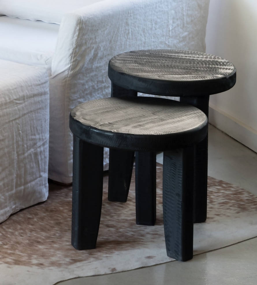 Mesas laterales de madera de distintos tamaños, teñido en color negro.Imagen de referencia: Madera de Pino, tratamiento teñida negro. Medidas: (Diámetro x Alto) 37 x 35 / 37 x 42