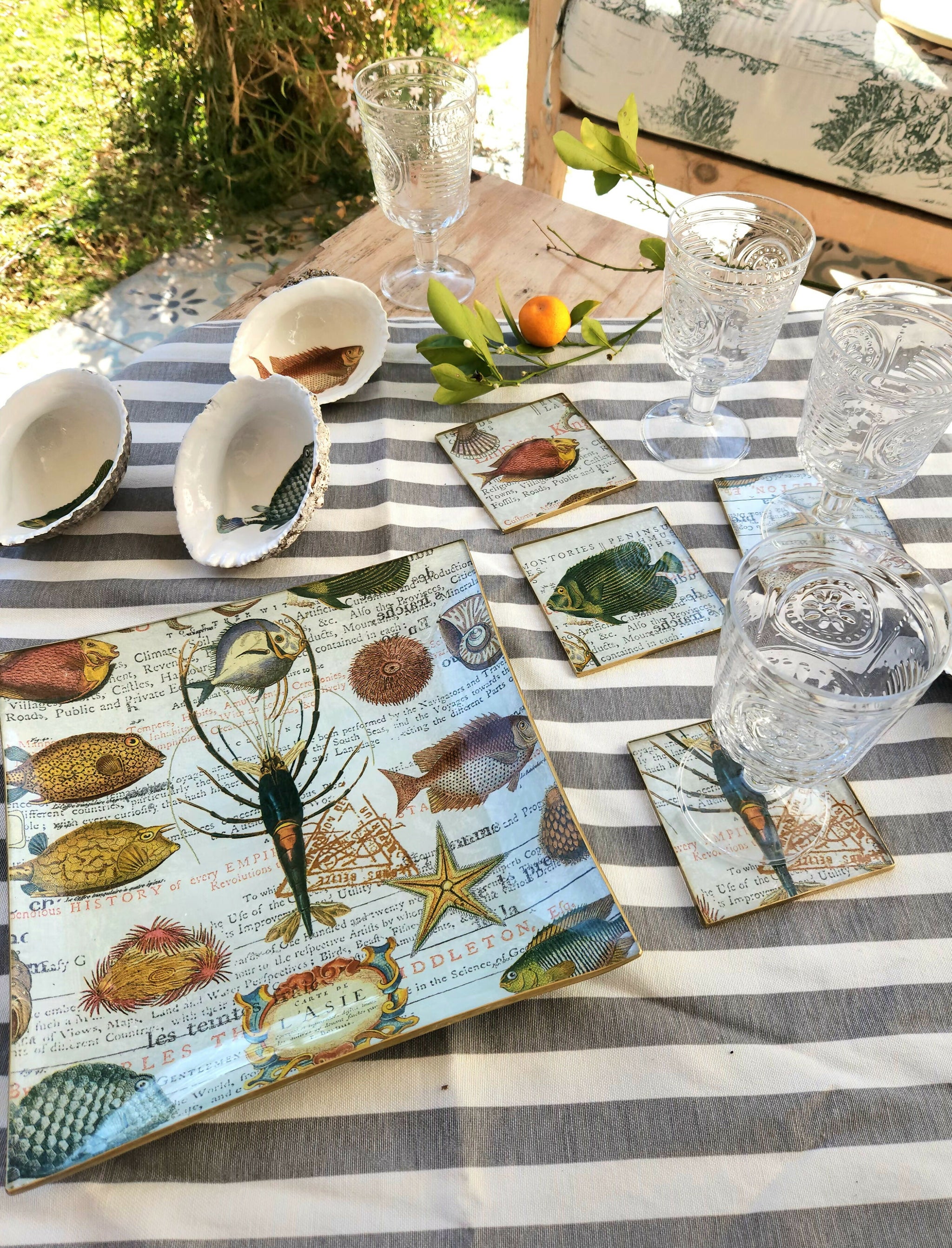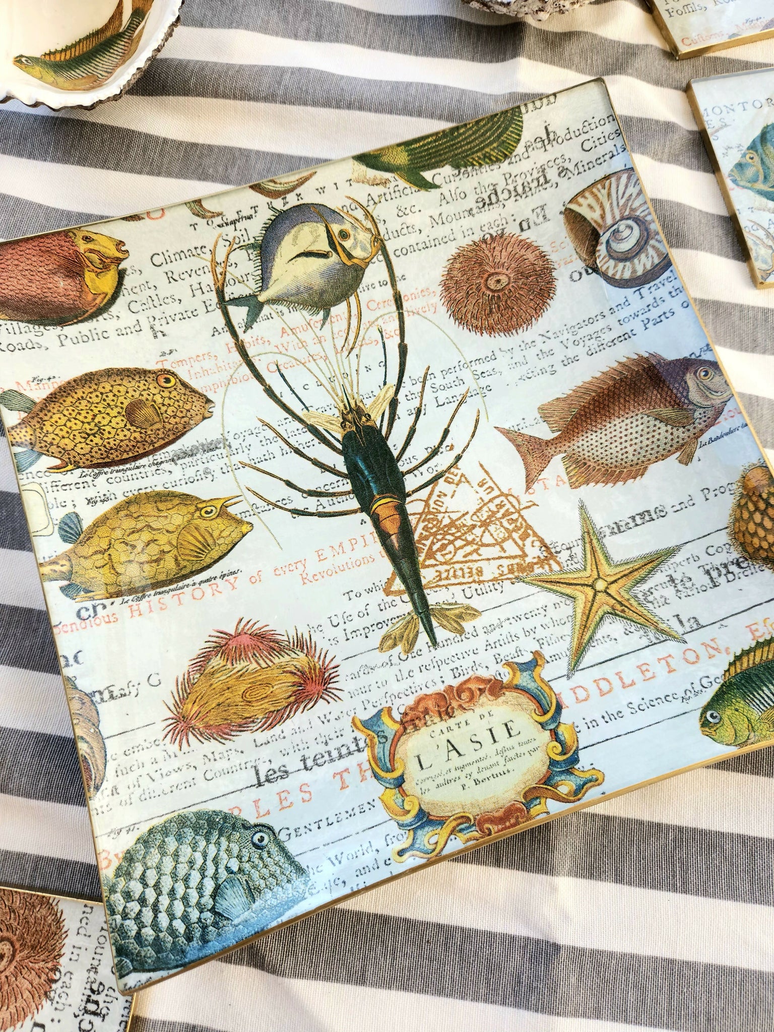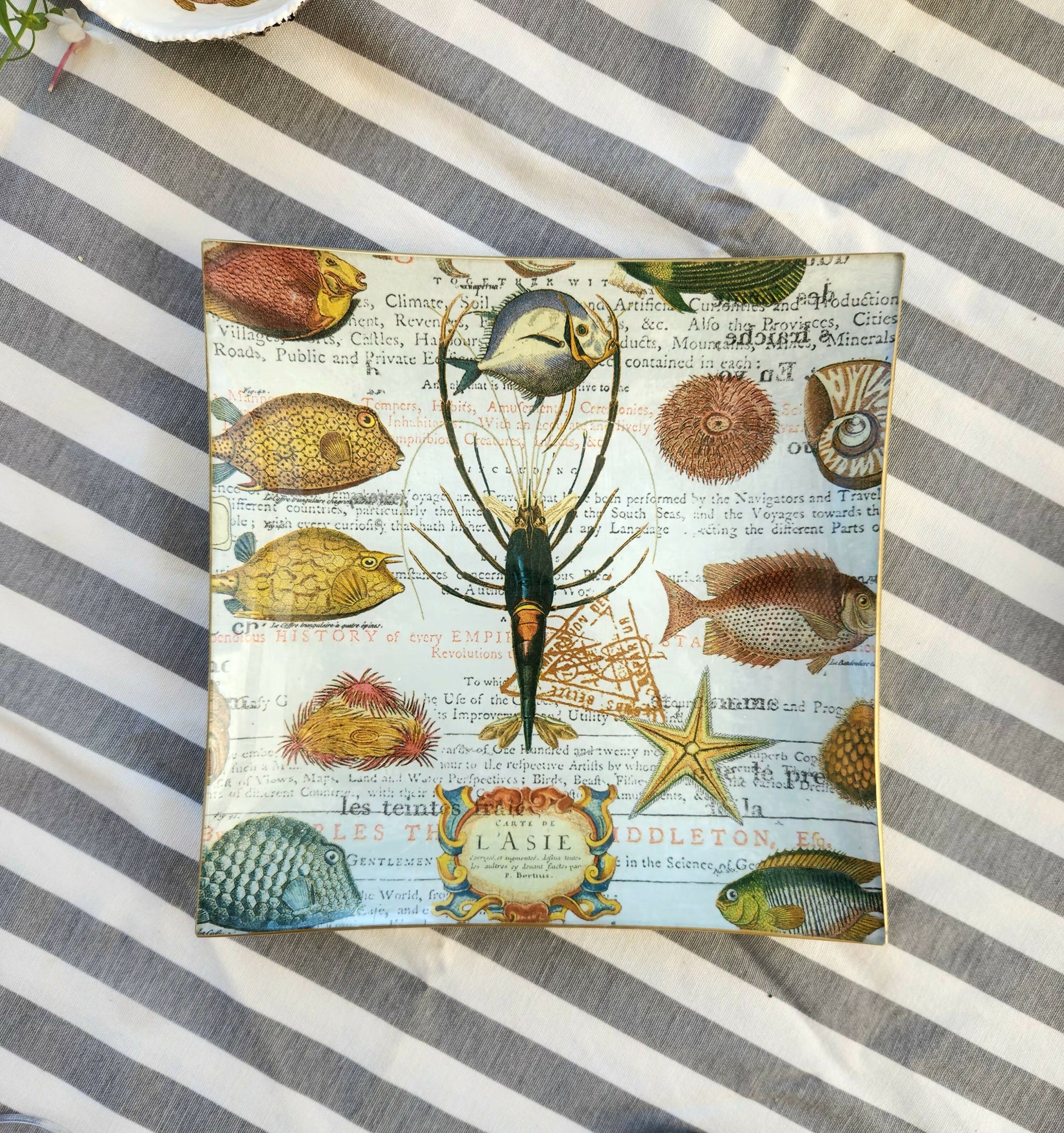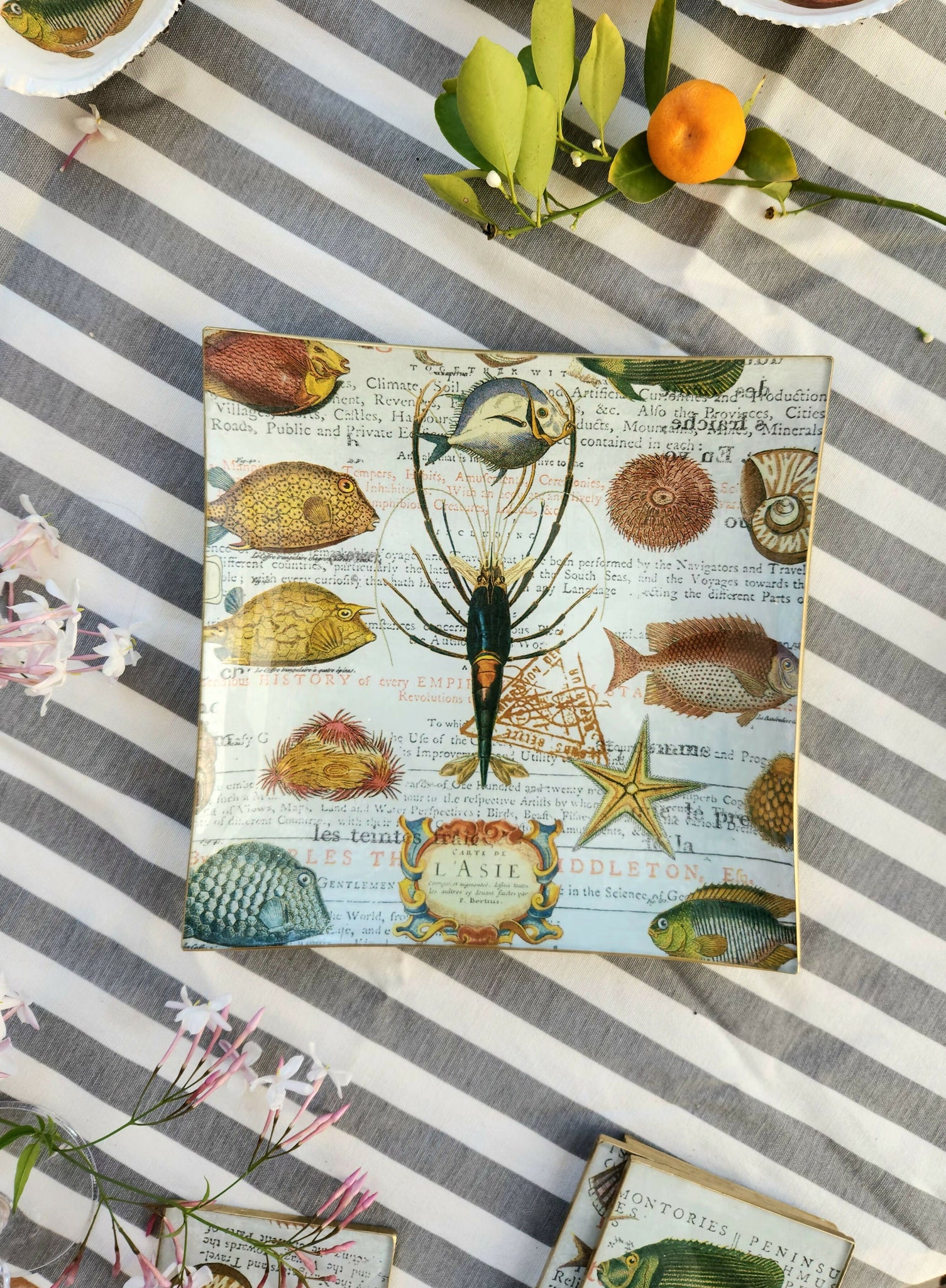 Plato cuadrado de vidrio templado de 30 cm, con tratamiento artesanal de decoupage. Apto para el lavado a mano y para el uso de comidas o elementos calientes sobre la superficie.