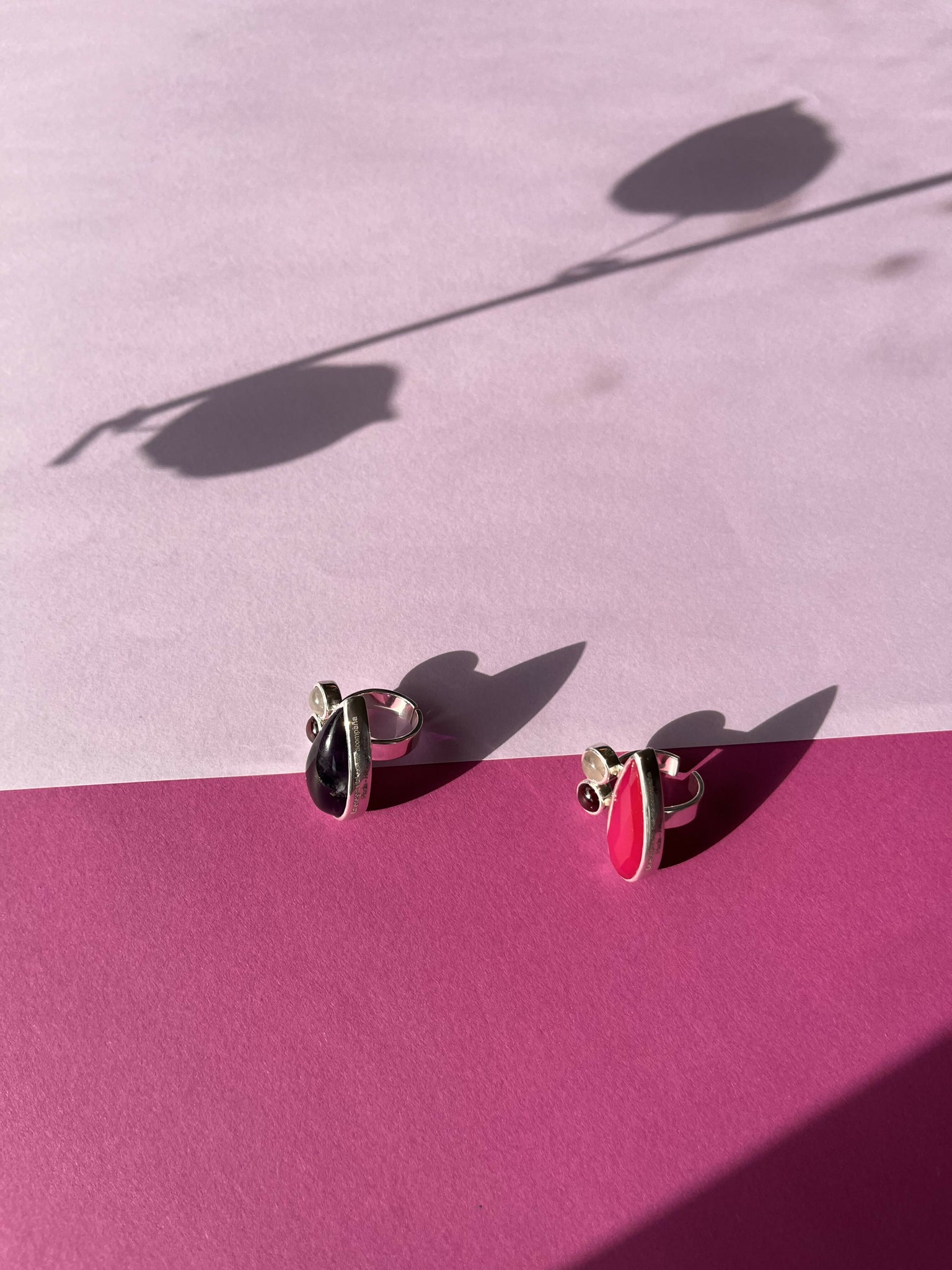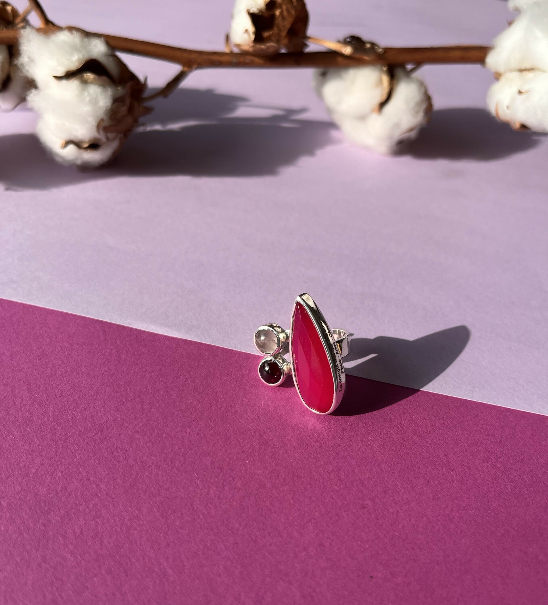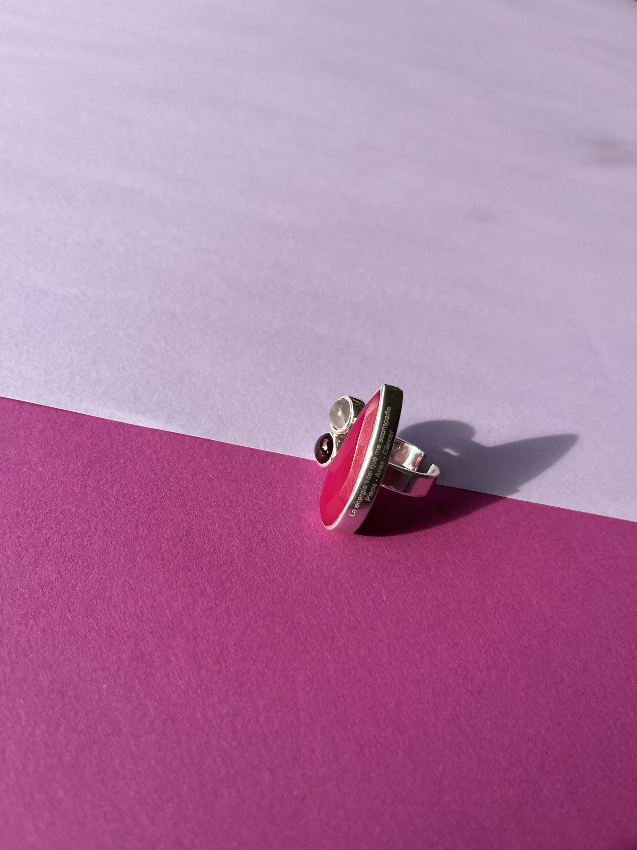 Anillo ajustable "La fuerza vital que VIVE en MI" plata Calcedonia granate y piedra luna