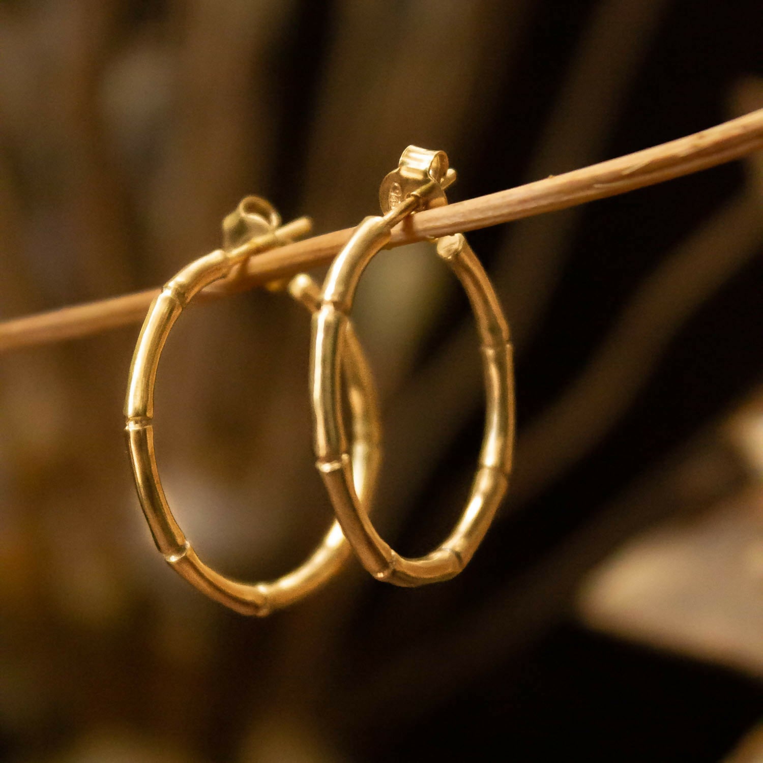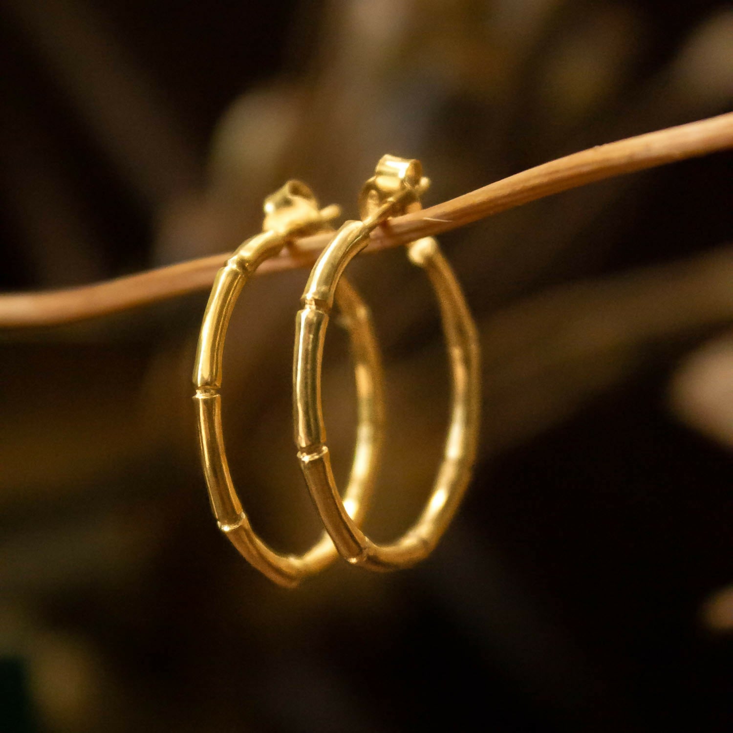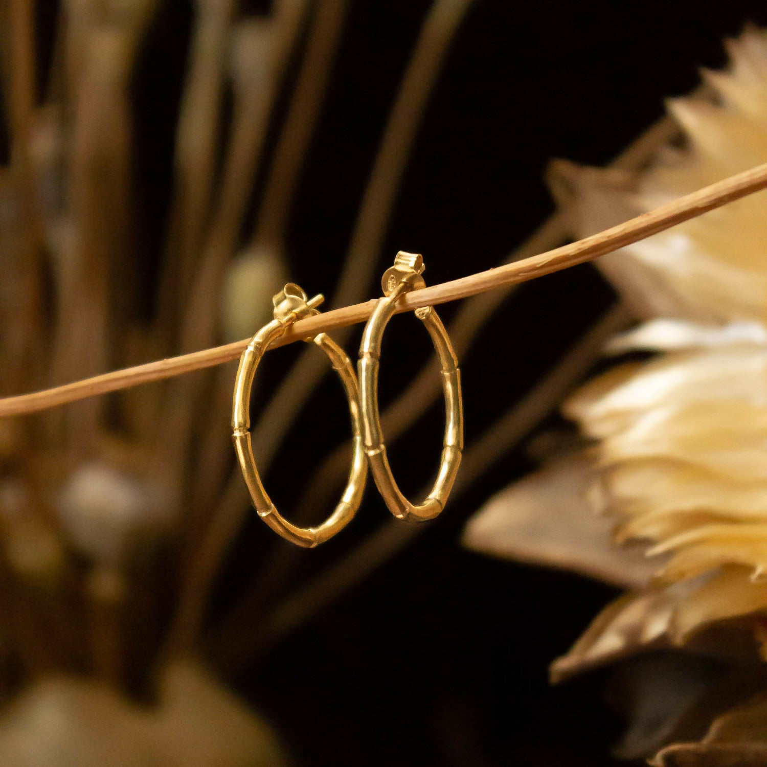 Aros de tipo argolla inspirados en la planta de bamboo. Pertenecen a la colección Flora, están hechos a mano construidos a partir de distintas técnicas en metal. Hechos en plata 950 y enchapados en oro.