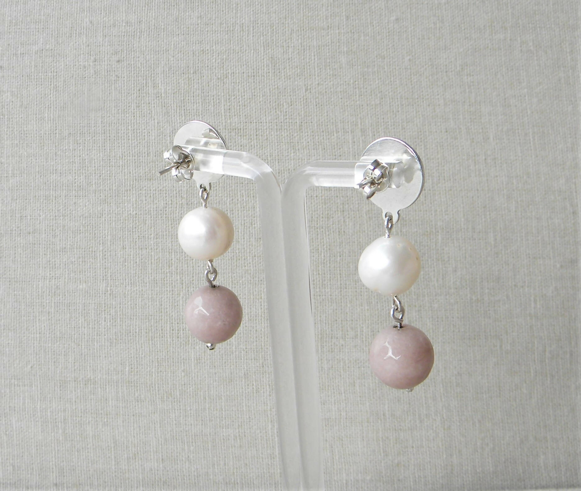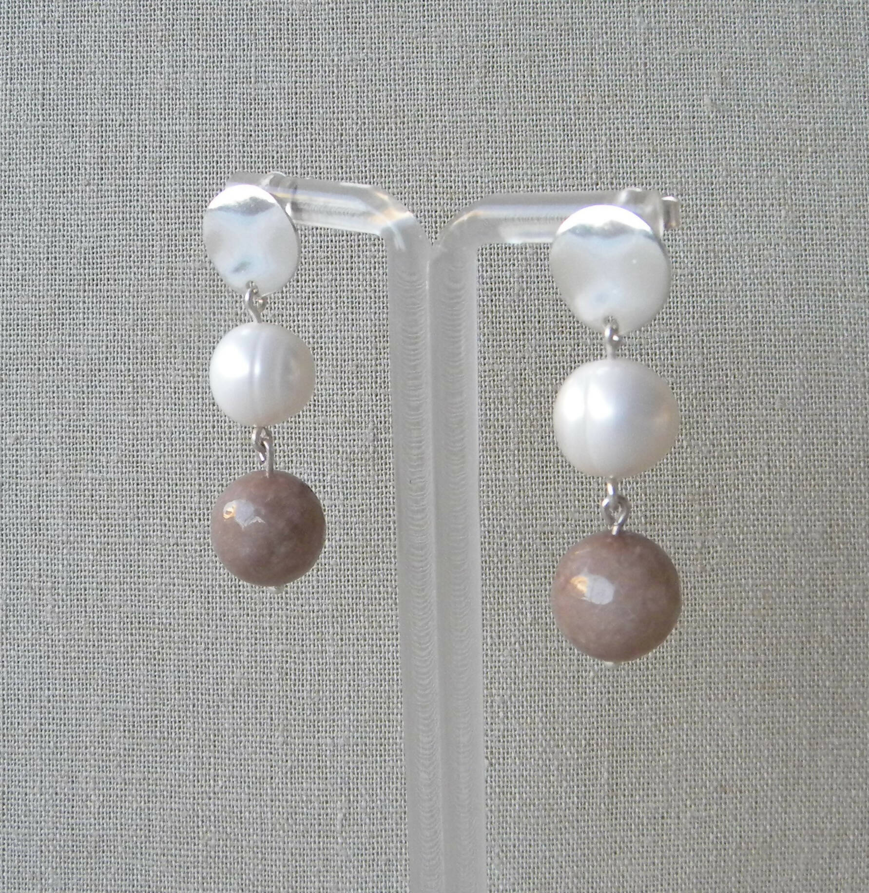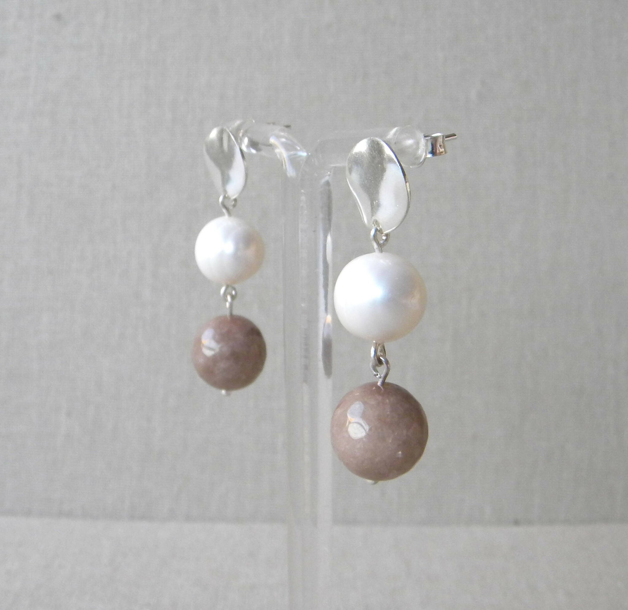 Estos aros tienen una base redonda ondeada de plata 950 con una perla de río y ágata facetada color topo (tono gris beige), ambas piedras semipreciosas son de tamaño grande de 1cm de diámetro aproximadamente. Tienen por detrás un palo y tuerca de plata.